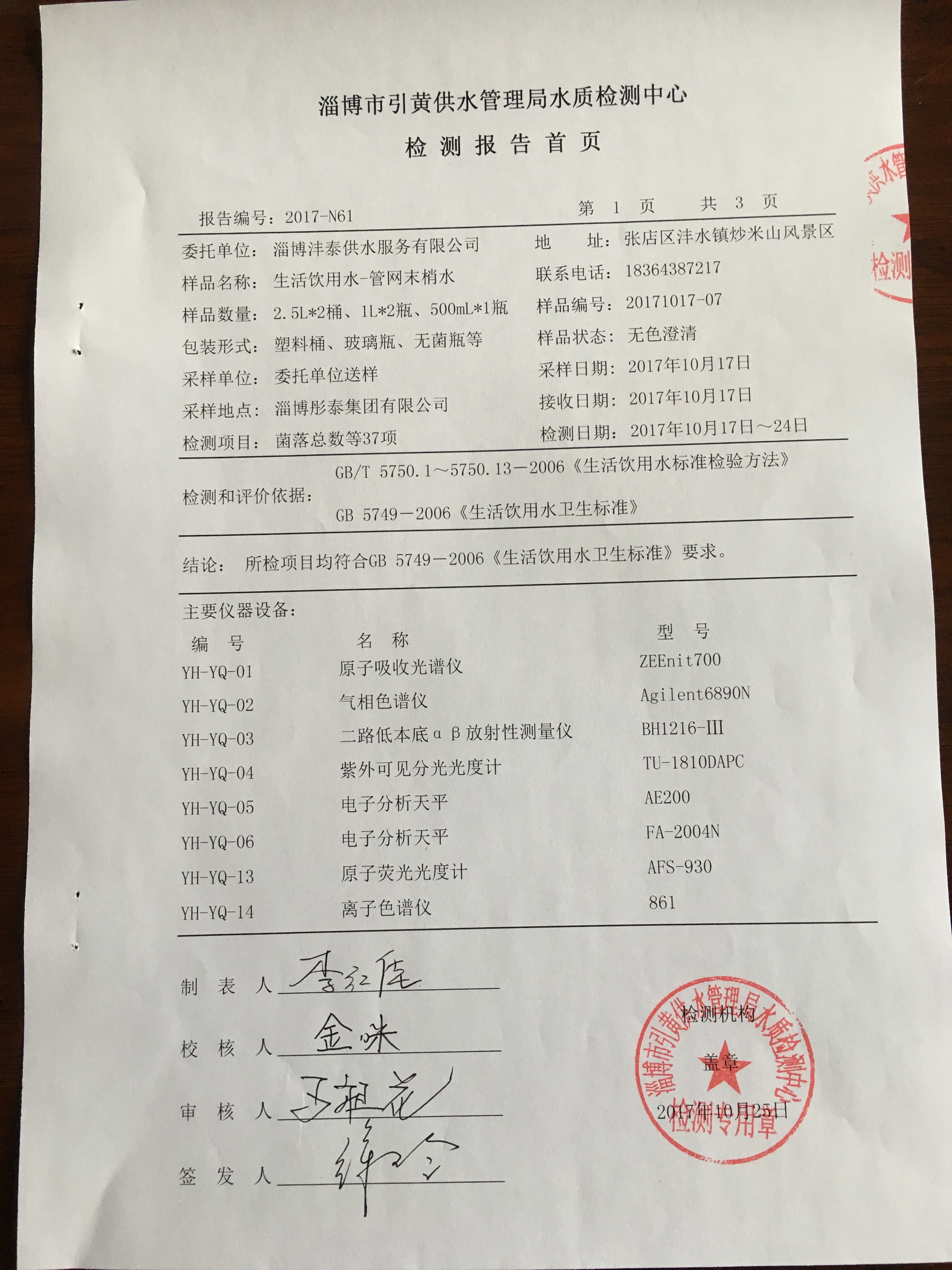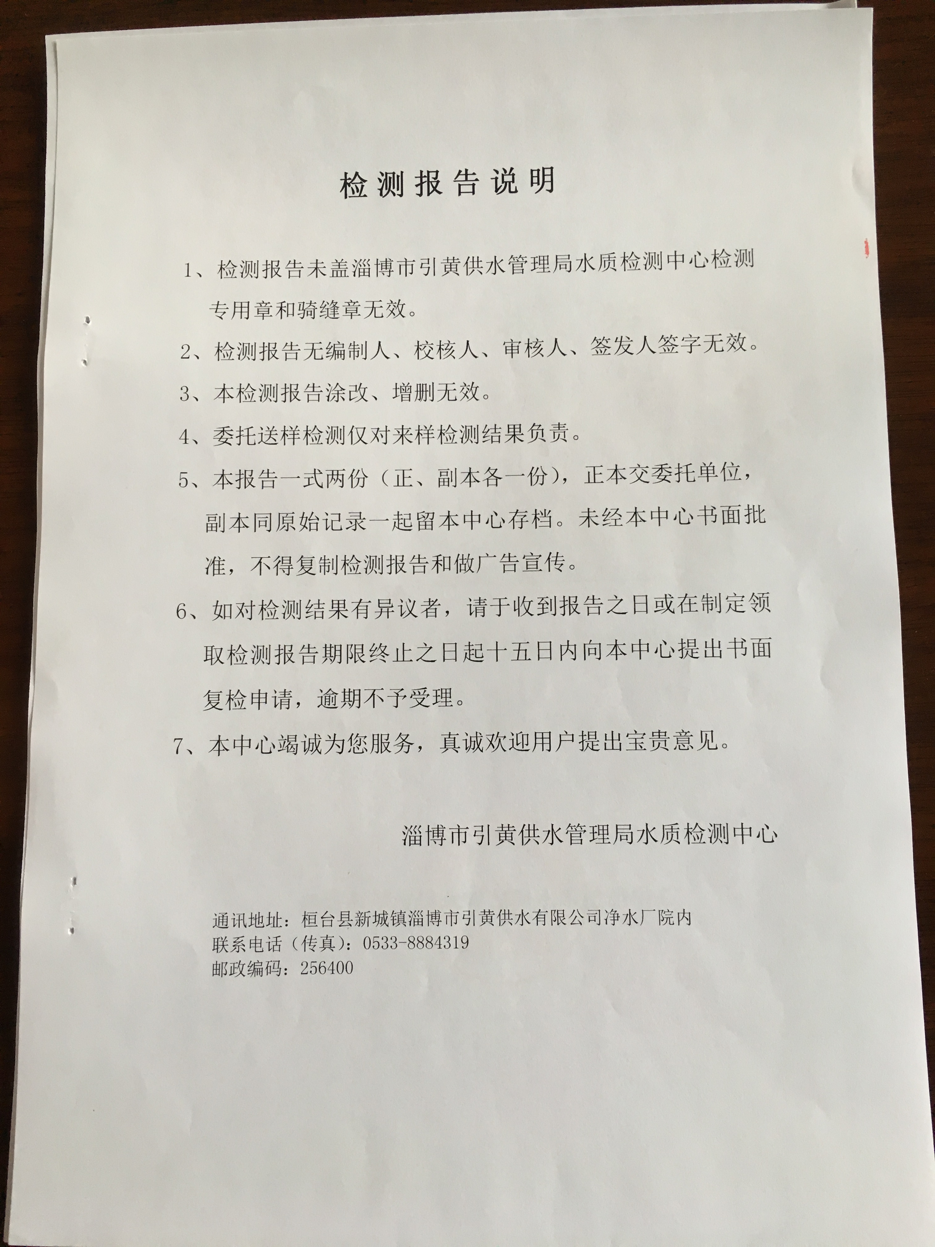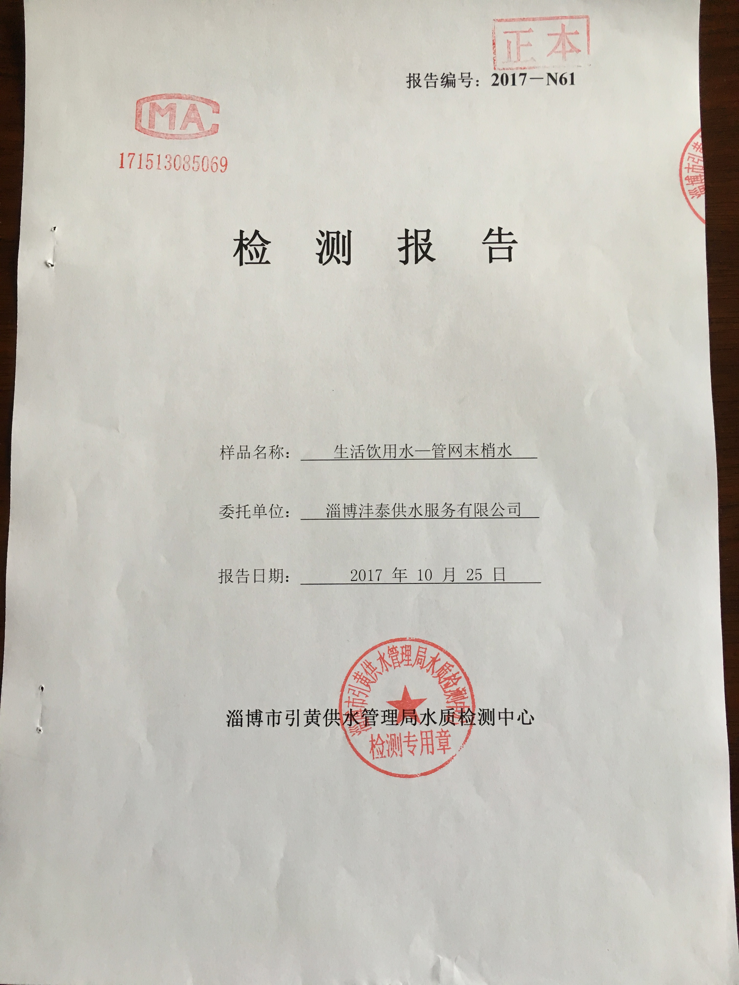 淄博灃泰供水服務(wù)有限公司管網(wǎng)水檢測月報表