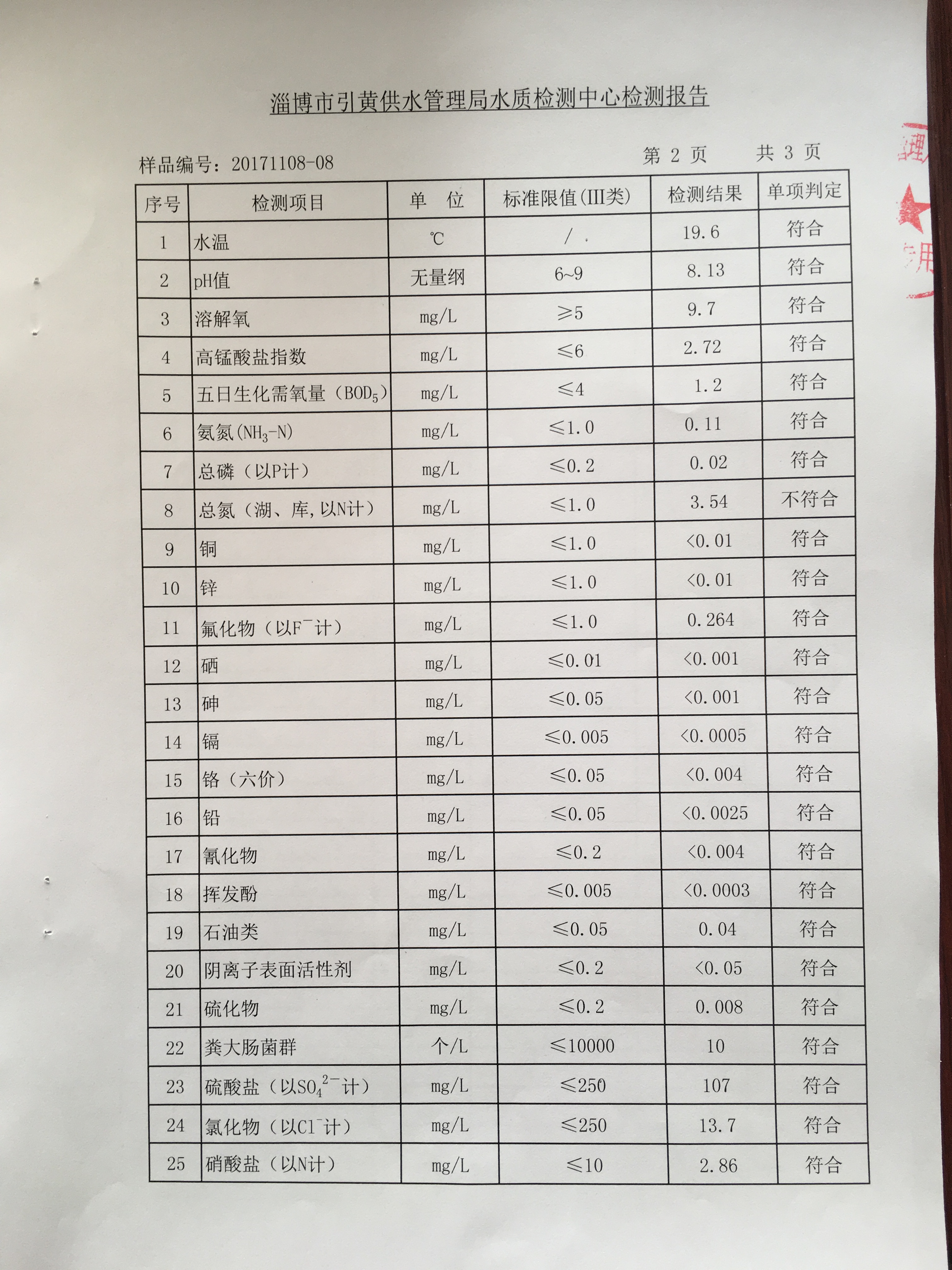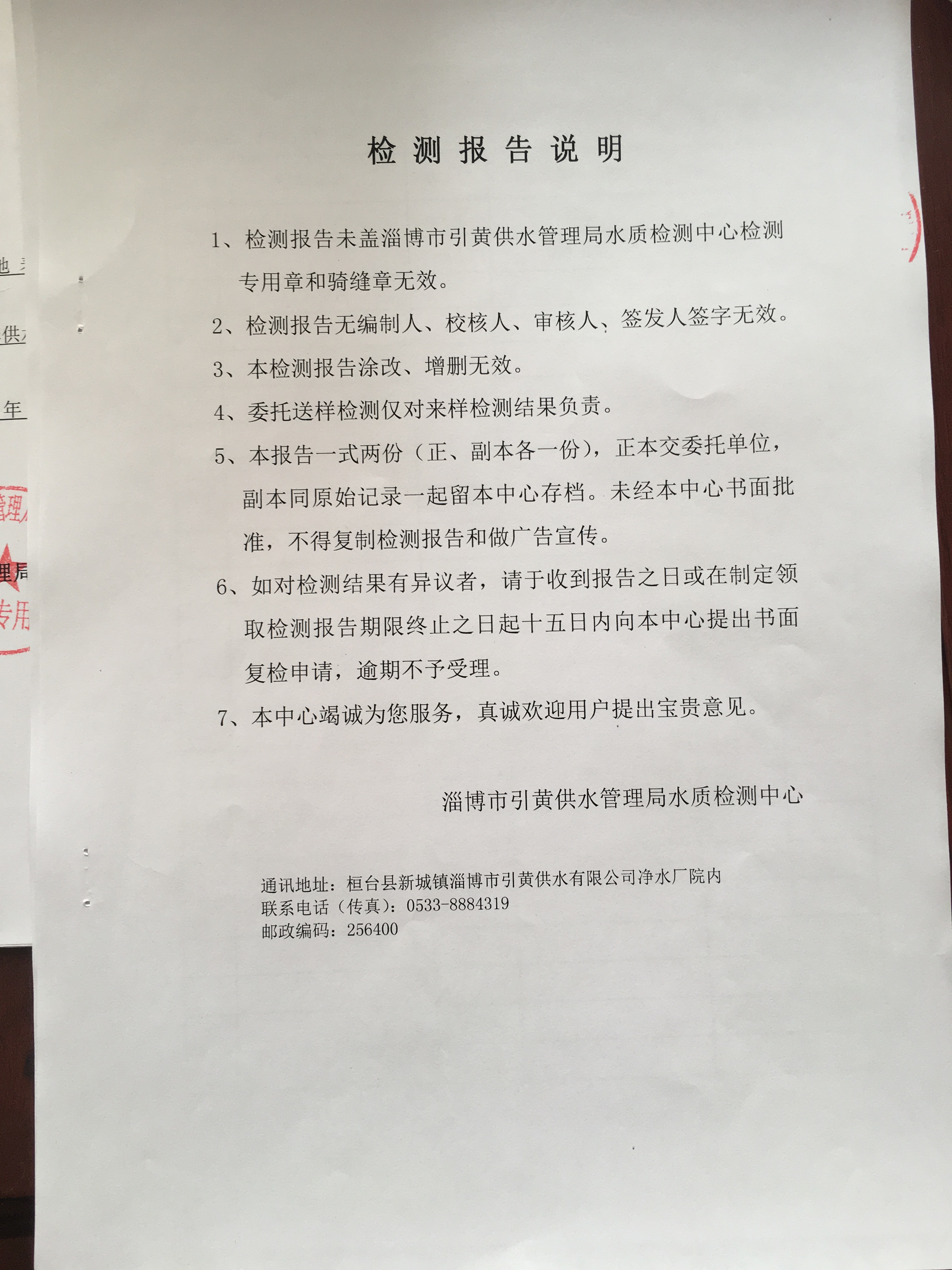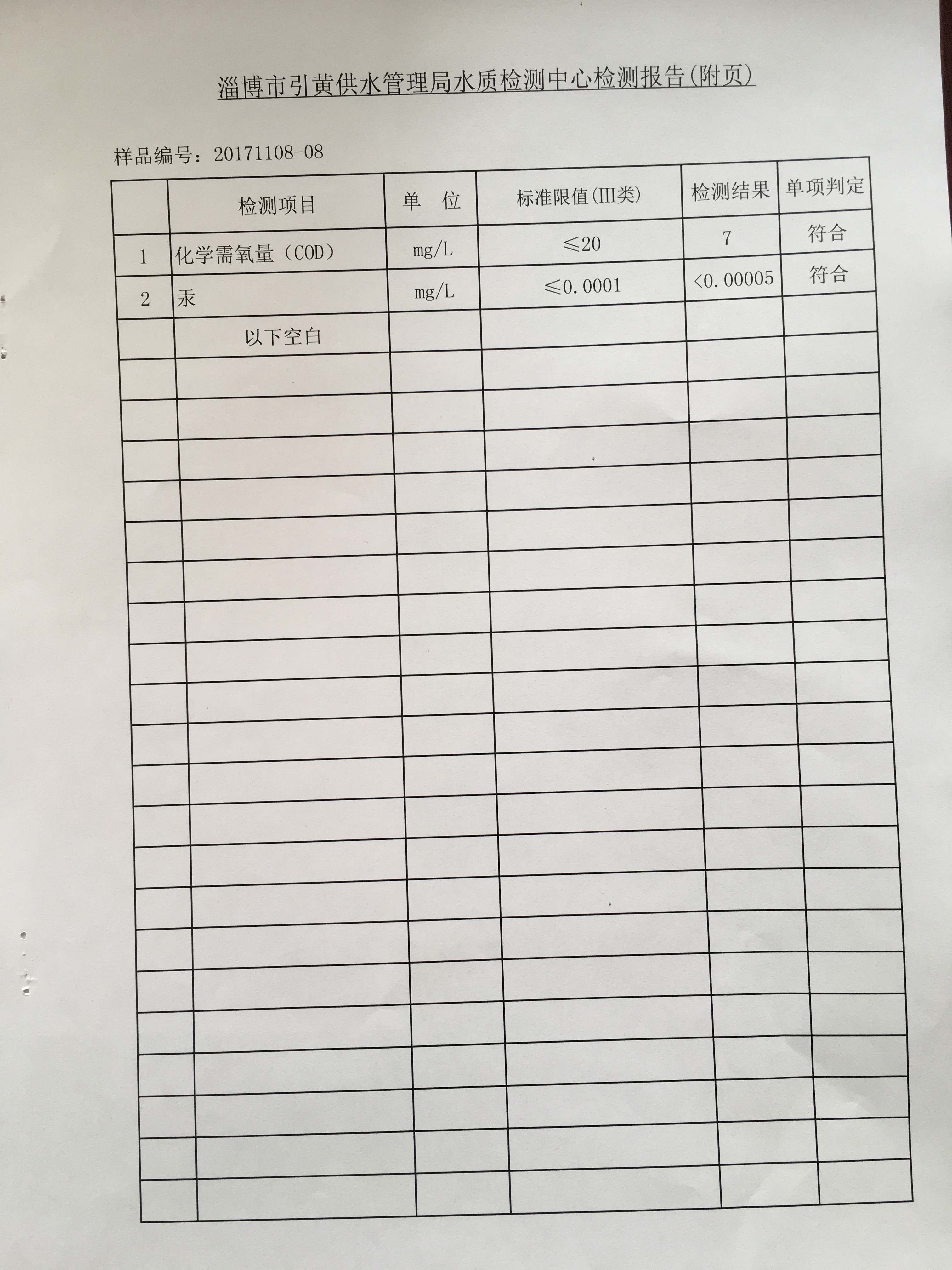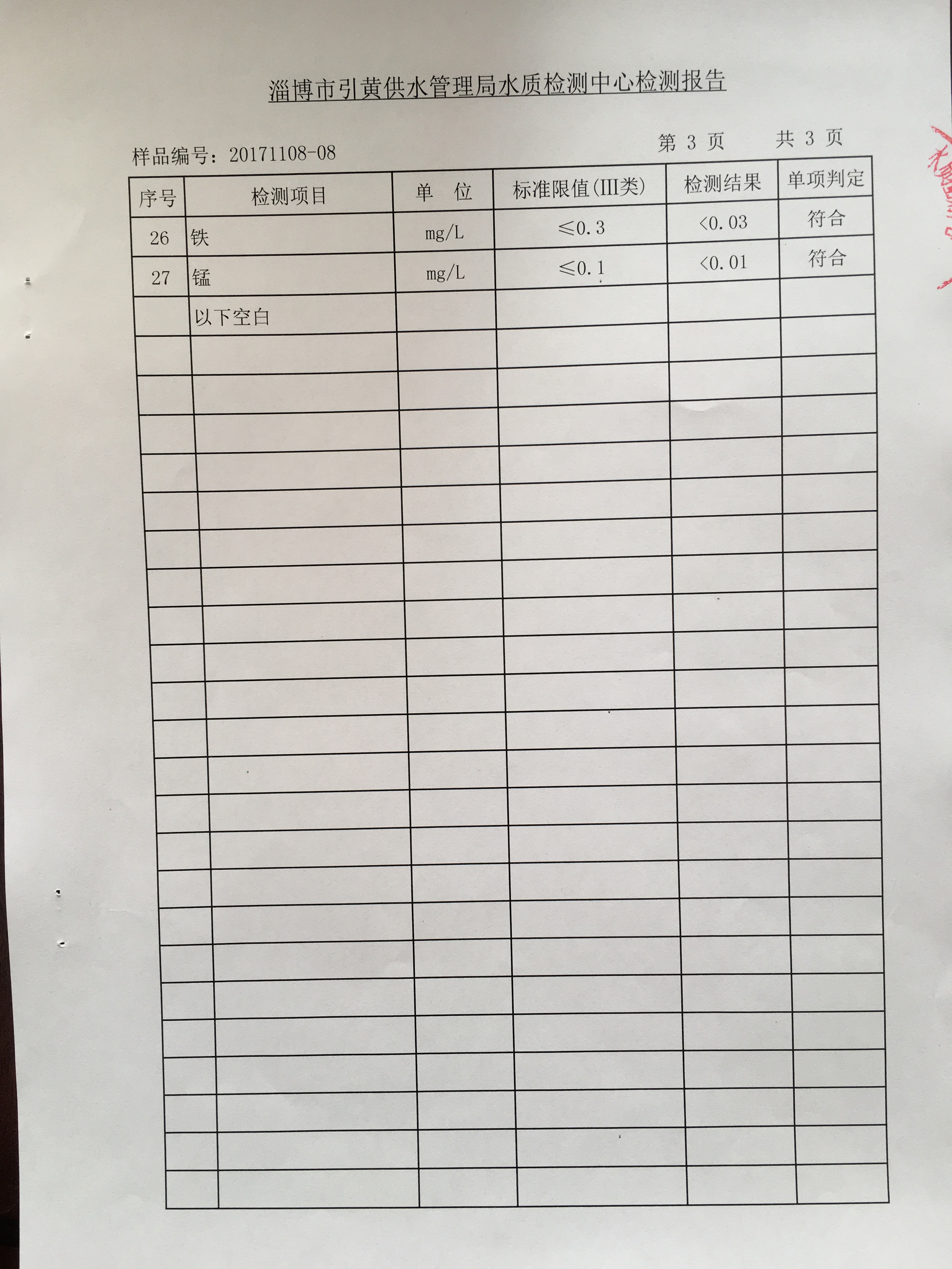 淄博灃泰供水服務(wù)有限公司地表水檢測月報表