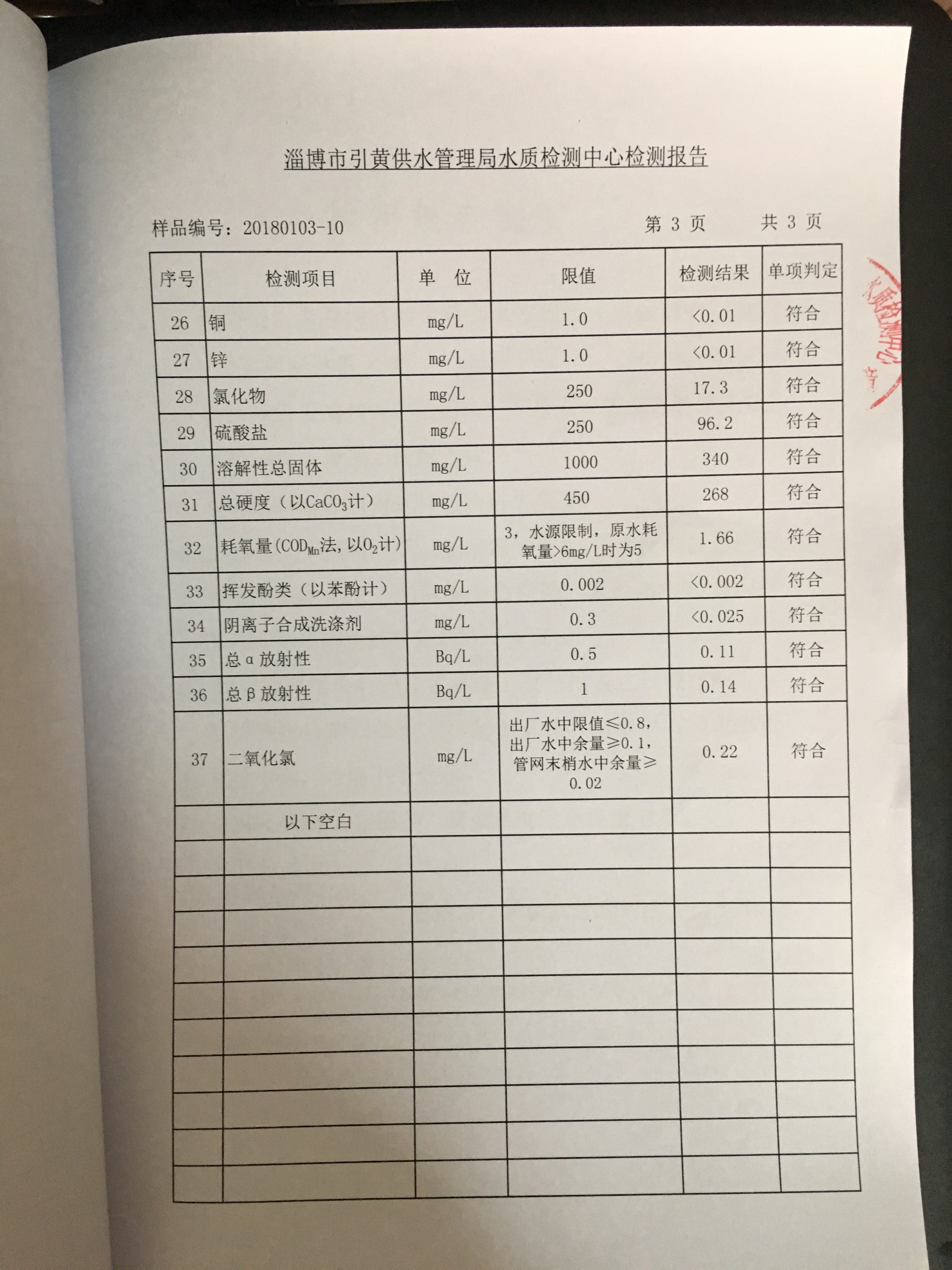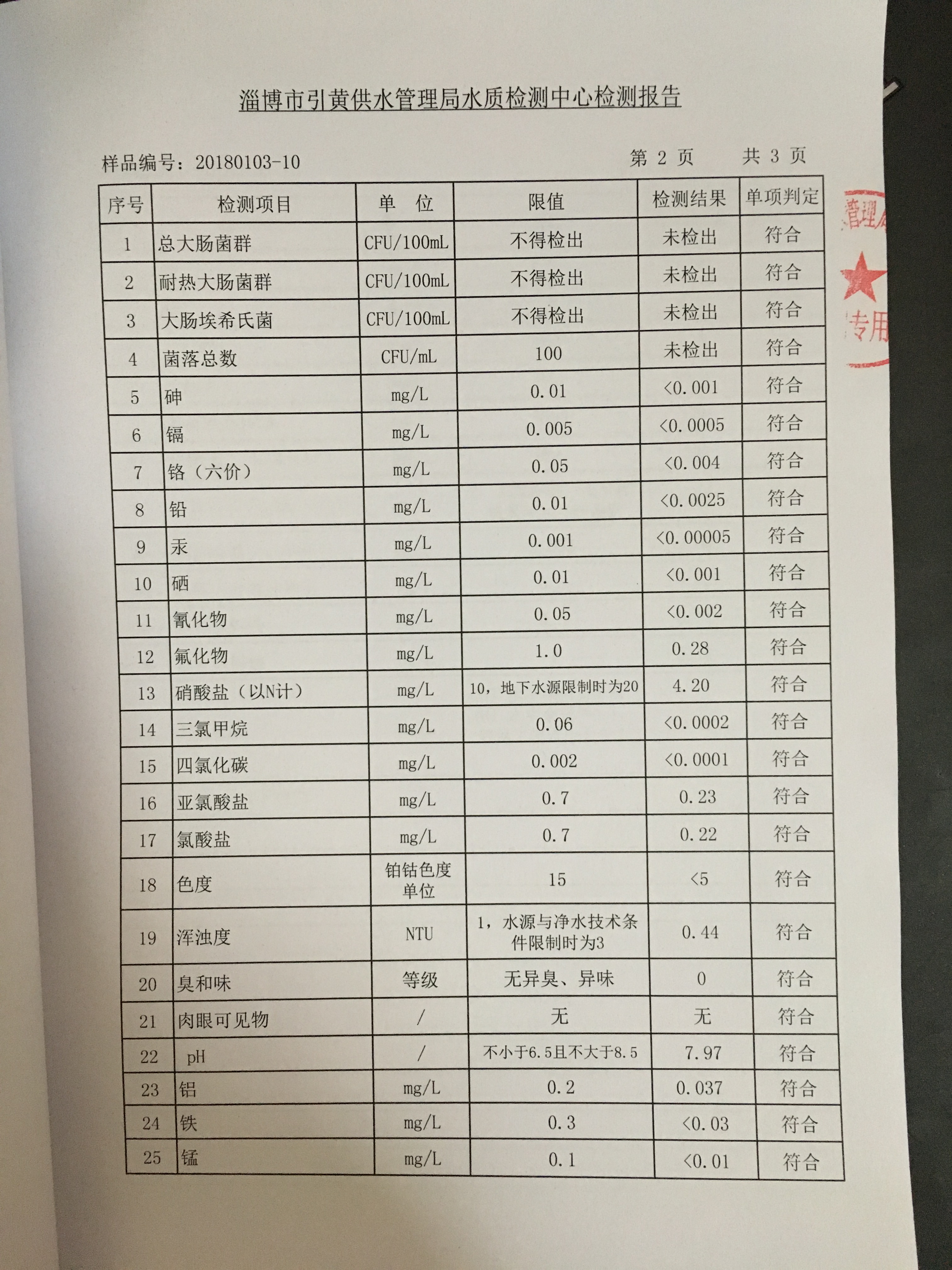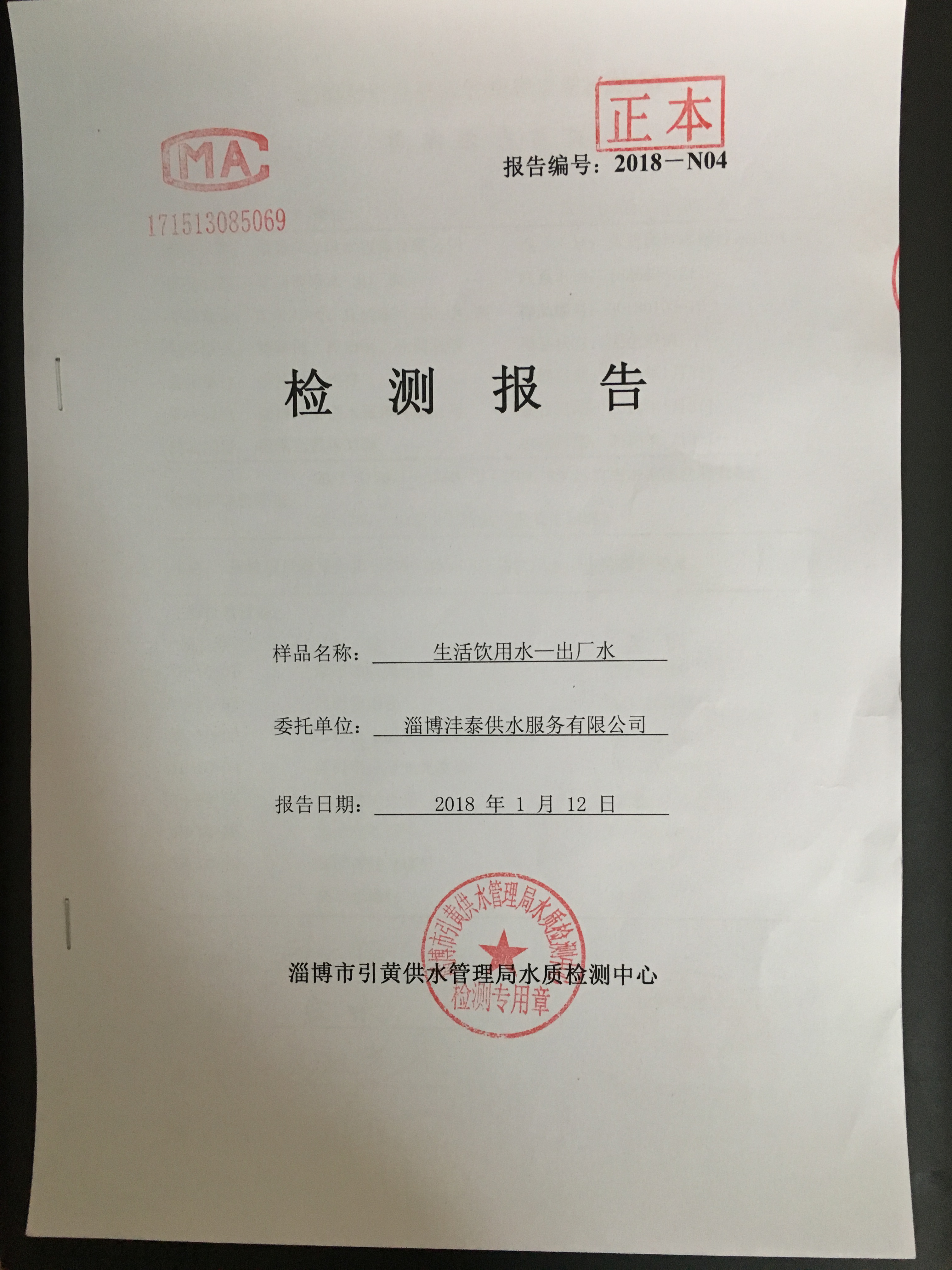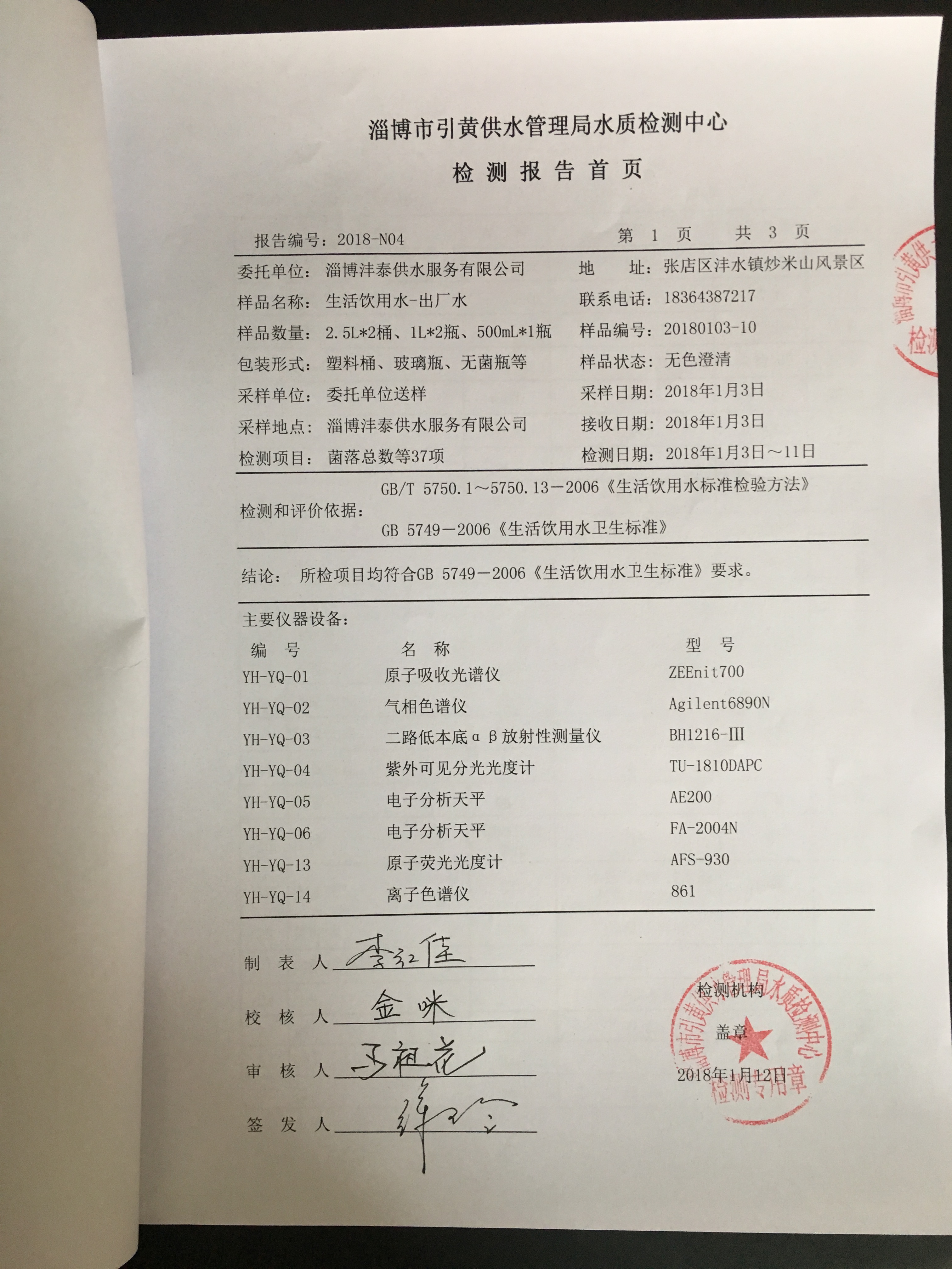 淄博灃泰供水服務有限公司出廠水檢測月報表