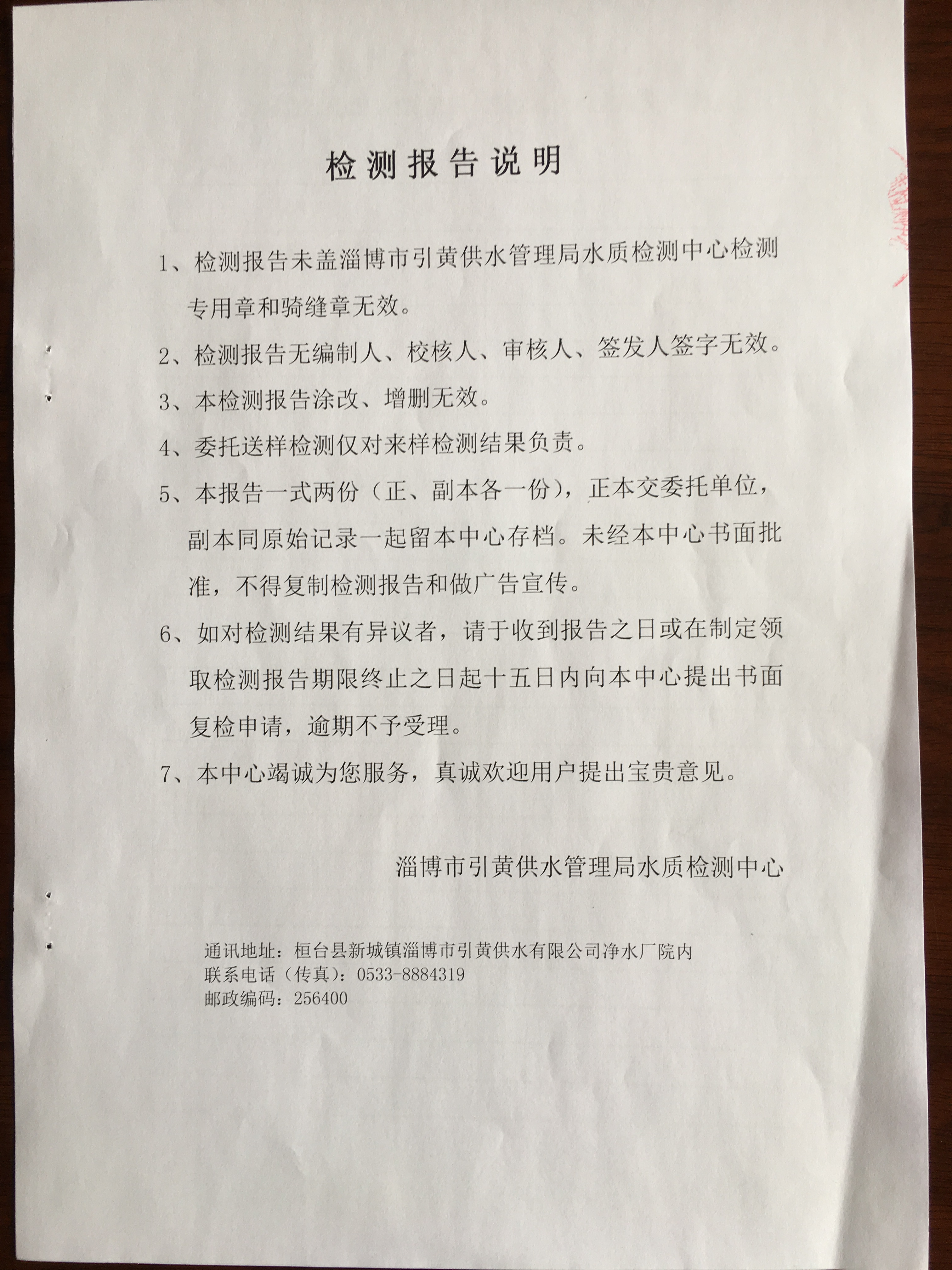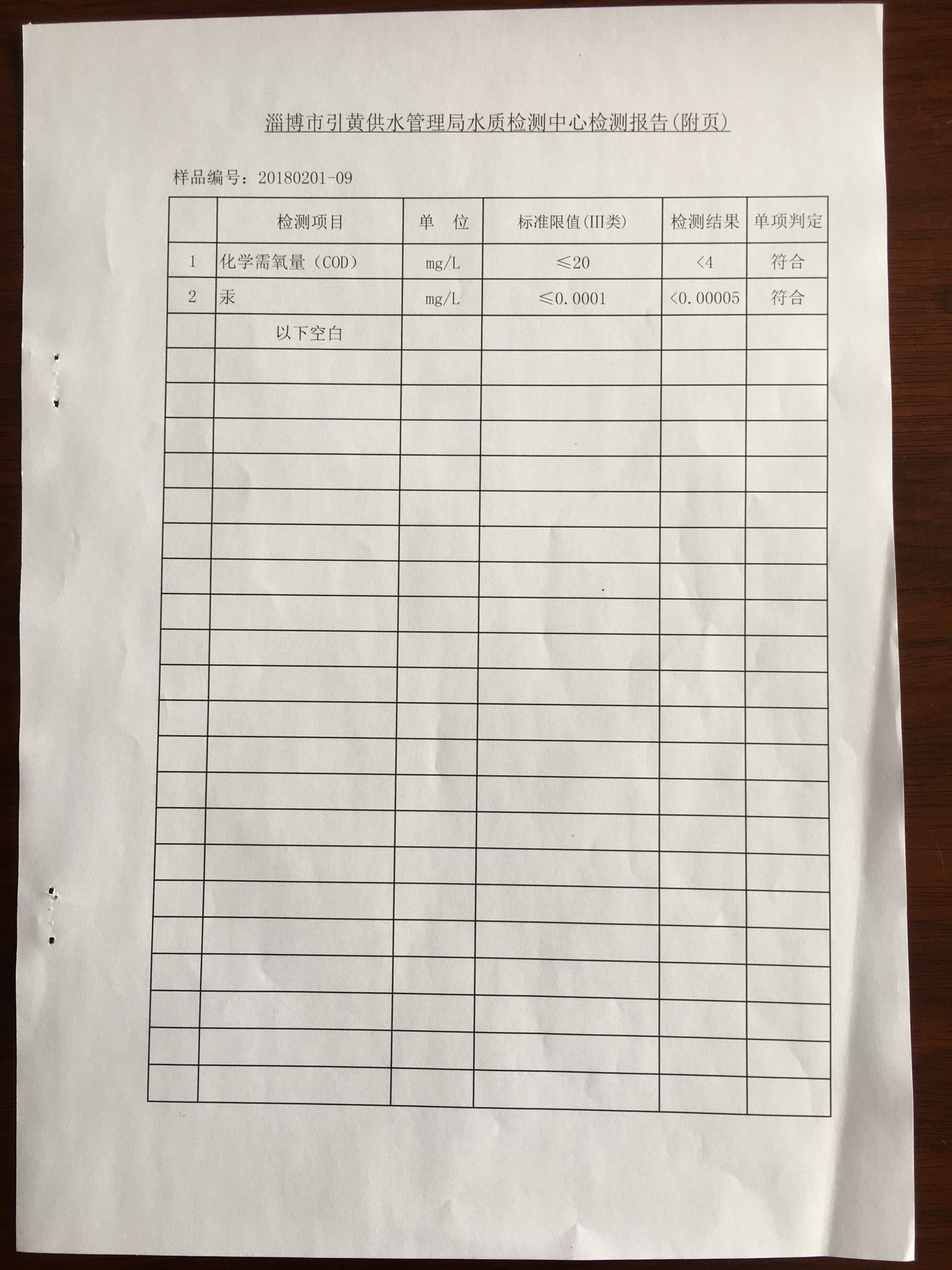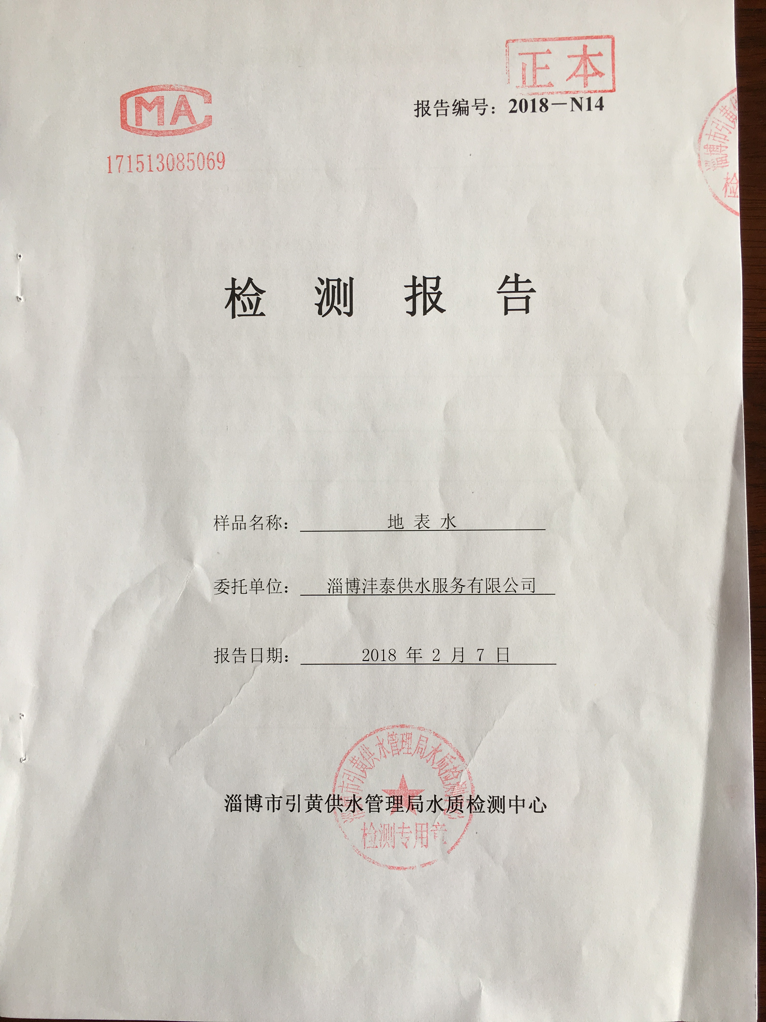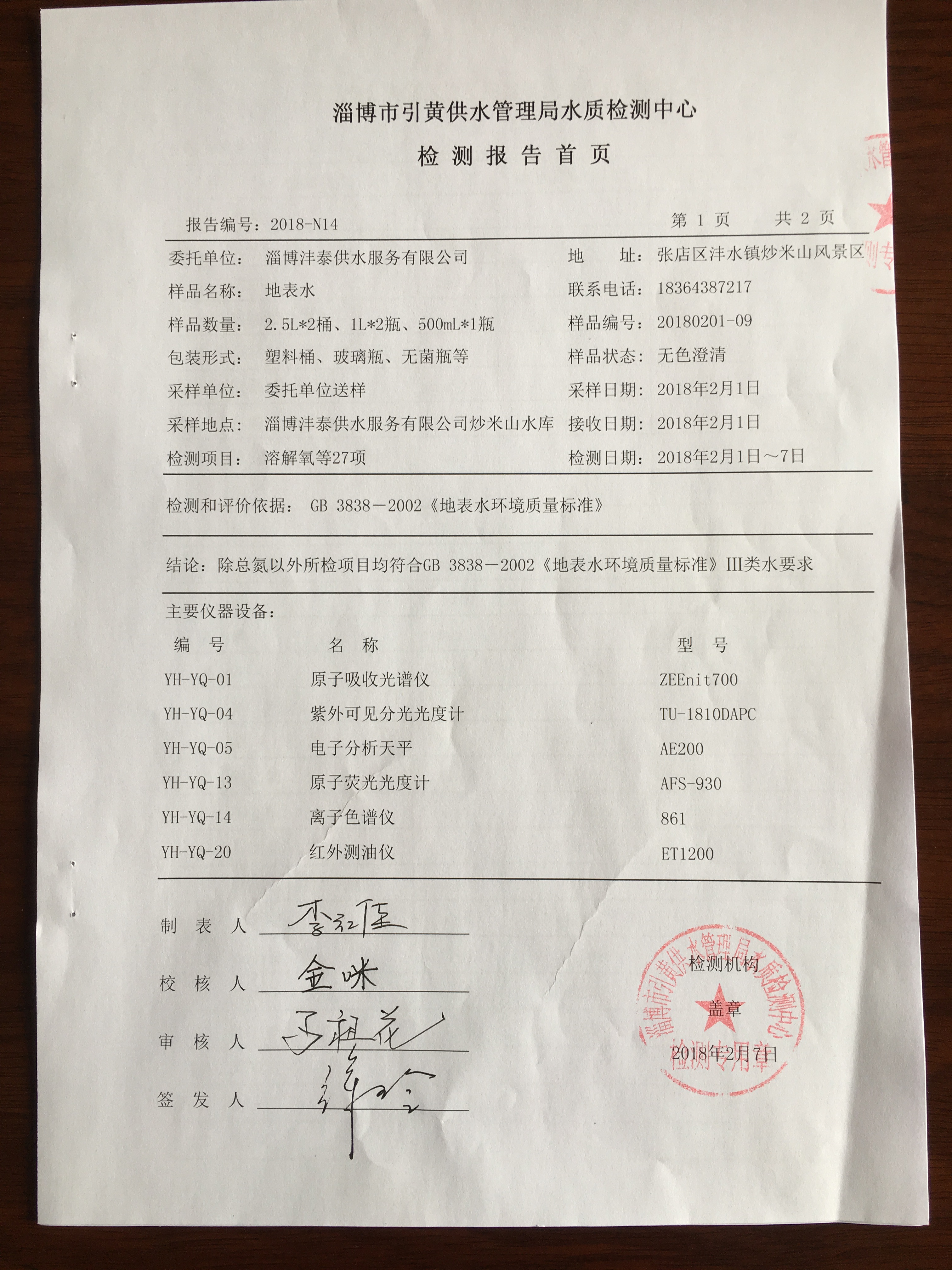 淄博灃泰供水服務(wù)有限公司地表水檢測月報表