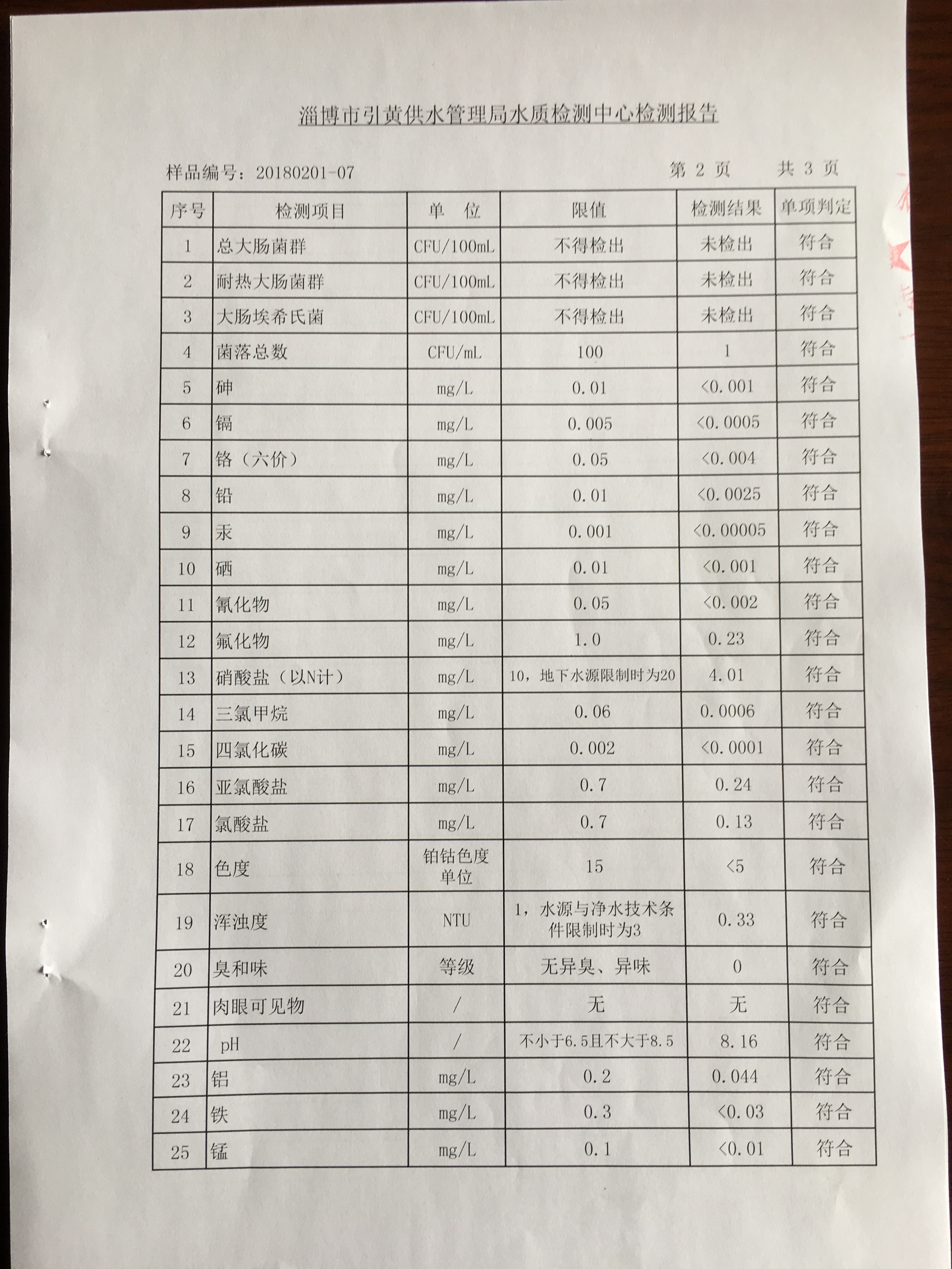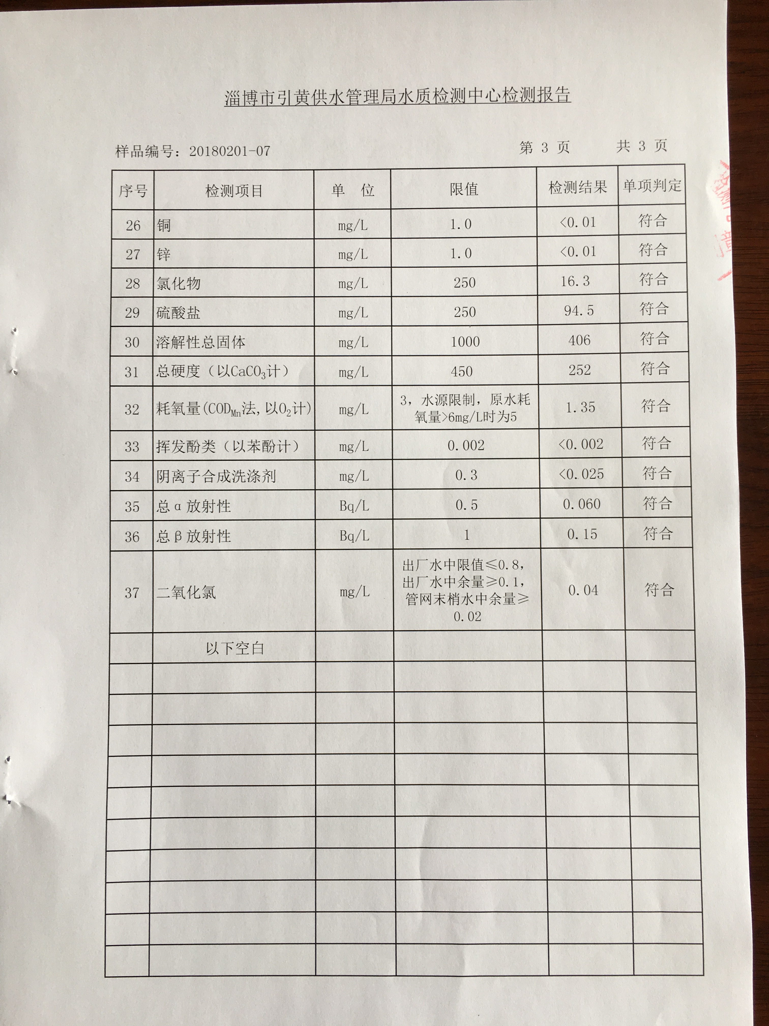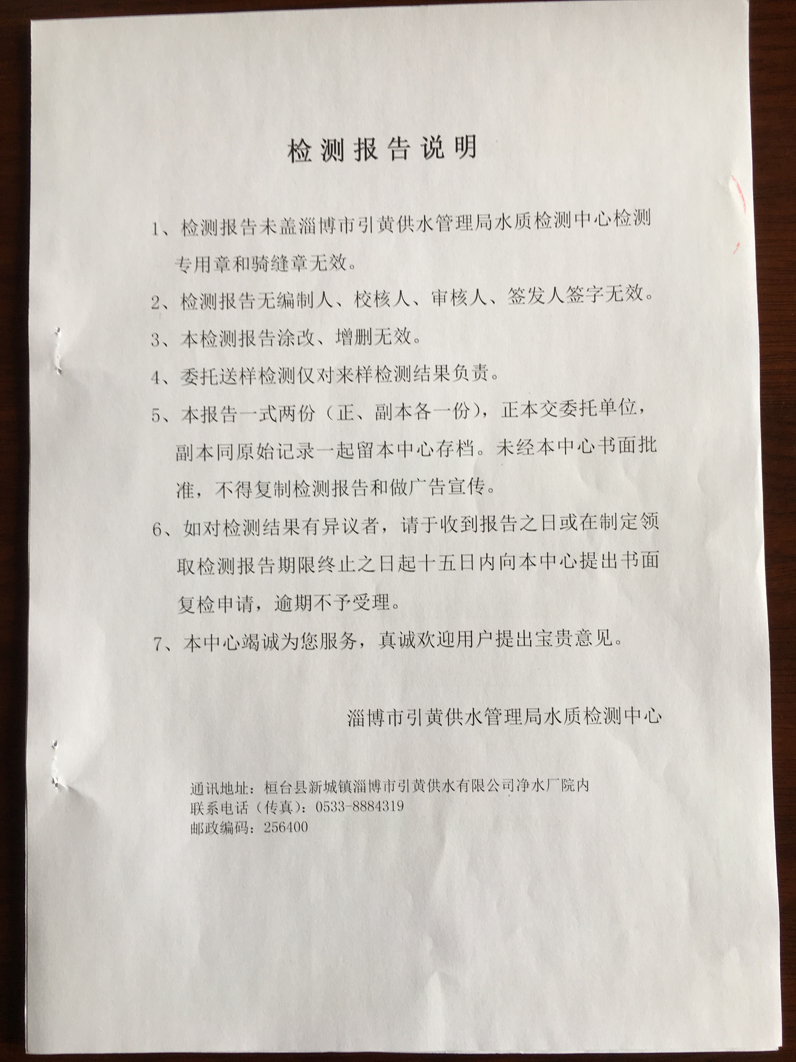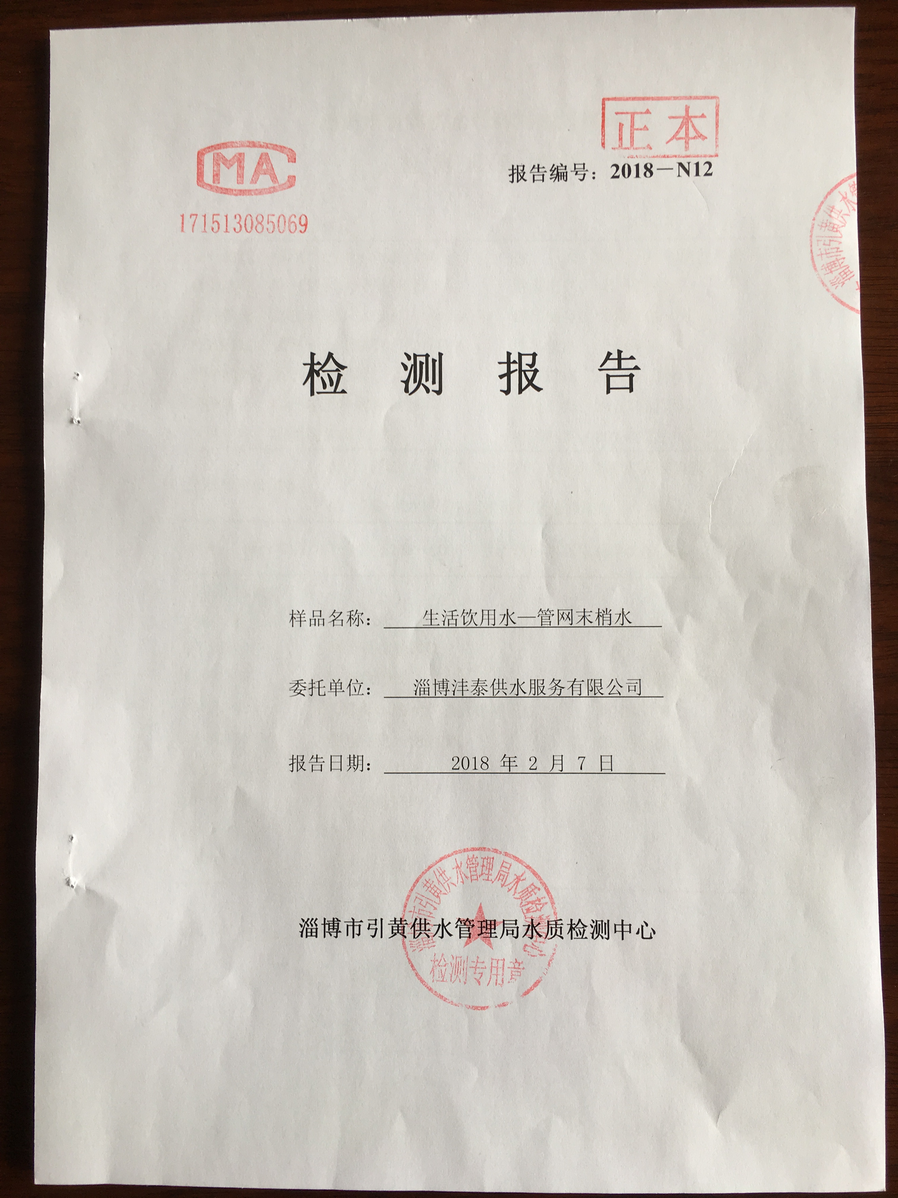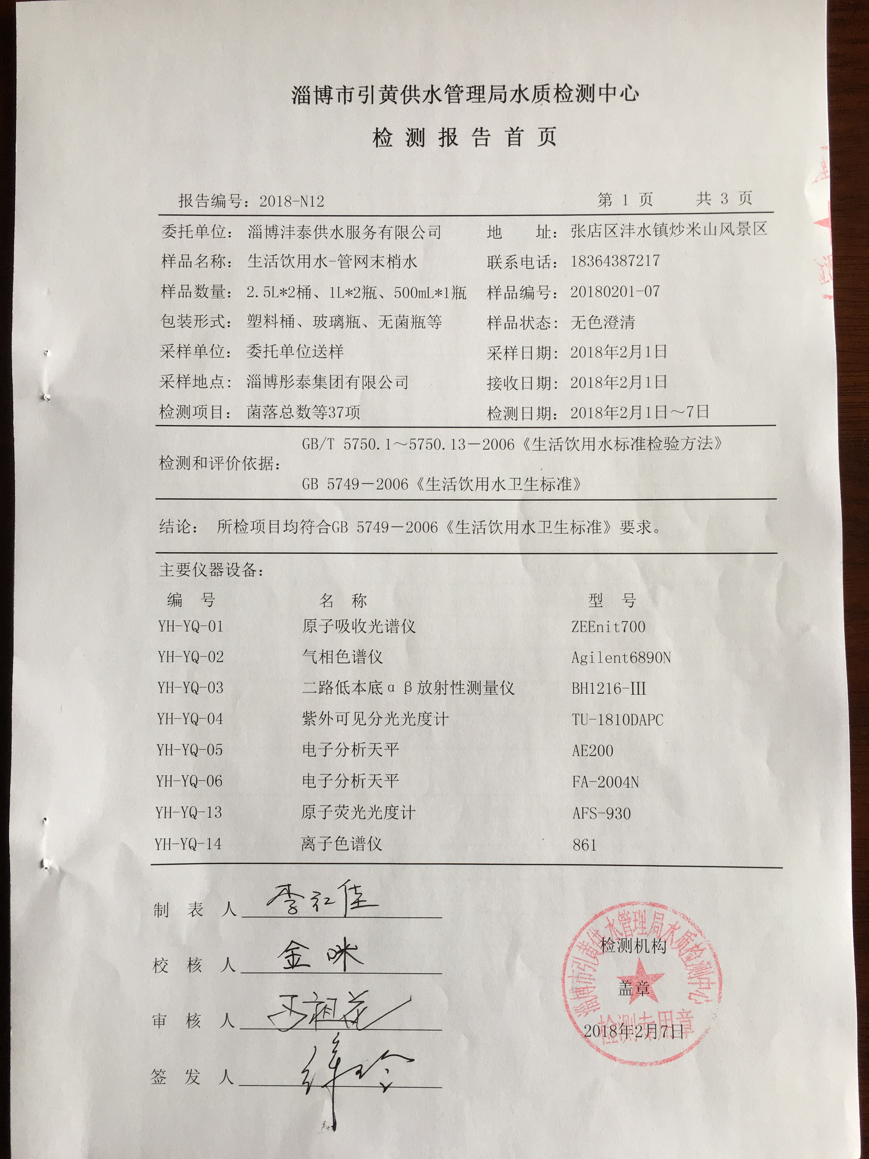 淄博灃泰供水服務(wù)有限公司管網(wǎng)水檢測月報表