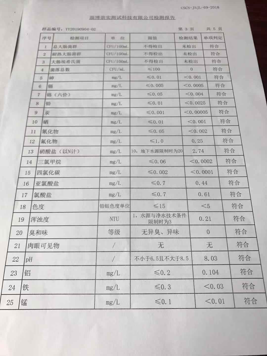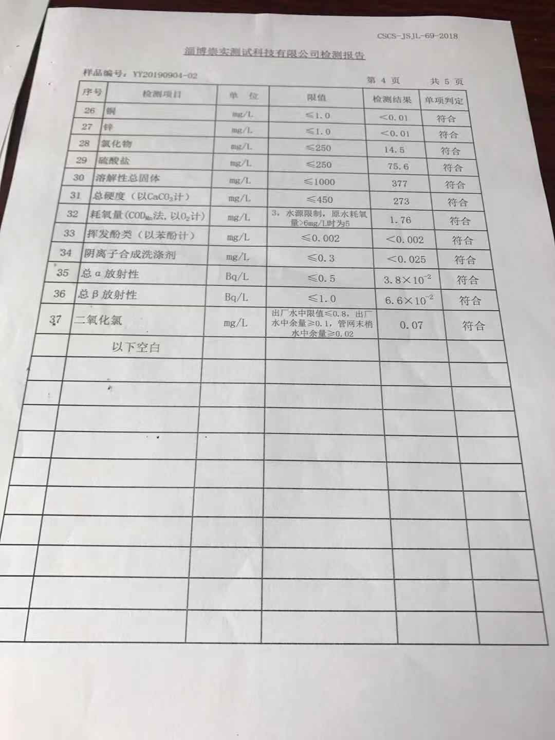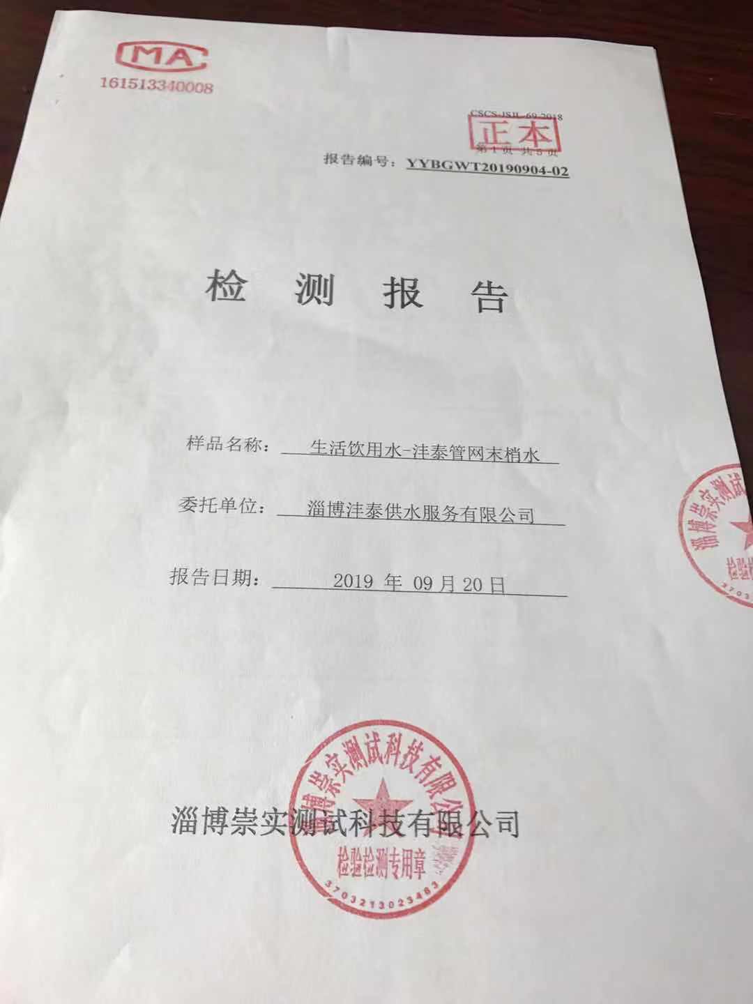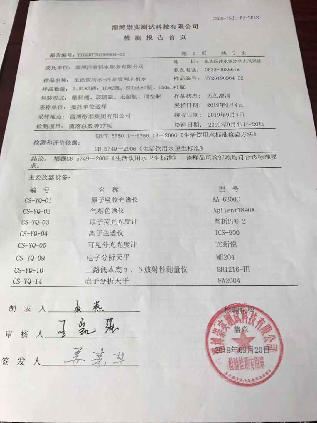 淄博灃泰供水服務(wù)有限公司末梢水月報表
