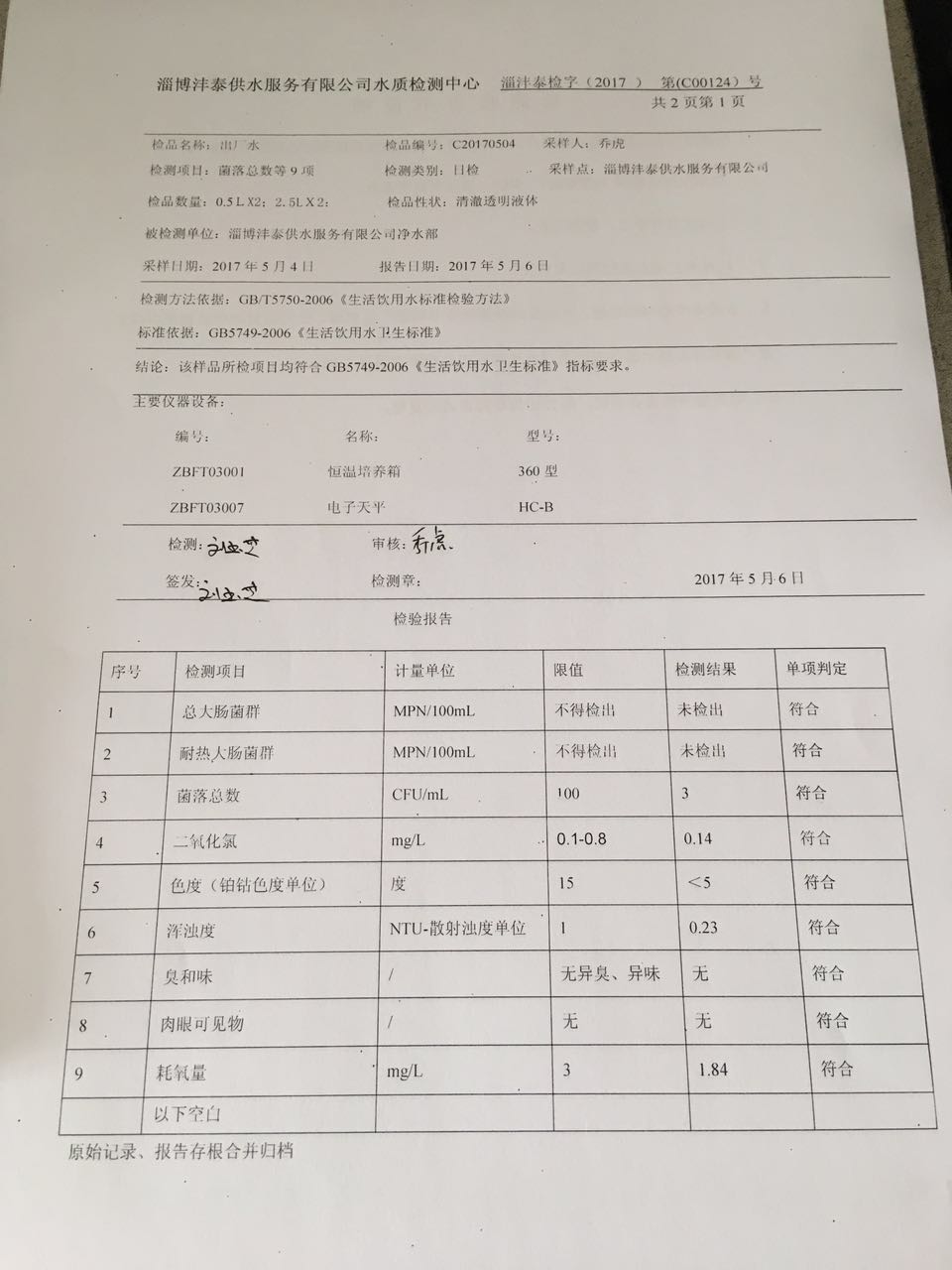 淄博灃泰供水服務(wù)有限公司水質(zhì)檢測日報表