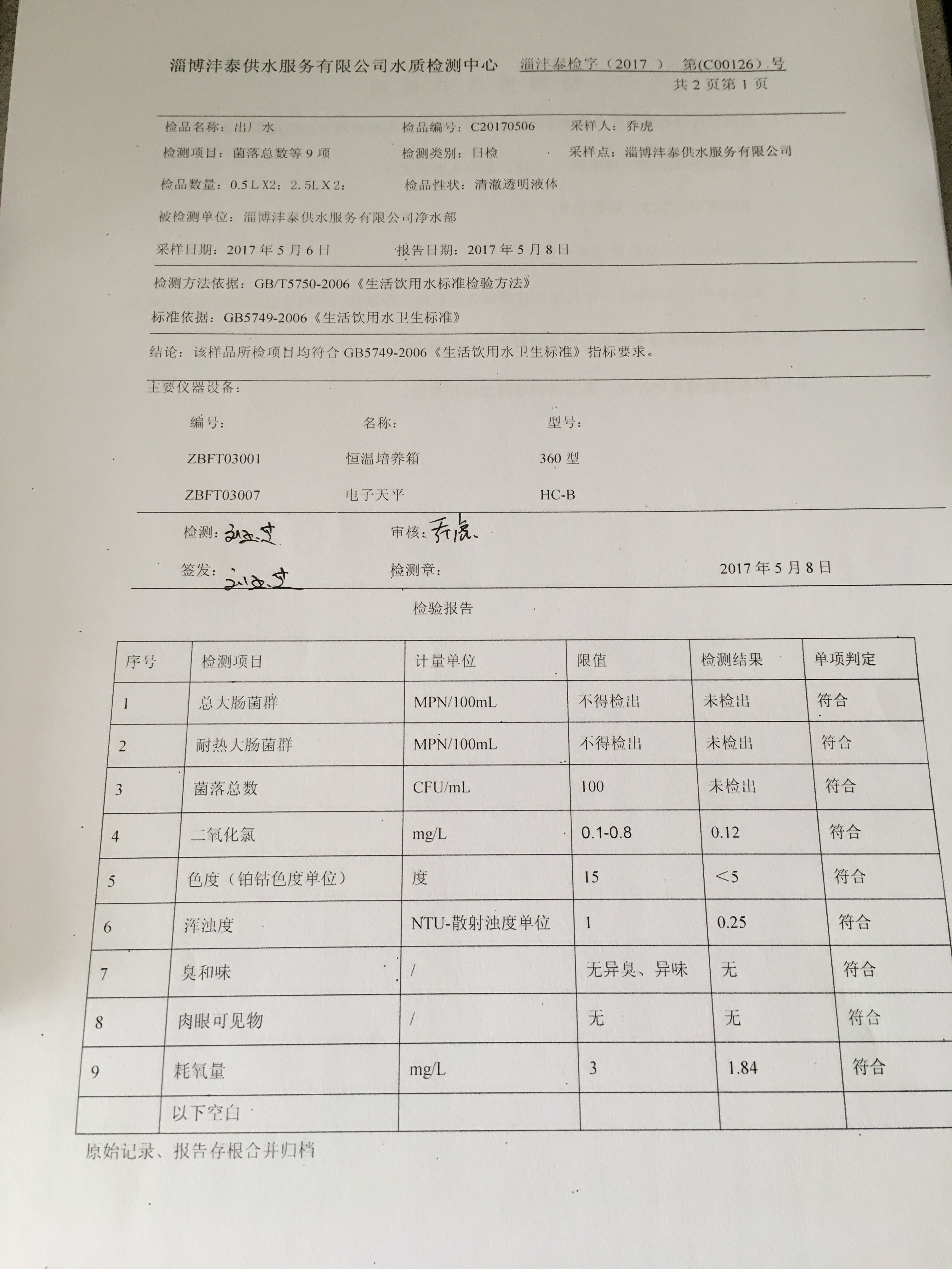 淄博灃泰供水服務(wù)有限公司水質(zhì)檢測日?qǐng)?bào)表
