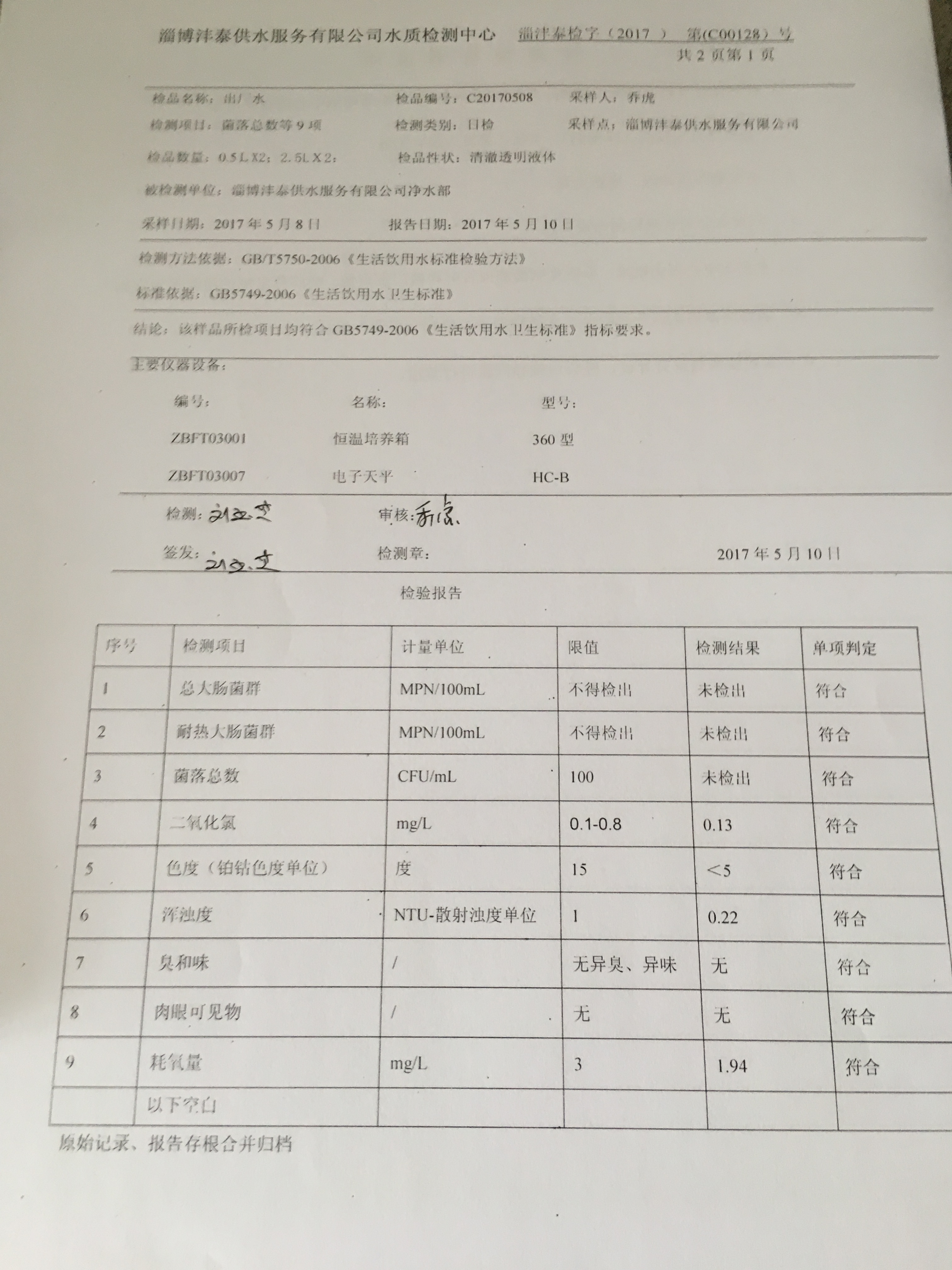 淄博灃泰供水服務(wù)有限公司水質(zhì)檢測日報表
