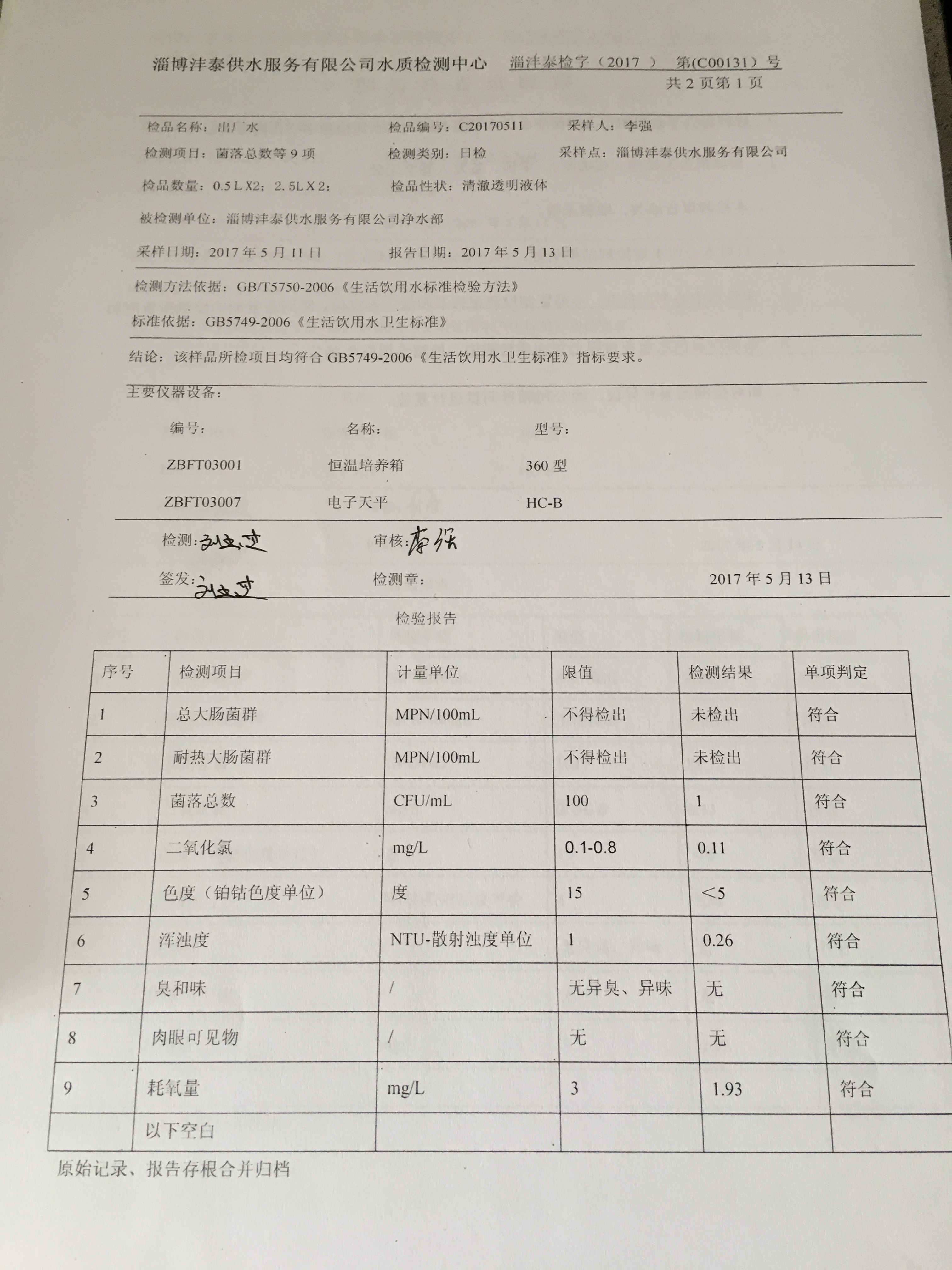 淄博灃泰供水服務(wù)有限公司水質(zhì)檢測日報表