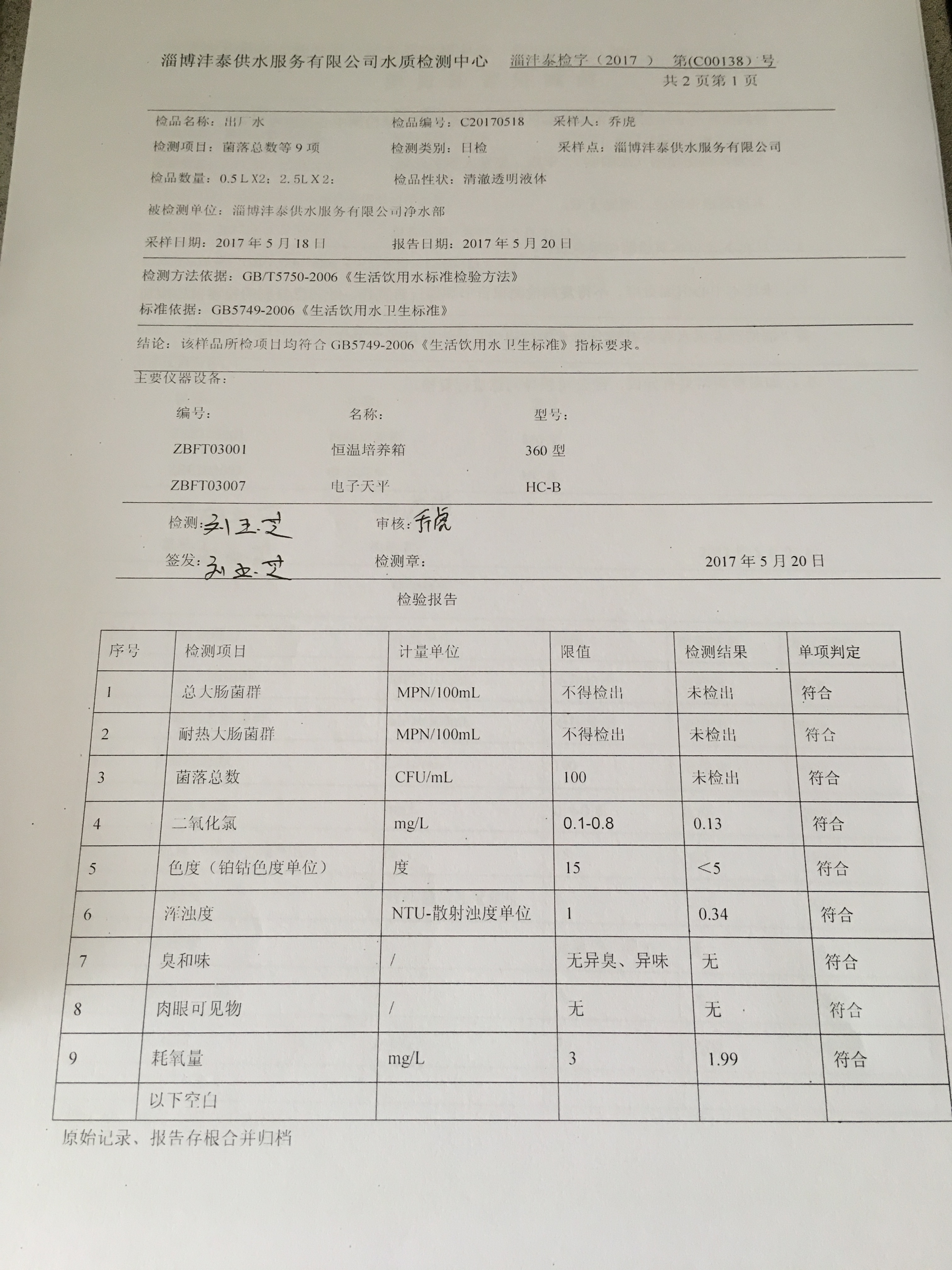 淄博灃泰供水服務(wù)有限公司水質(zhì)檢測(cè)日?qǐng)?bào)表