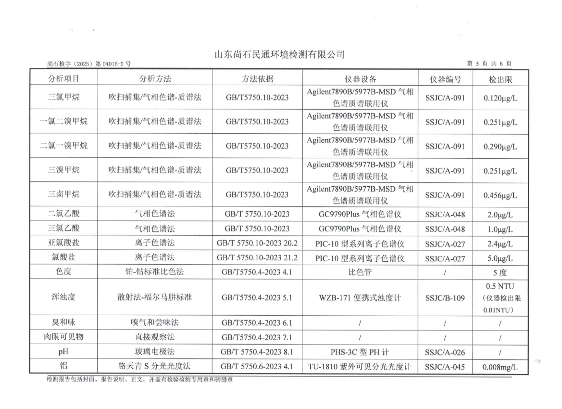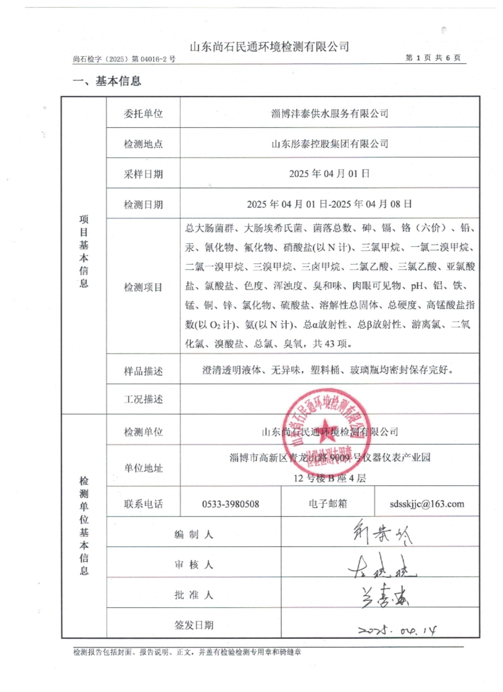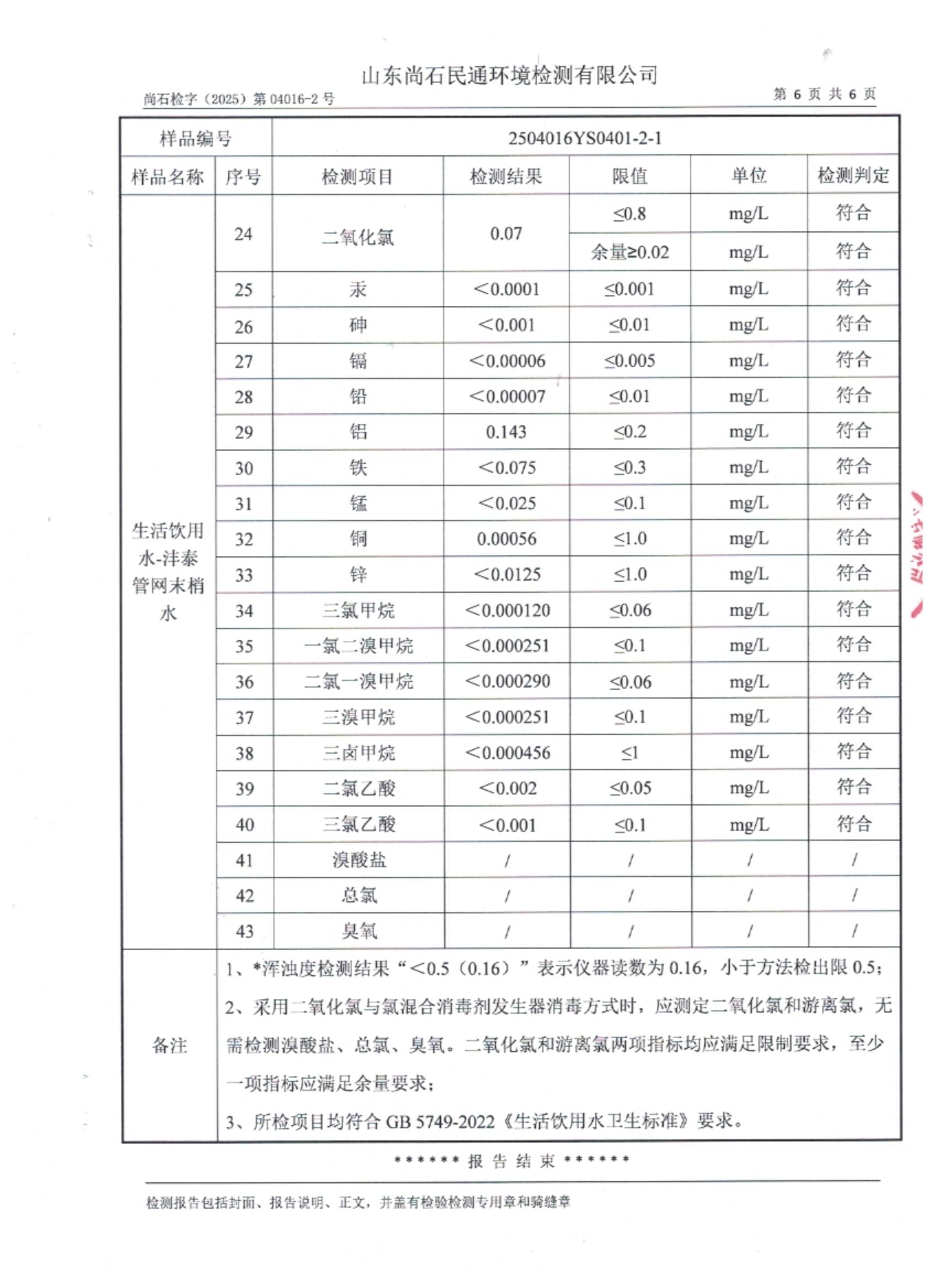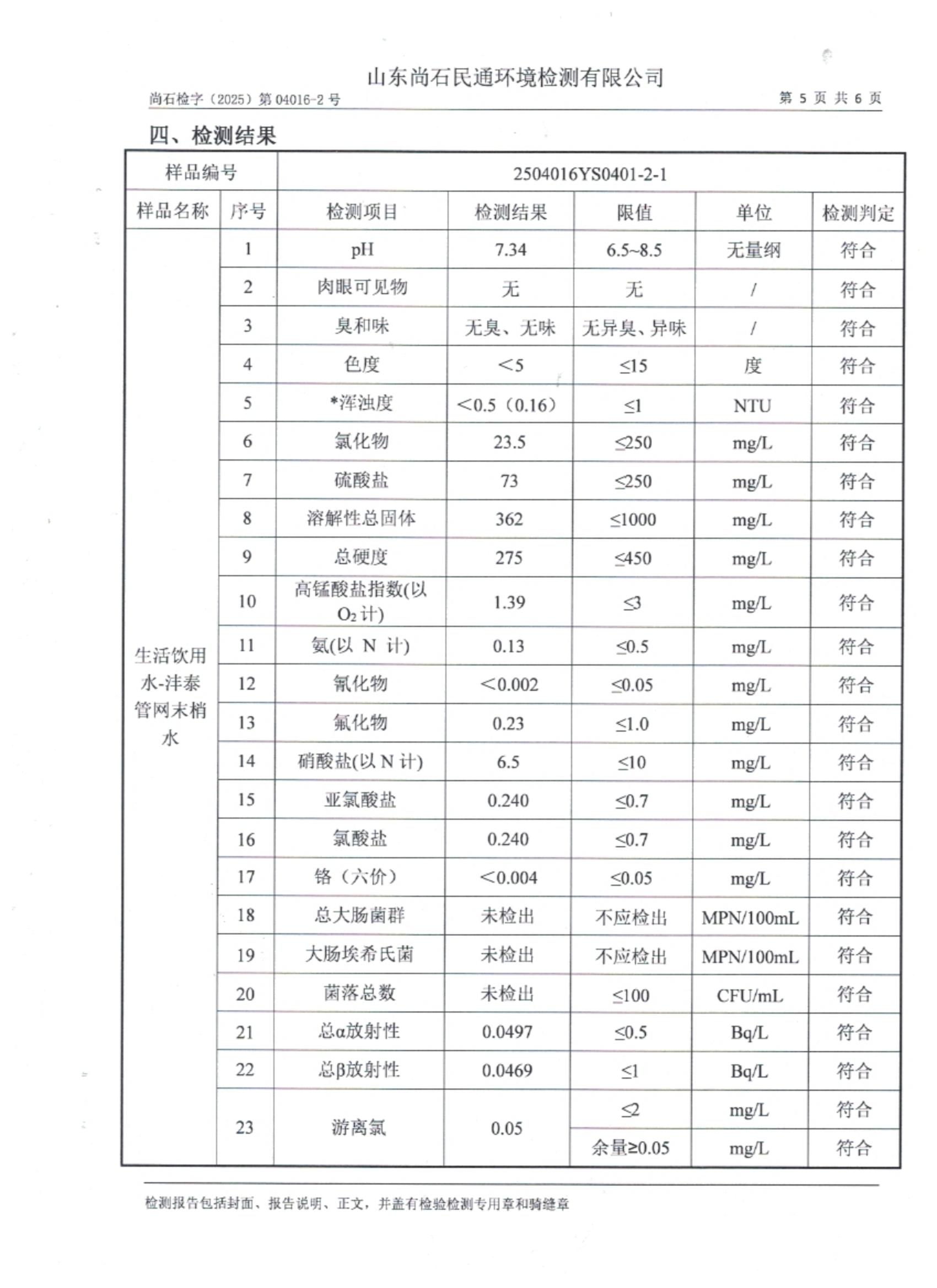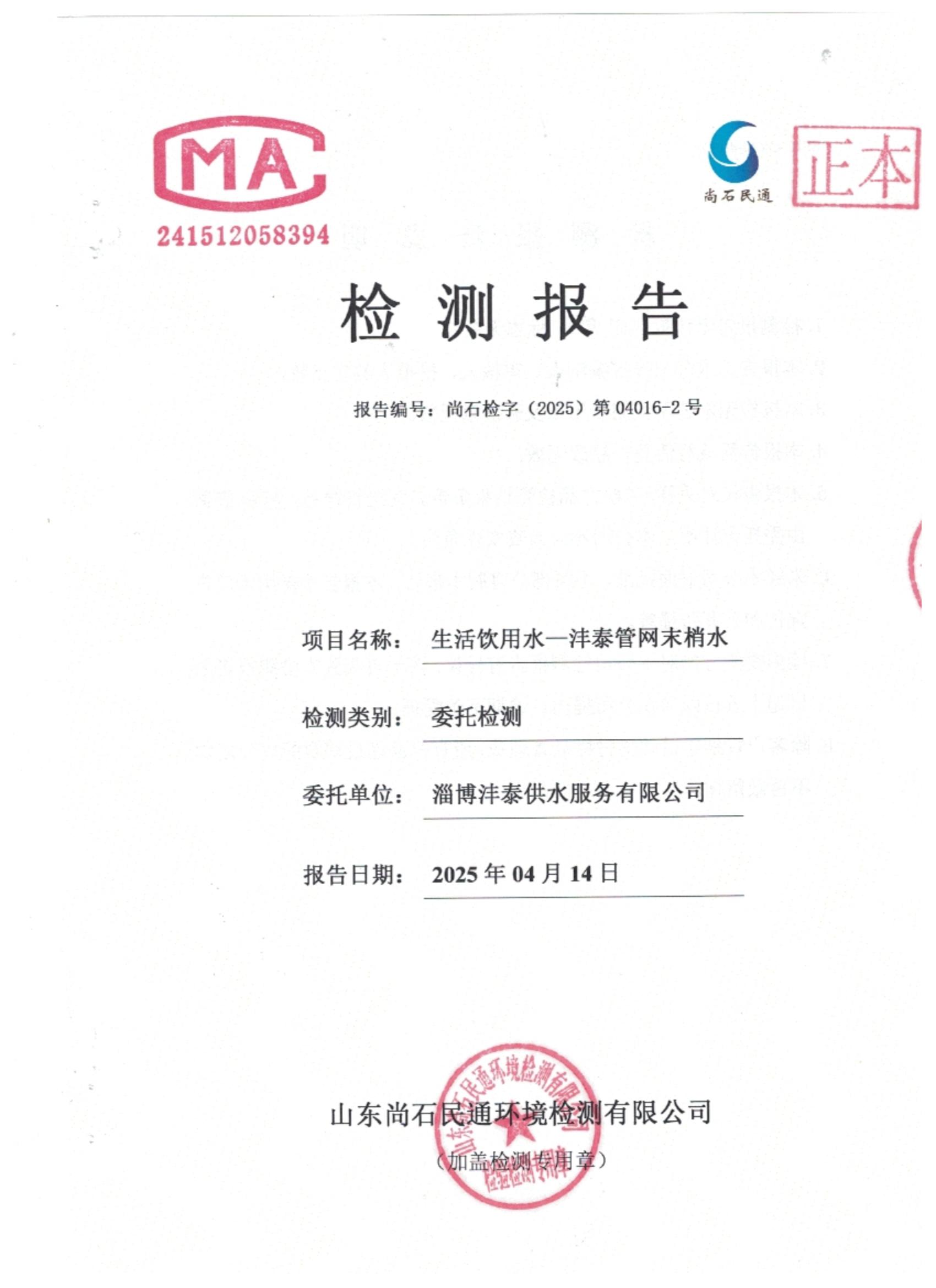 淄博灃泰供水服務(wù)有限公司末梢水月檢報(bào)告