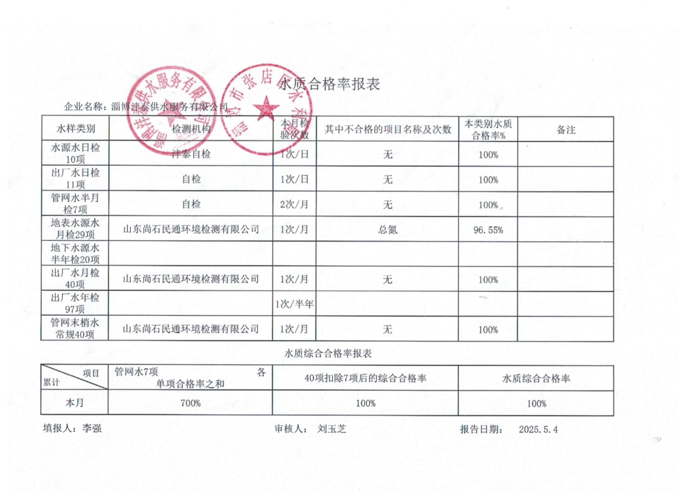 淄博灃泰供水服務(wù)有限公司水質(zhì)合格率報(bào)表
