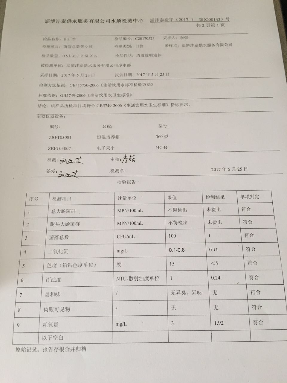 淄博灃泰供水服務(wù)有限公司水質(zhì)檢測(cè)日?qǐng)?bào)表
