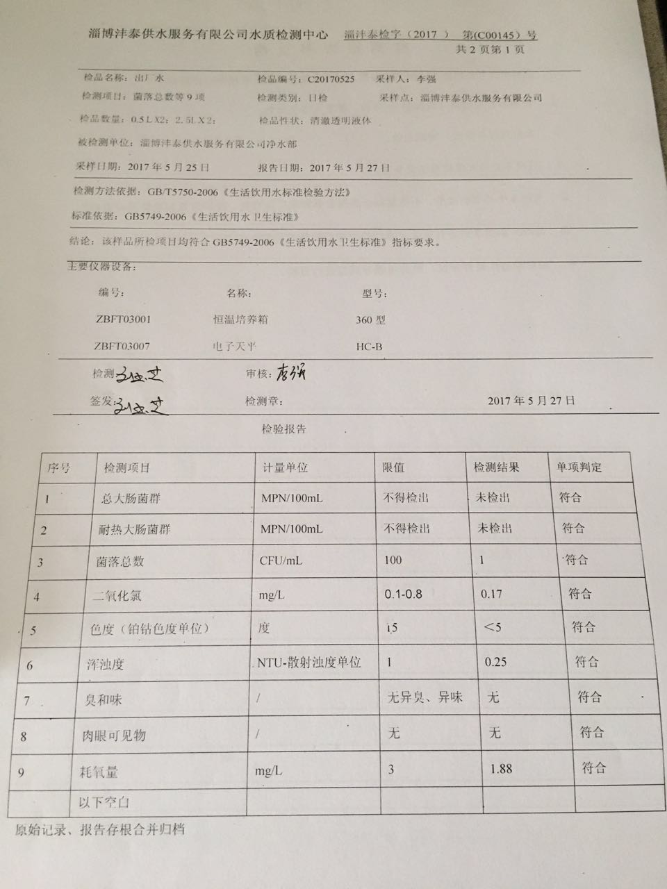 淄博灃泰供水服務(wù)有限公司水質(zhì)檢測日報表