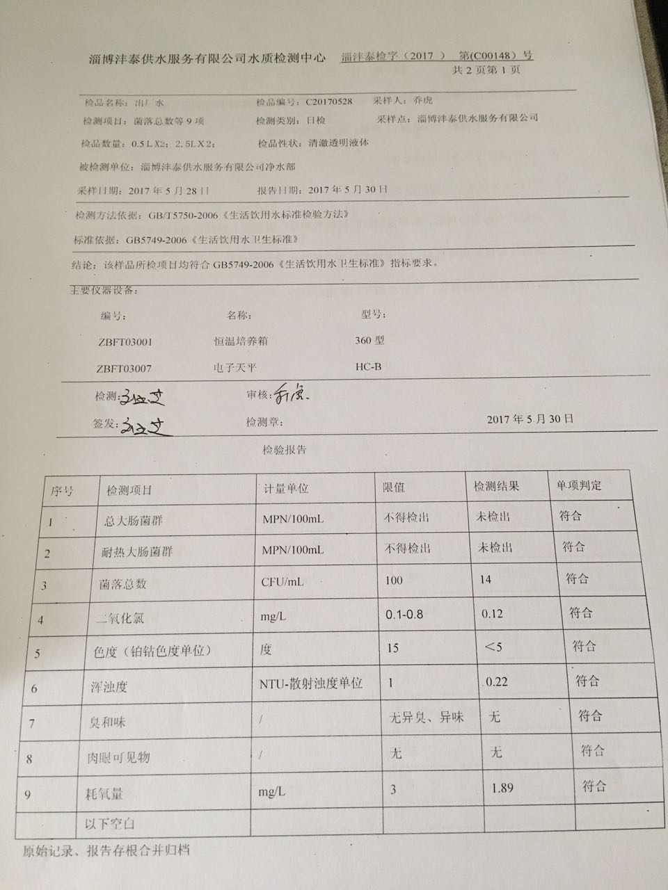 淄博灃泰供水服務(wù)有限公司水質(zhì)檢測日報表