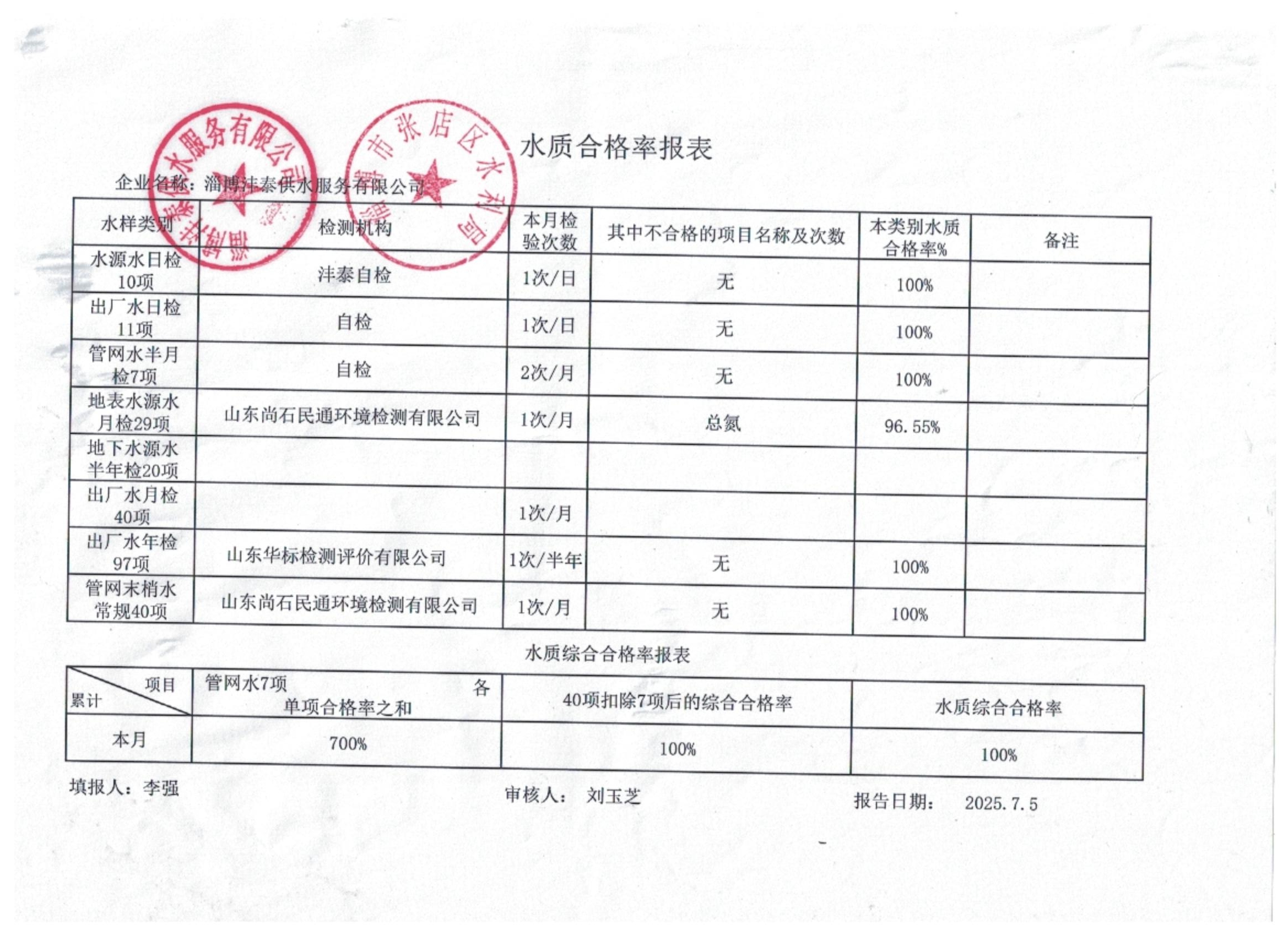 淄博灃泰供水服務(wù)有限公司水質(zhì)合格率報(bào)表