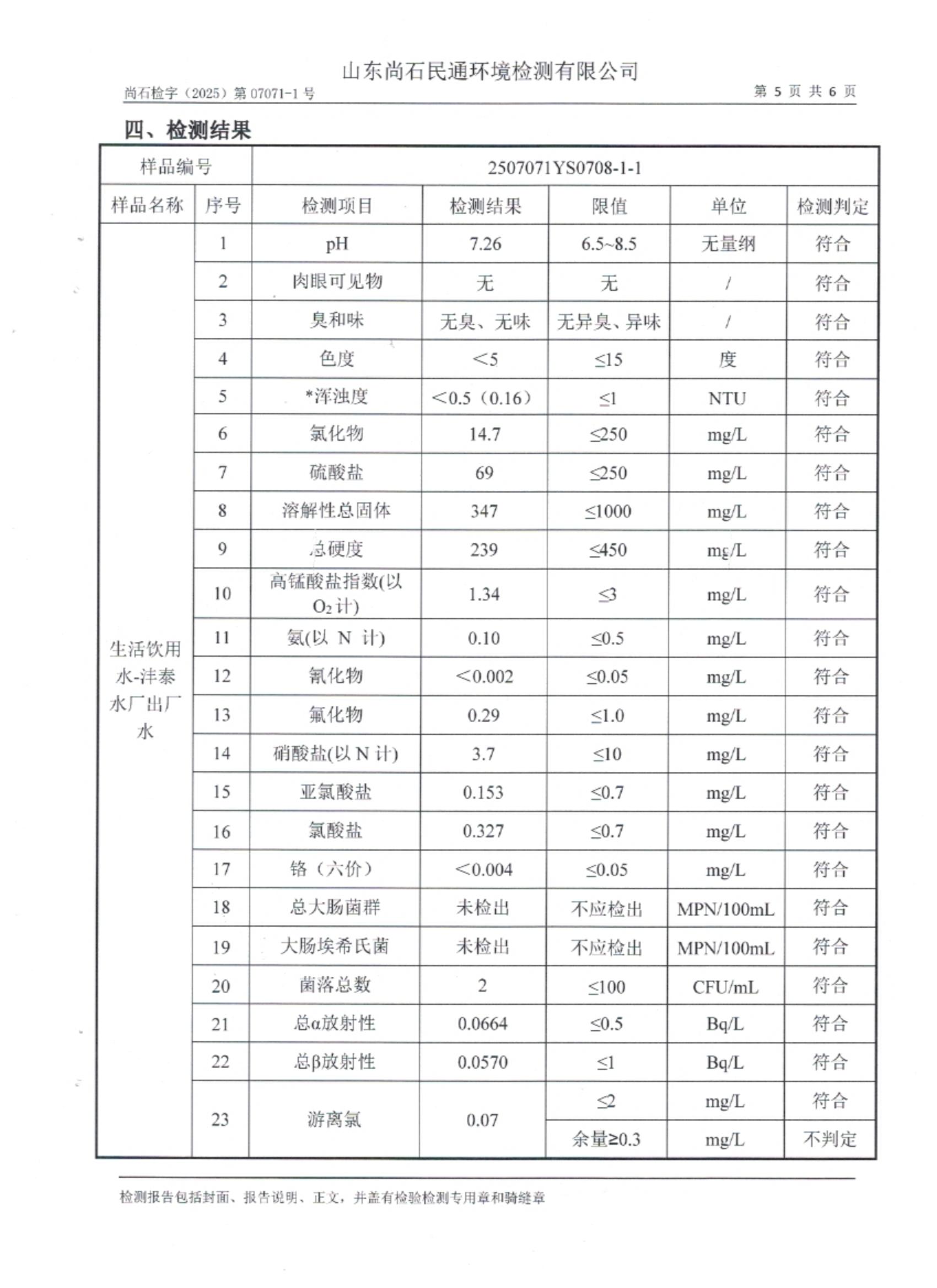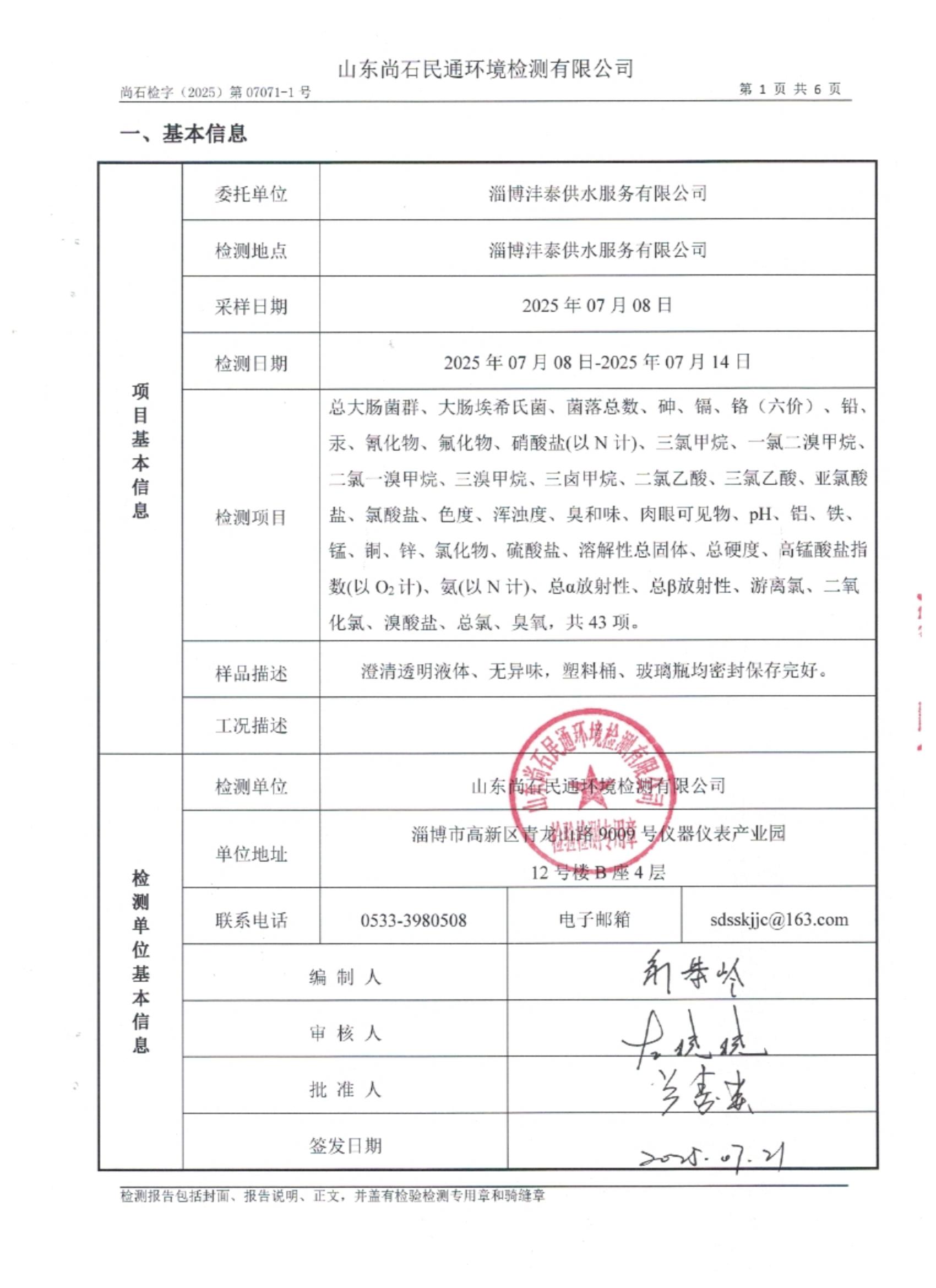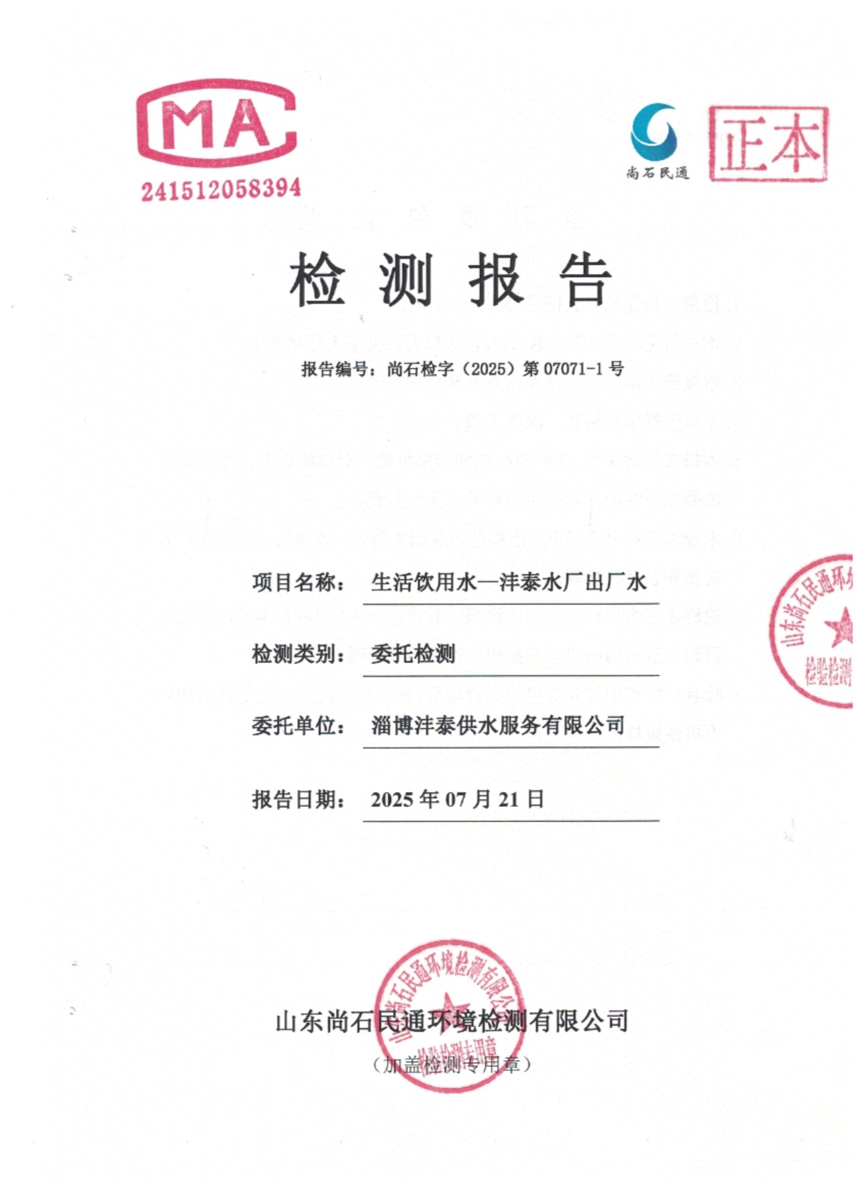 淄博灃泰供水服務(wù)有限公司出廠水月檢報(bào)告