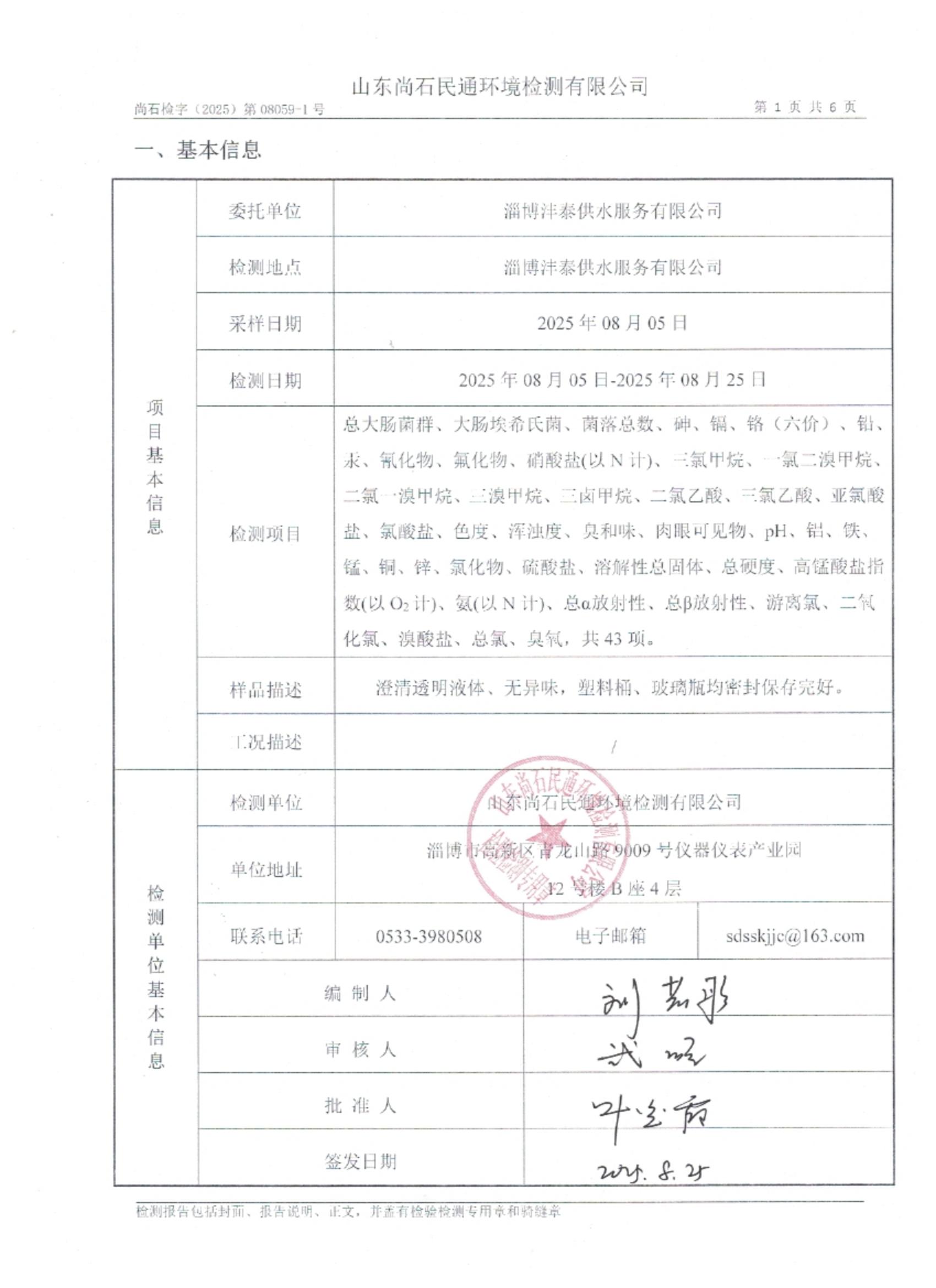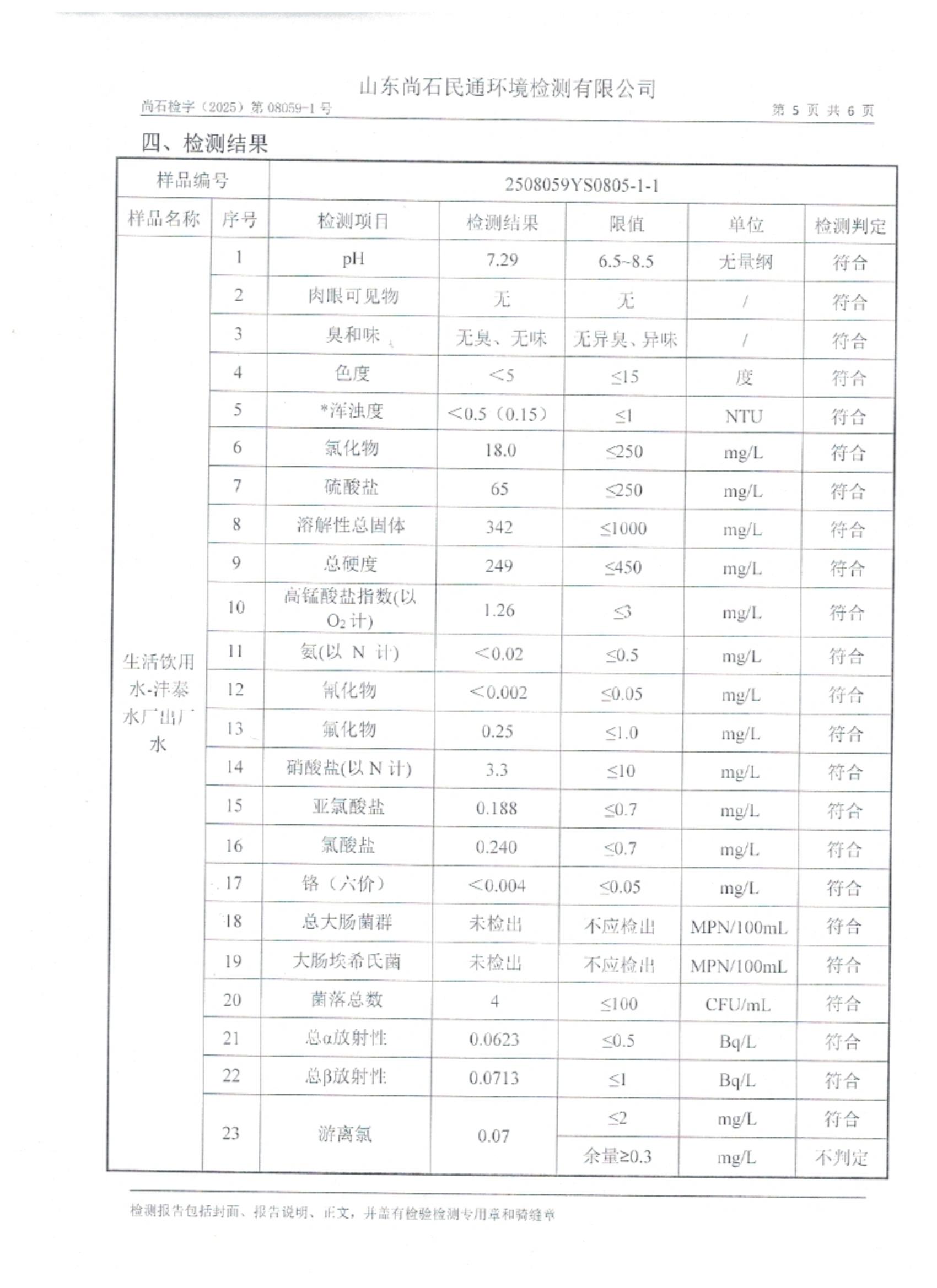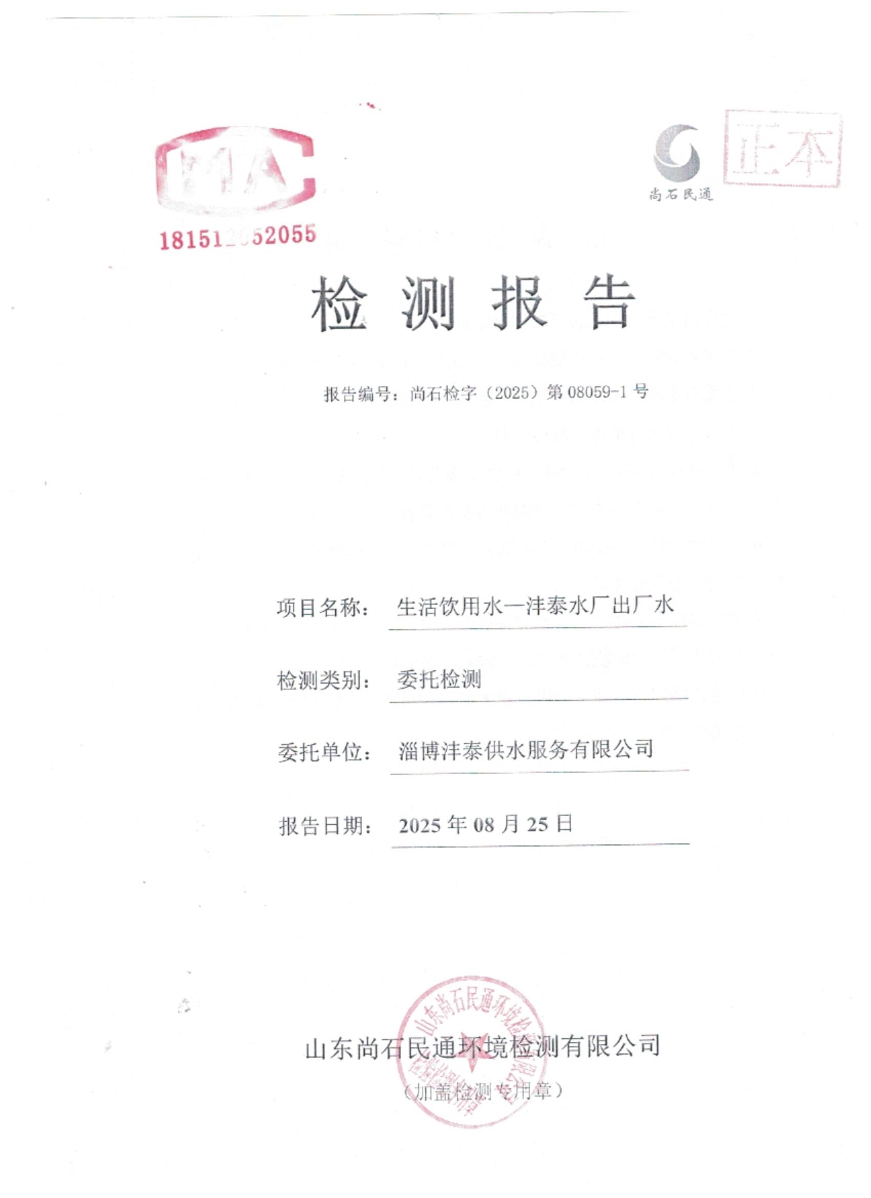 淄博灃泰供水服務(wù)有限公司出廠水月檢報(bào)告