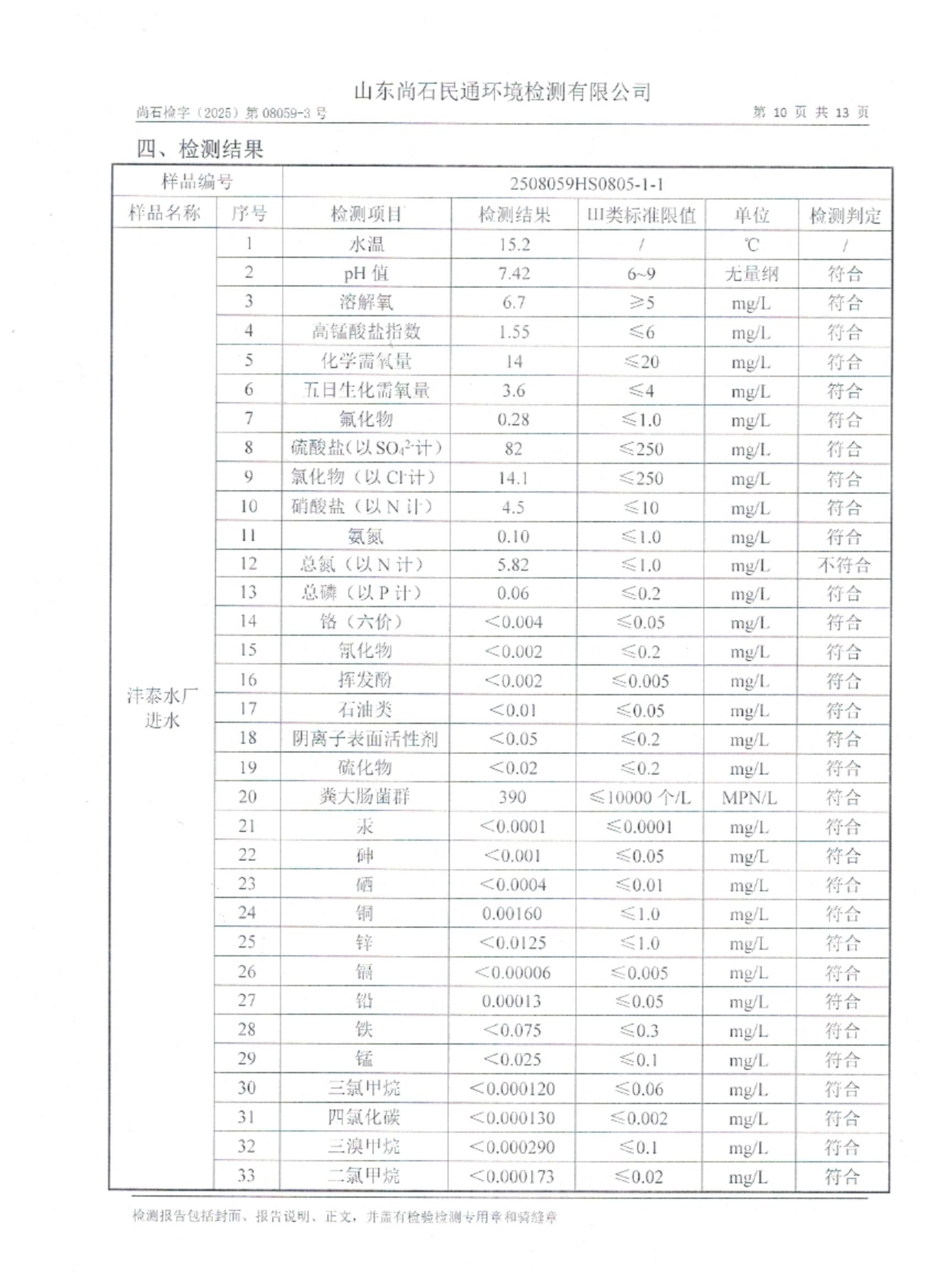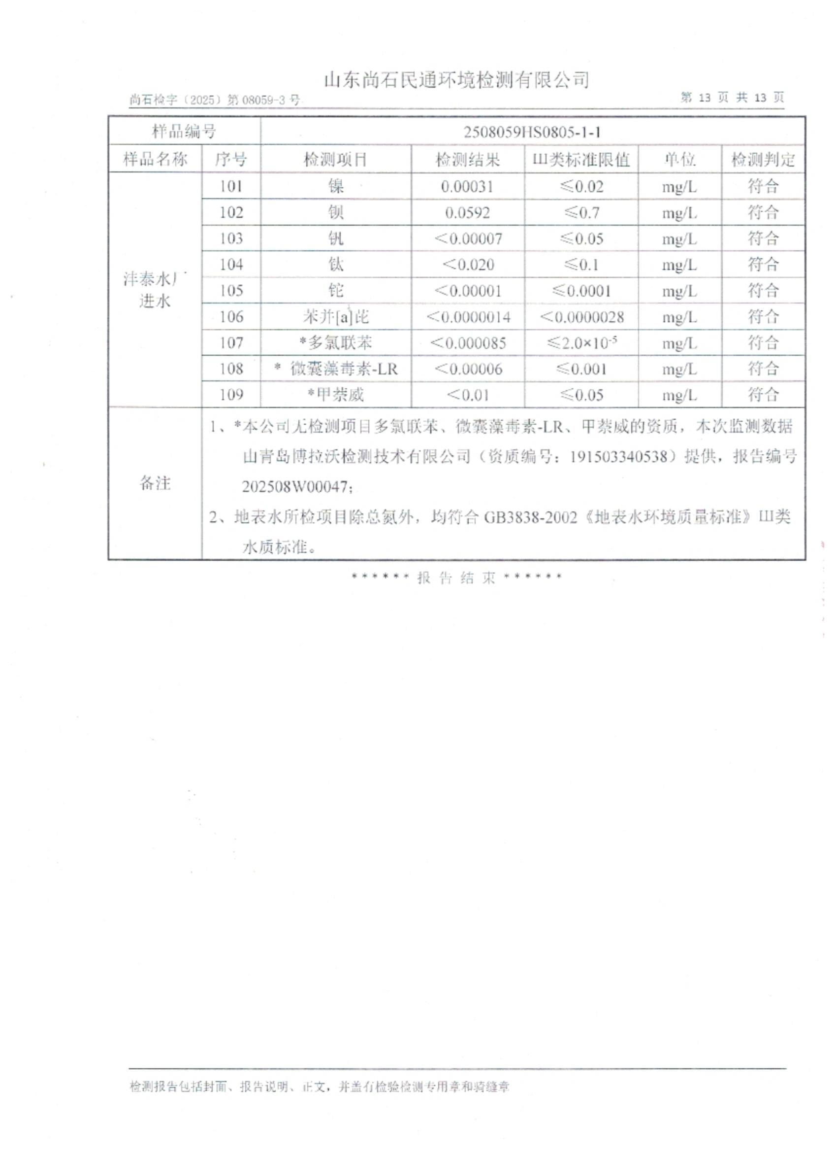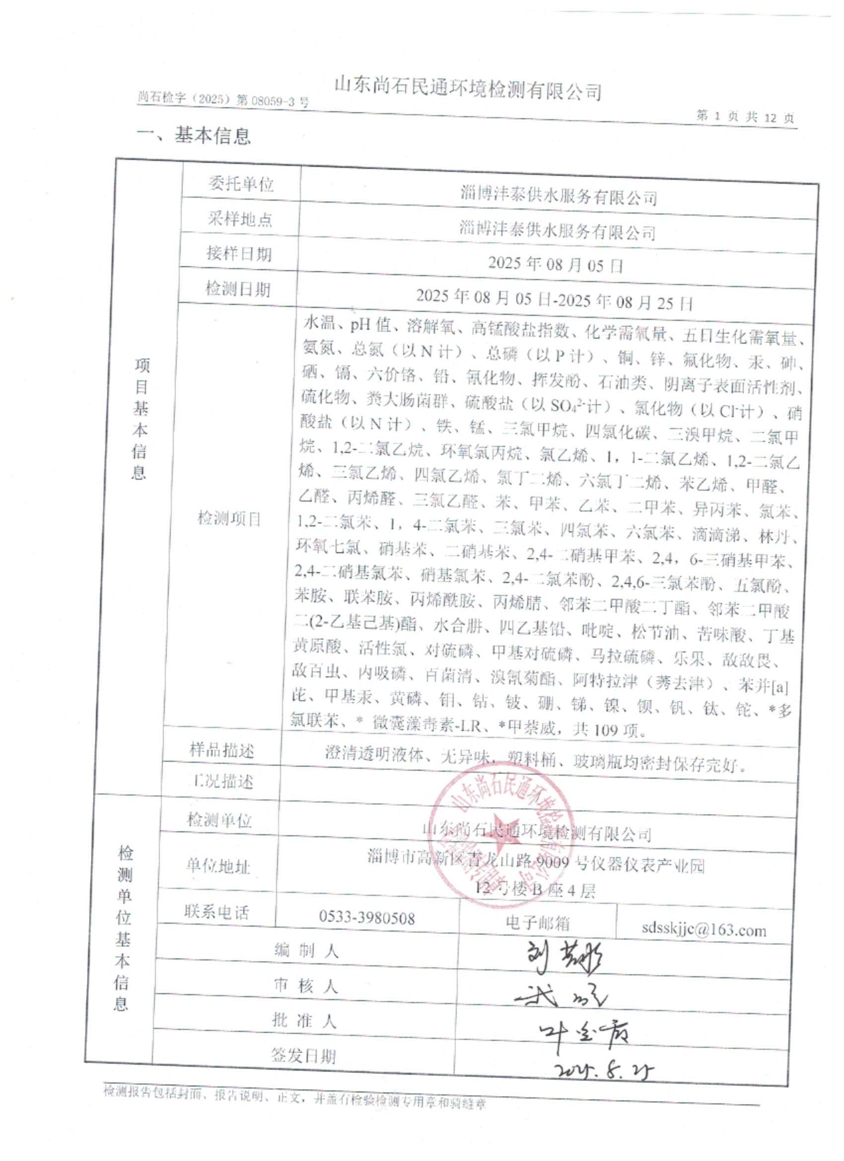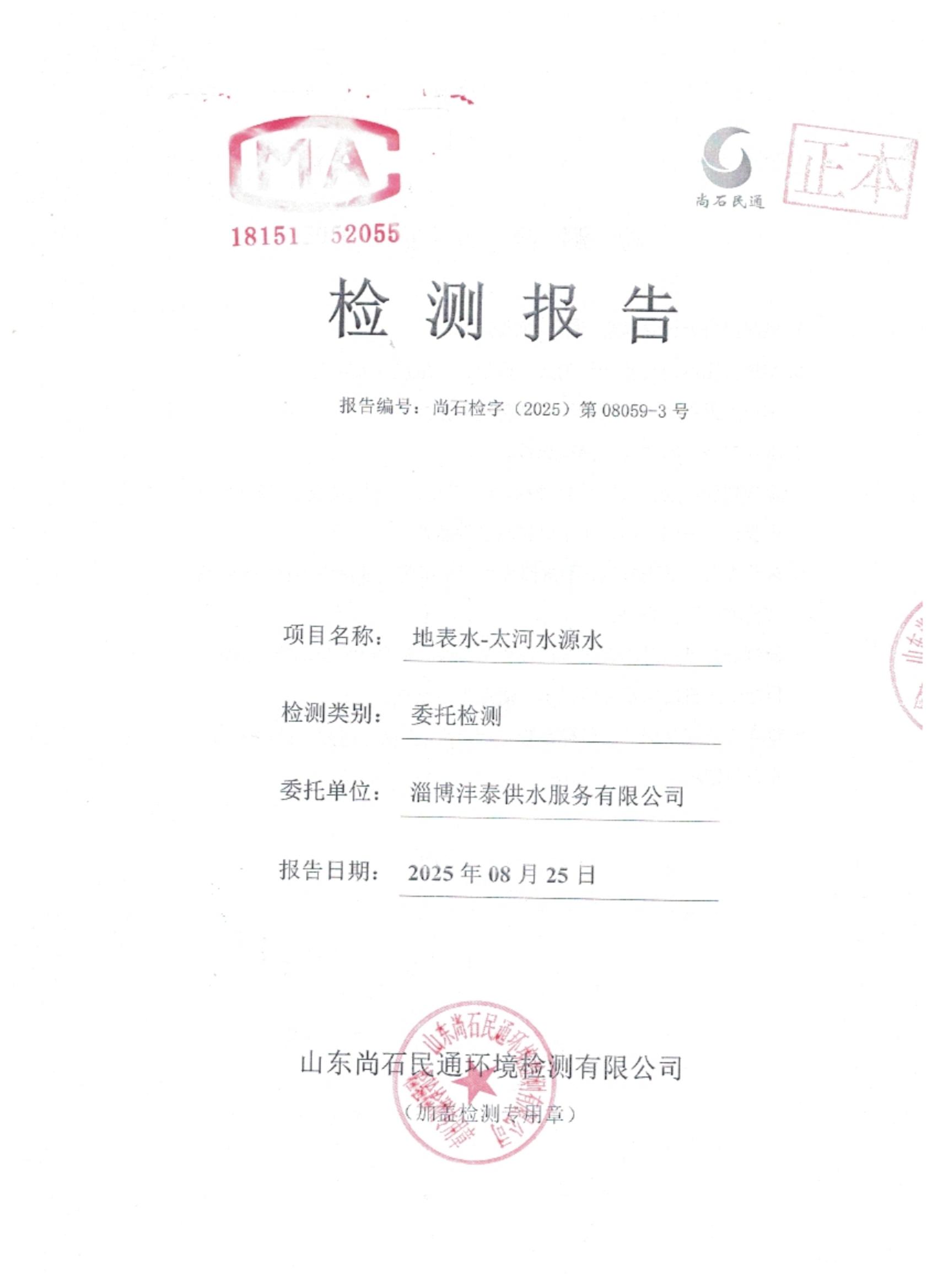 淄博灃泰供水服務(wù)有限公司地表水月檢報(bào)告