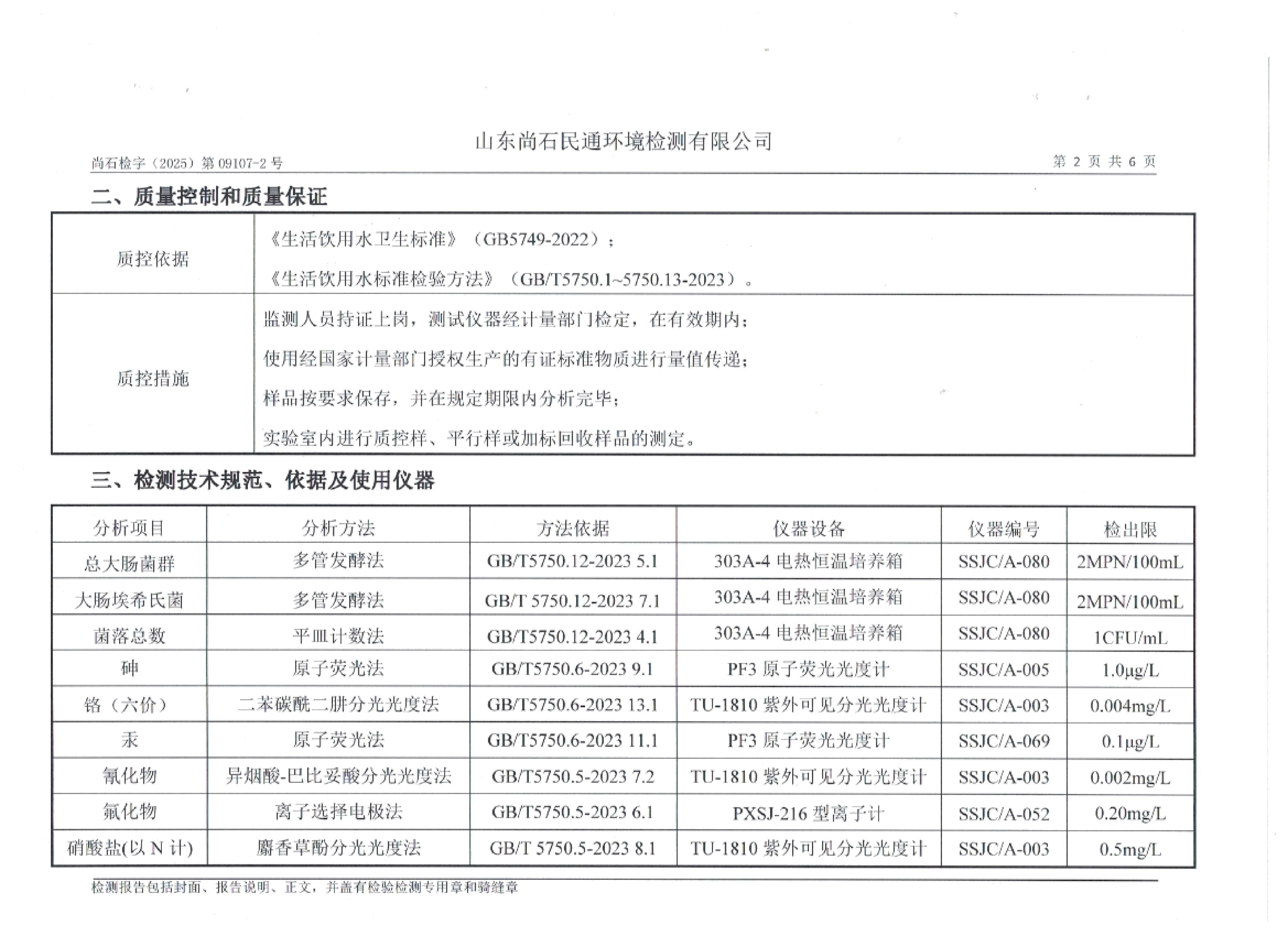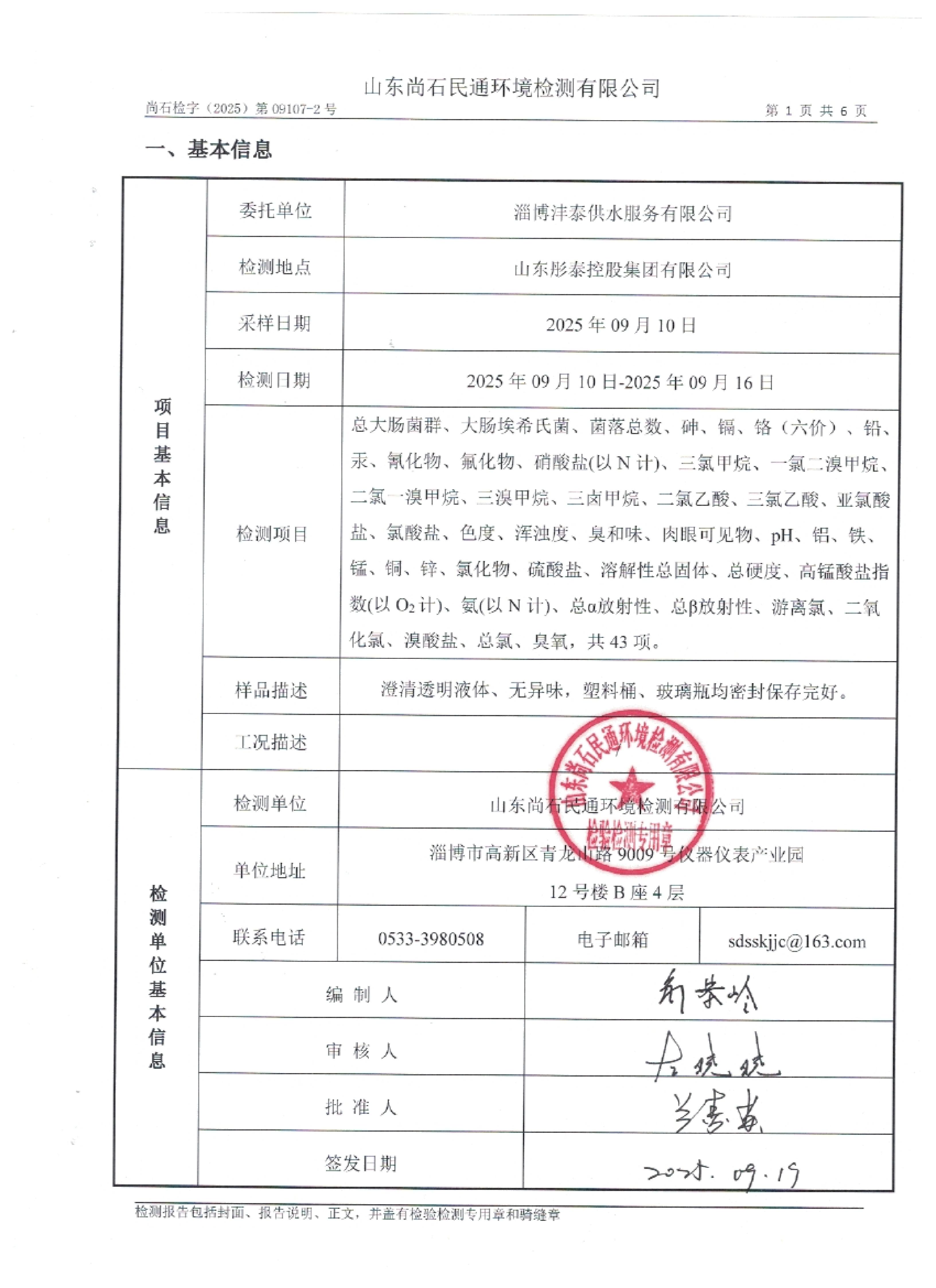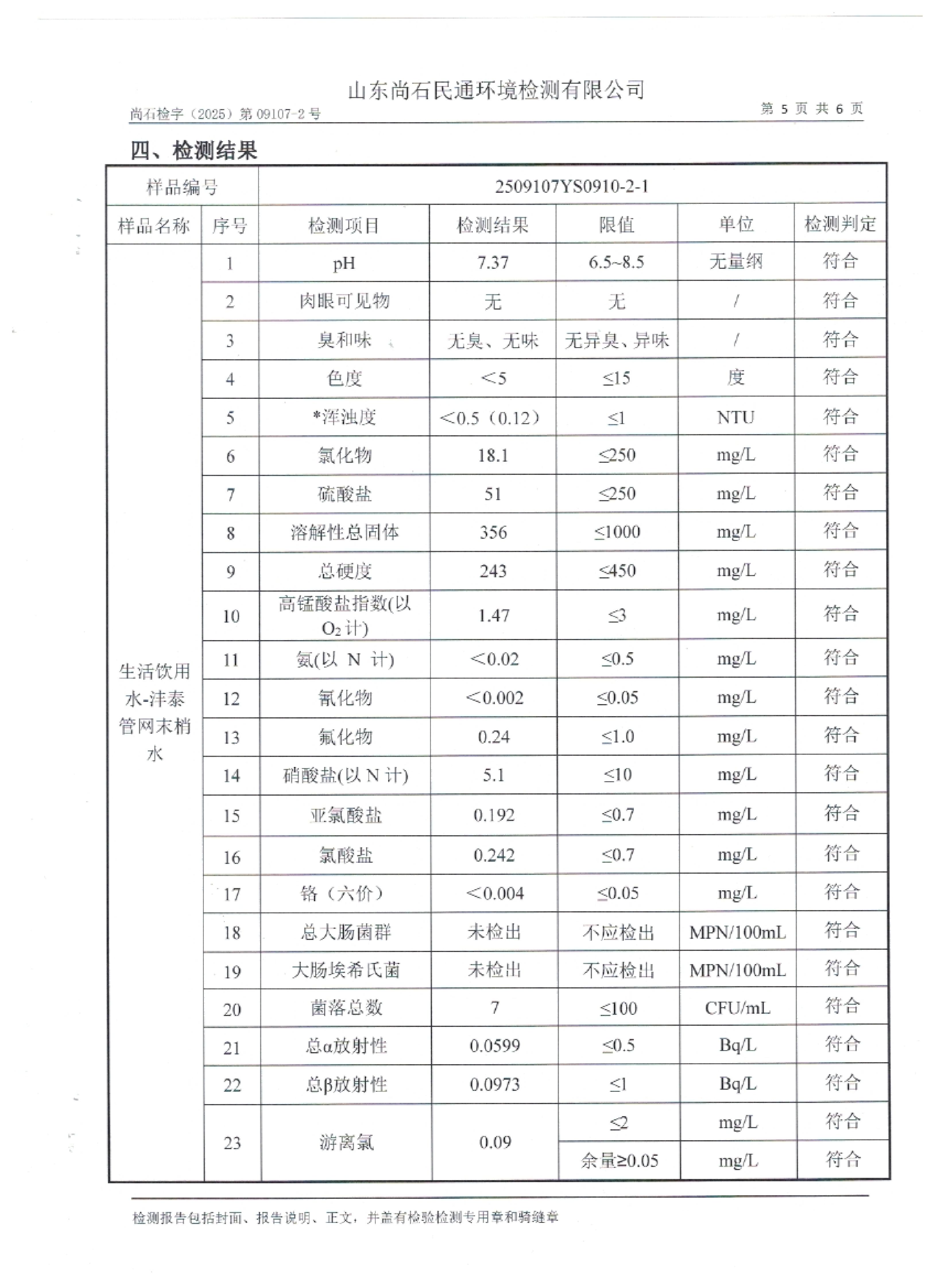 淄博灃泰供水服務(wù)有限公司末梢水月檢報(bào)告