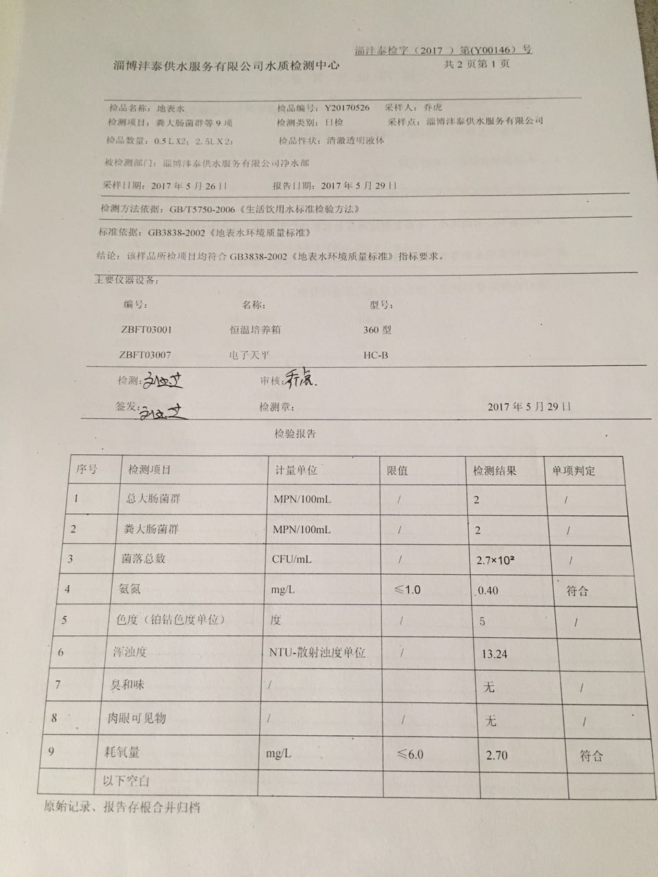 淄博灃泰供水服務(wù)有限公司地表水檢測日報表