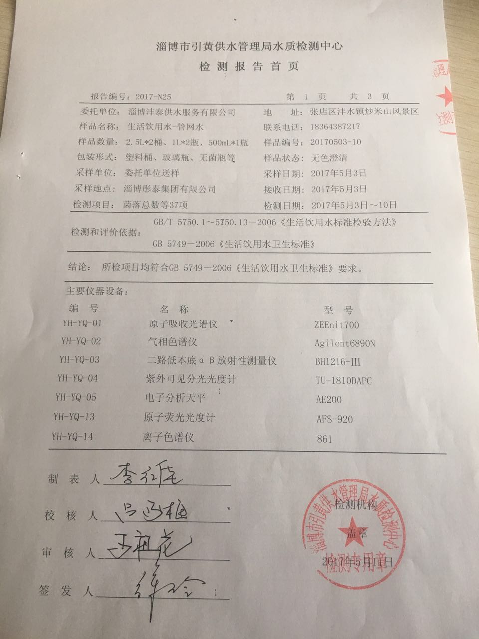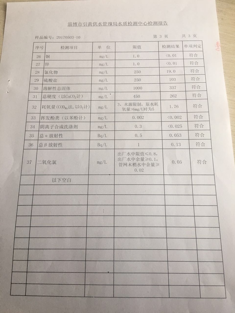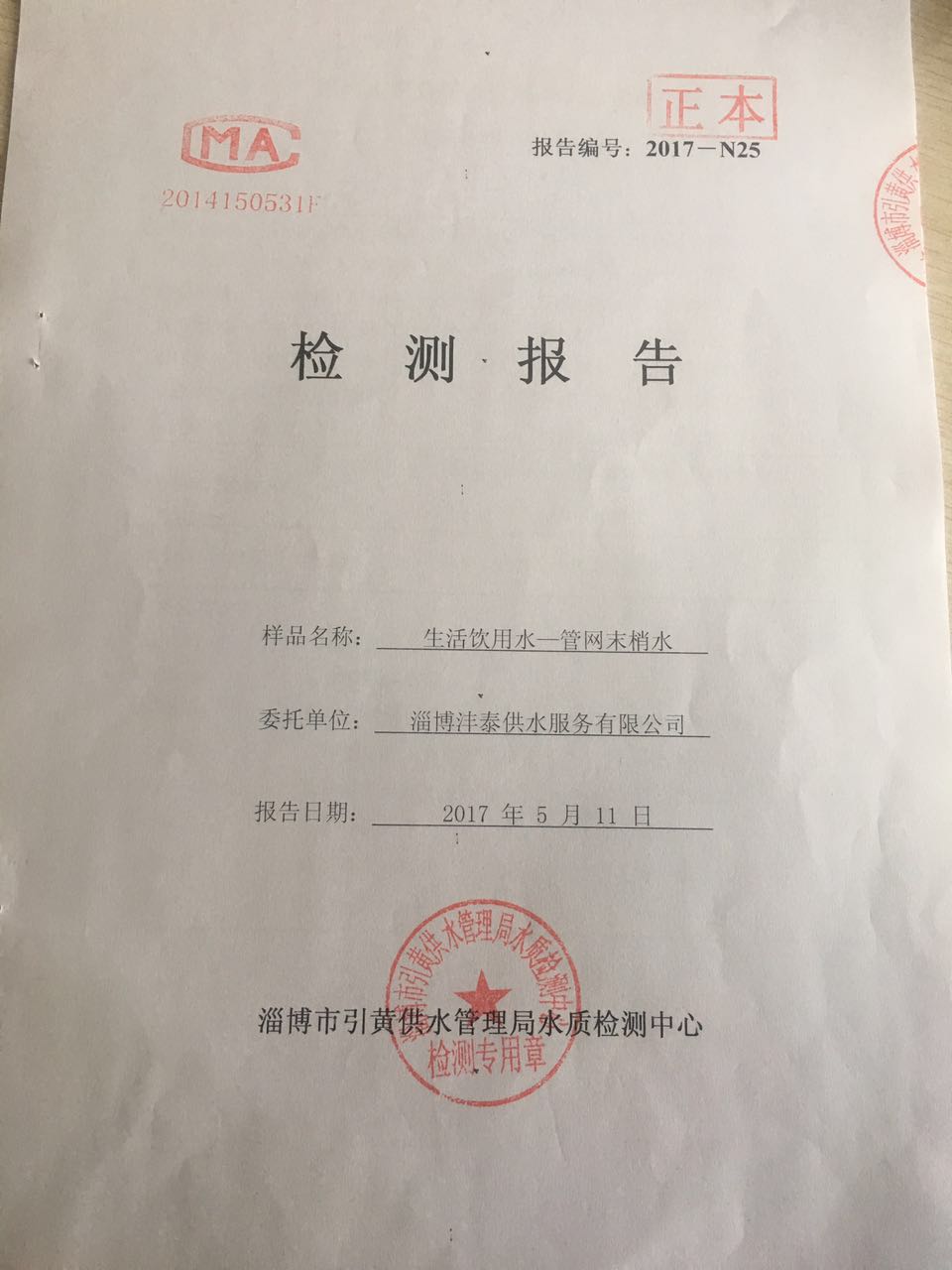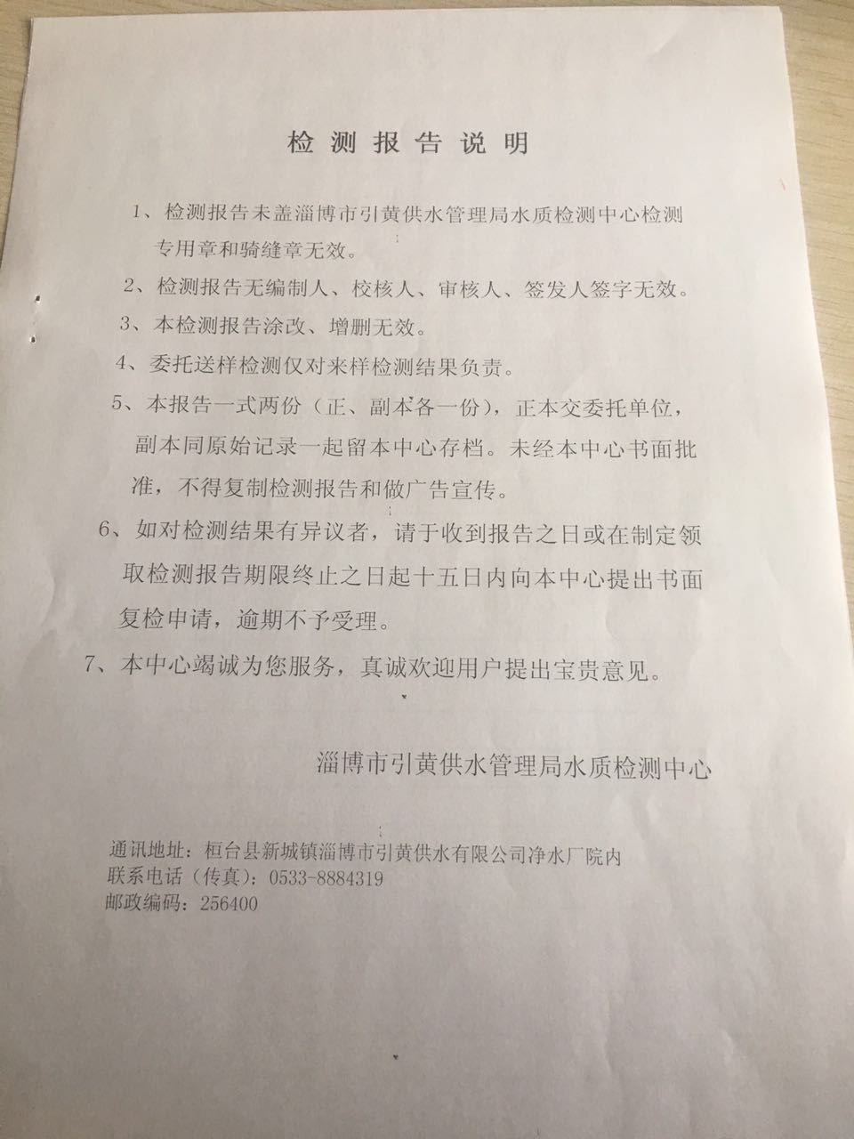 淄博灃泰供水服務(wù)有限公司生活飲用水管網(wǎng)水月檢報(bào)告