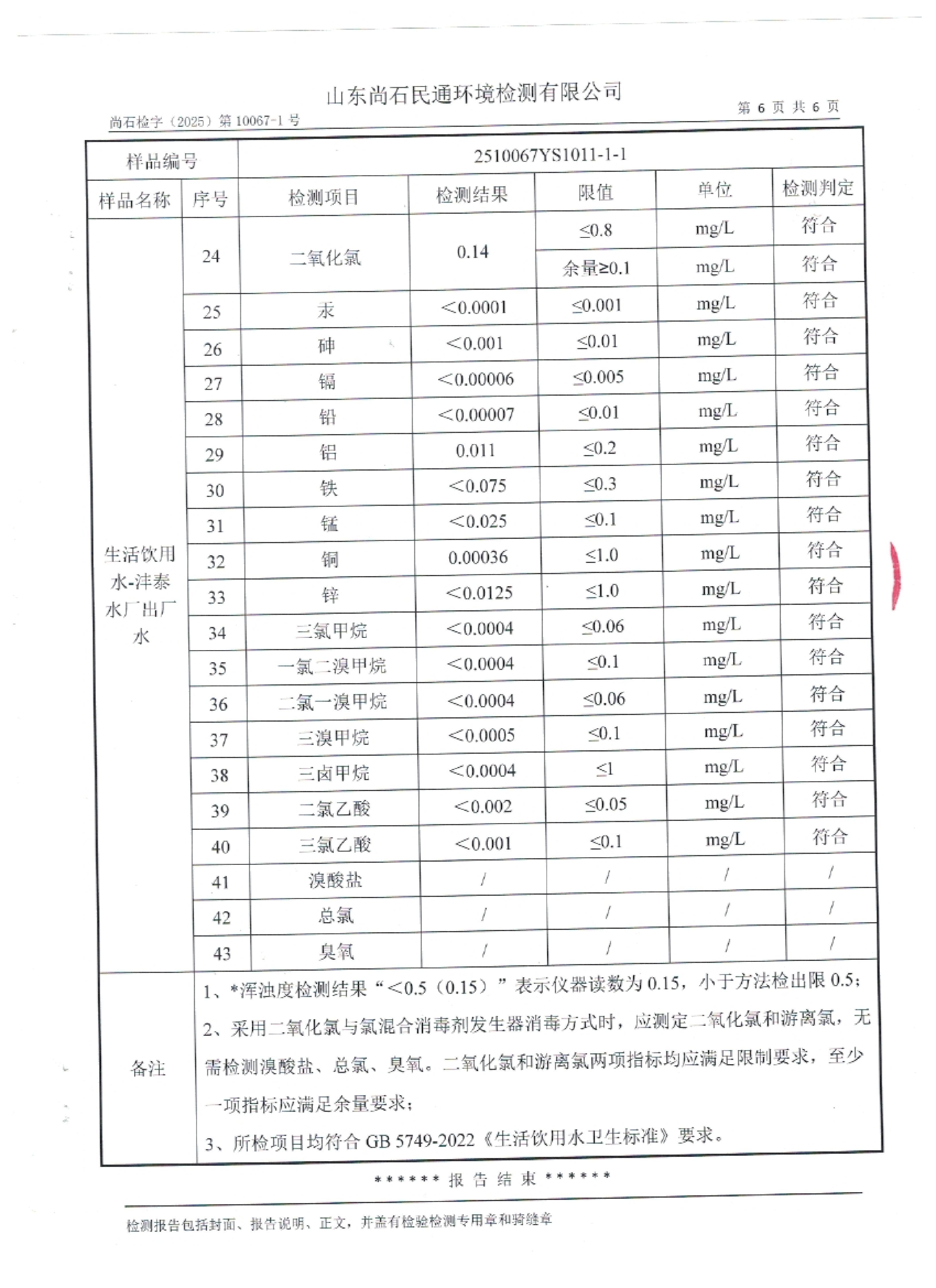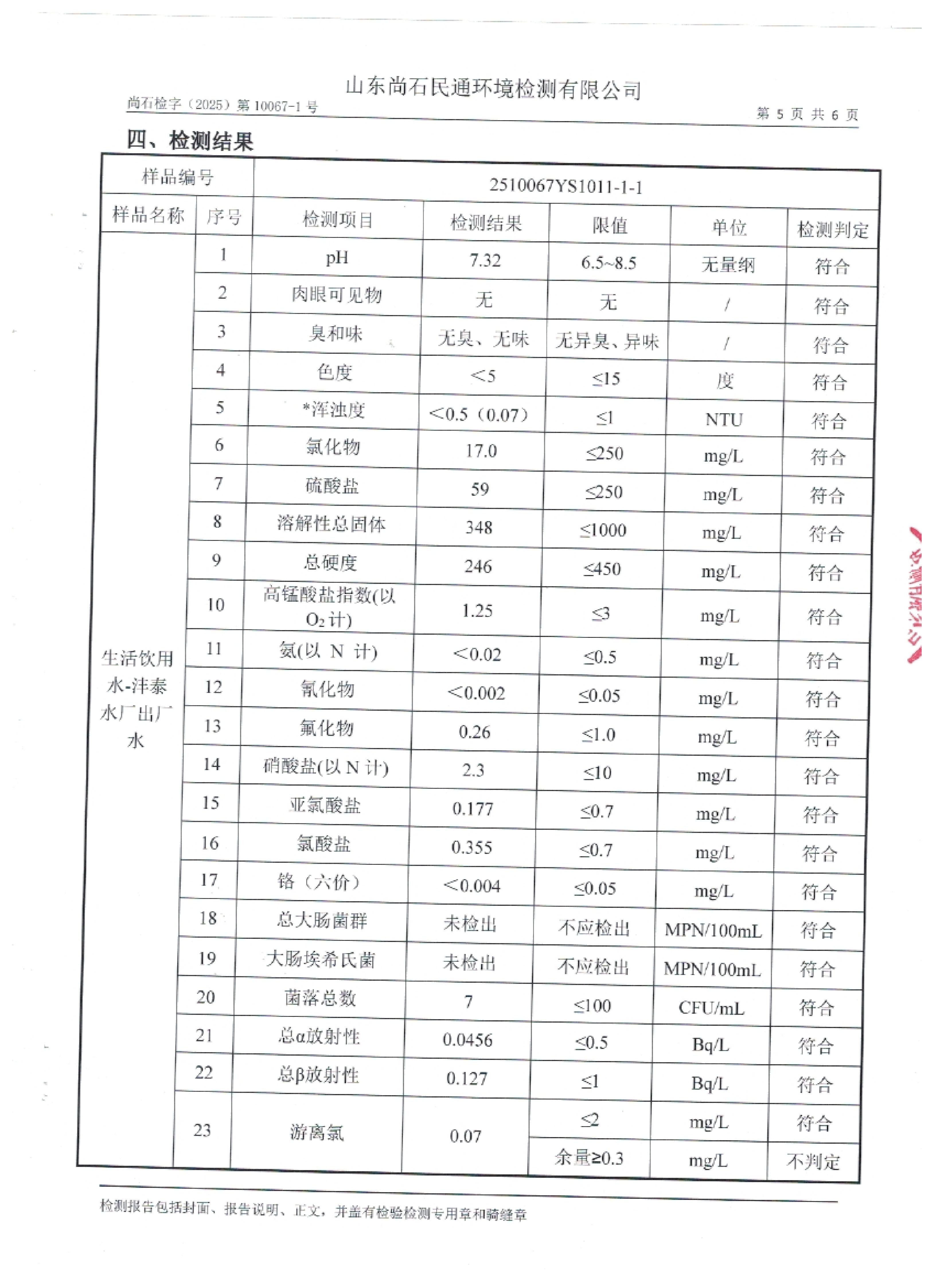 淄博灃泰供水服務(wù)有限公司出廠水月檢報(bào)告