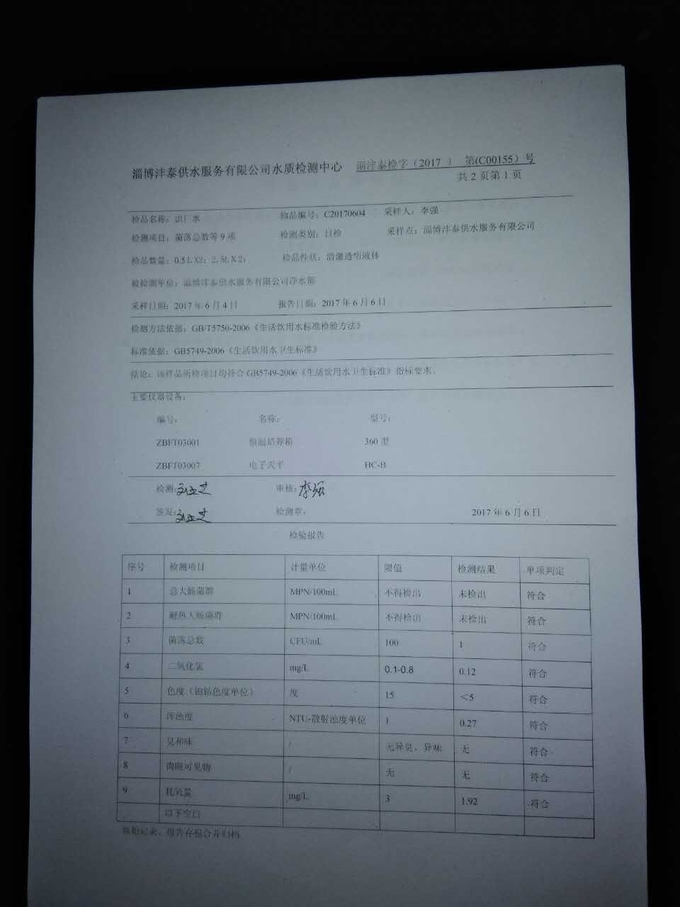 淄博灃泰供水服務(wù)有限公司水質(zhì)檢測日報表
