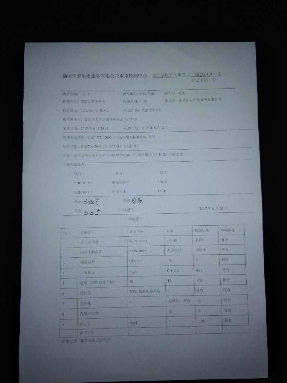 淄博灃泰供水服務(wù)有限公司水質(zhì)檢測日?qǐng)?bào)表