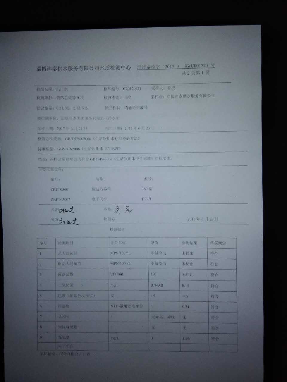 淄博灃泰供水服務(wù)有限公司水質(zhì)檢測(cè)日?qǐng)?bào)表