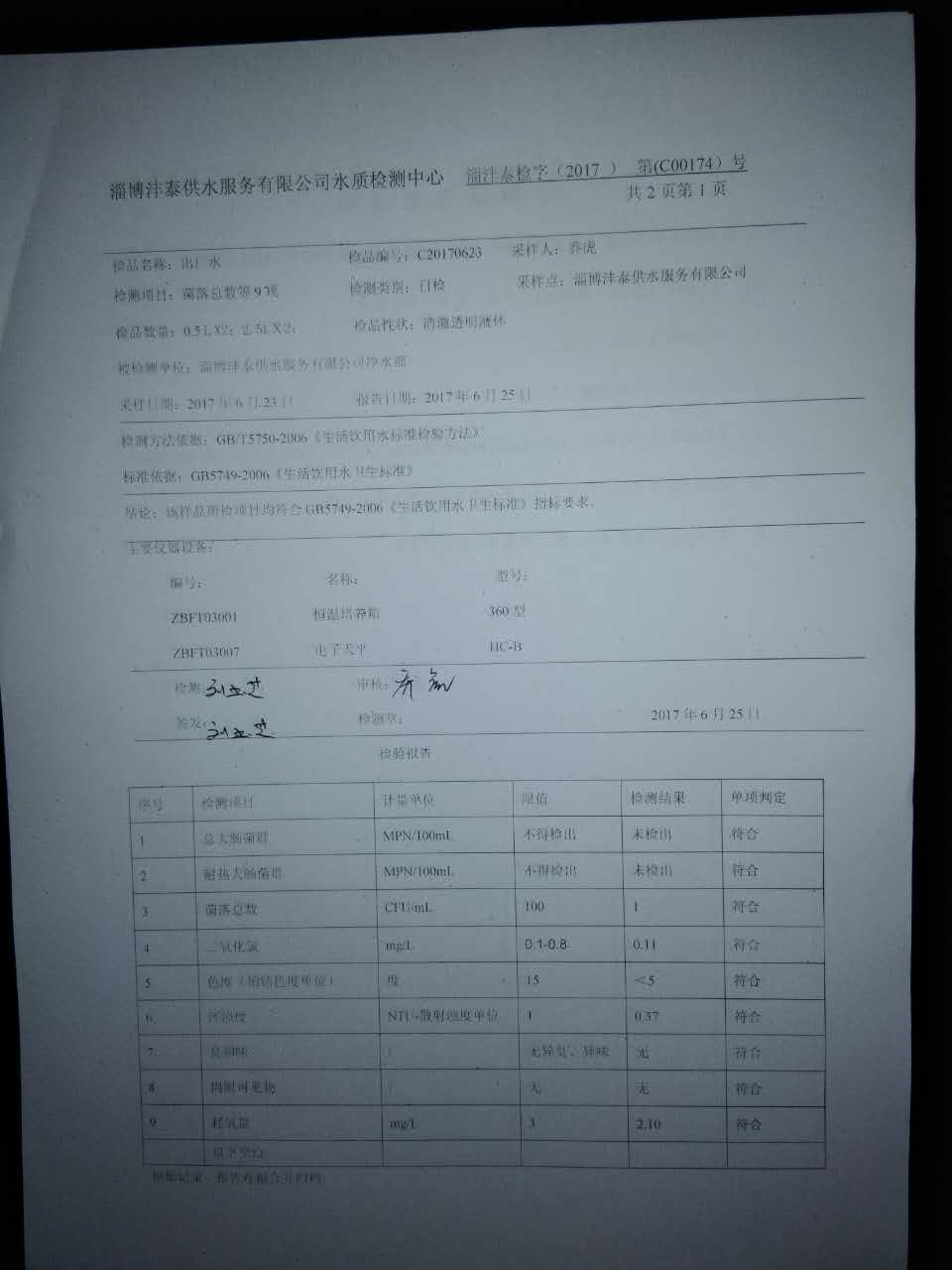 淄博灃泰供水服務(wù)有限公司水質(zhì)檢測(cè)日?qǐng)?bào)表
