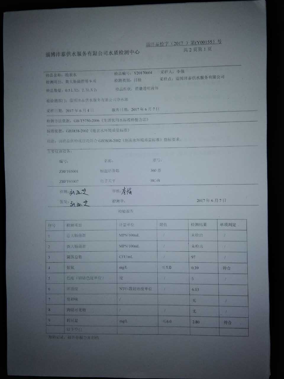 淄博灃泰供水服務(wù)有限公司地表水檢測日報表