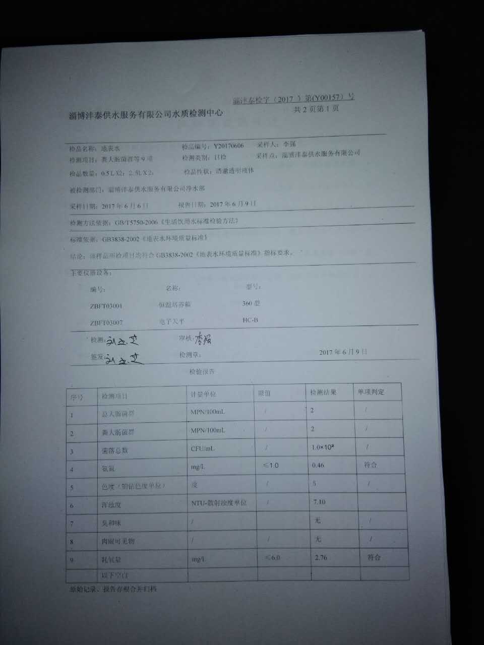 淄博灃泰供水服務(wù)有限公司地表水檢測(cè)日?qǐng)?bào)表