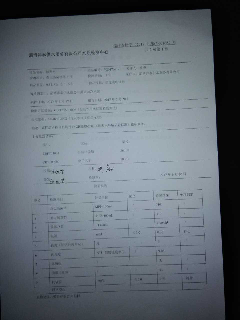 淄博灃泰供水服務(wù)有限公司地表水檢測日報表