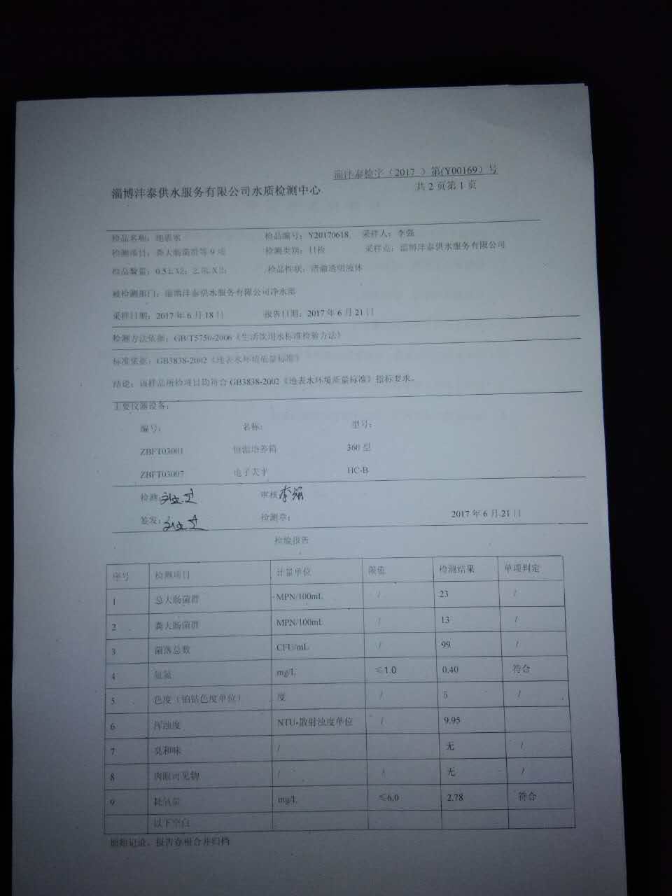 淄博灃泰供水服務(wù)有限公司地表水檢測(cè)日?qǐng)?bào)表