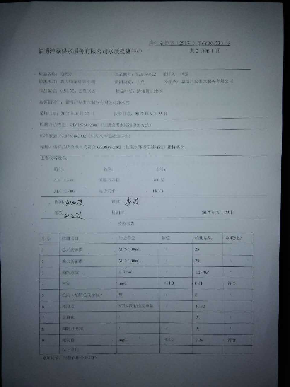 淄博灃泰供水服務(wù)有限公司地表水檢測日報表