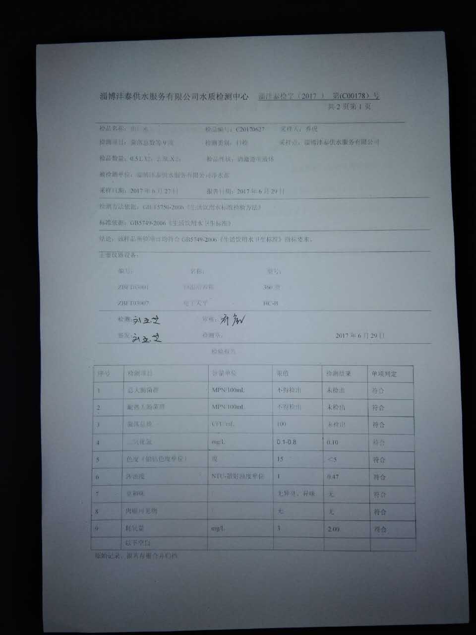 淄博灃泰供水服務(wù)有限公司水質(zhì)檢測(cè)日?qǐng)?bào)表