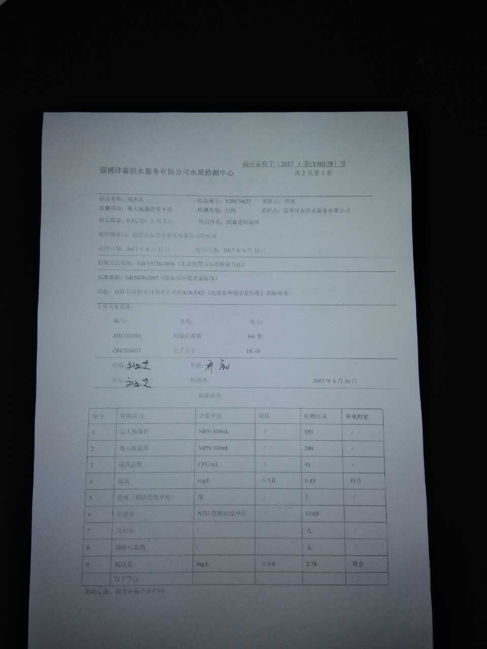 淄博灃泰供水服務(wù)有限公司地表水檢測日報表