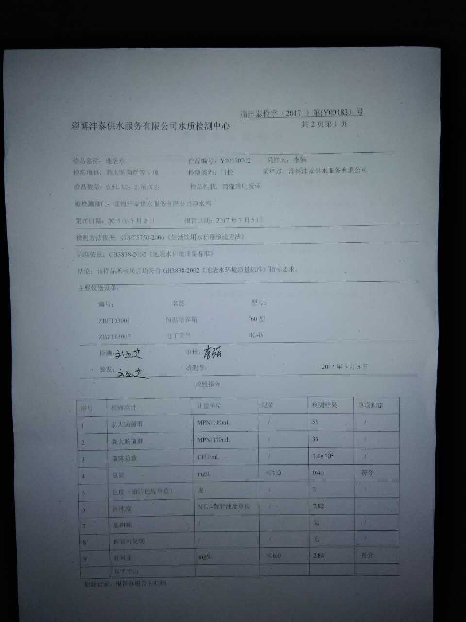 淄博灃泰供水服務(wù)有限公司地表水檢測日報表