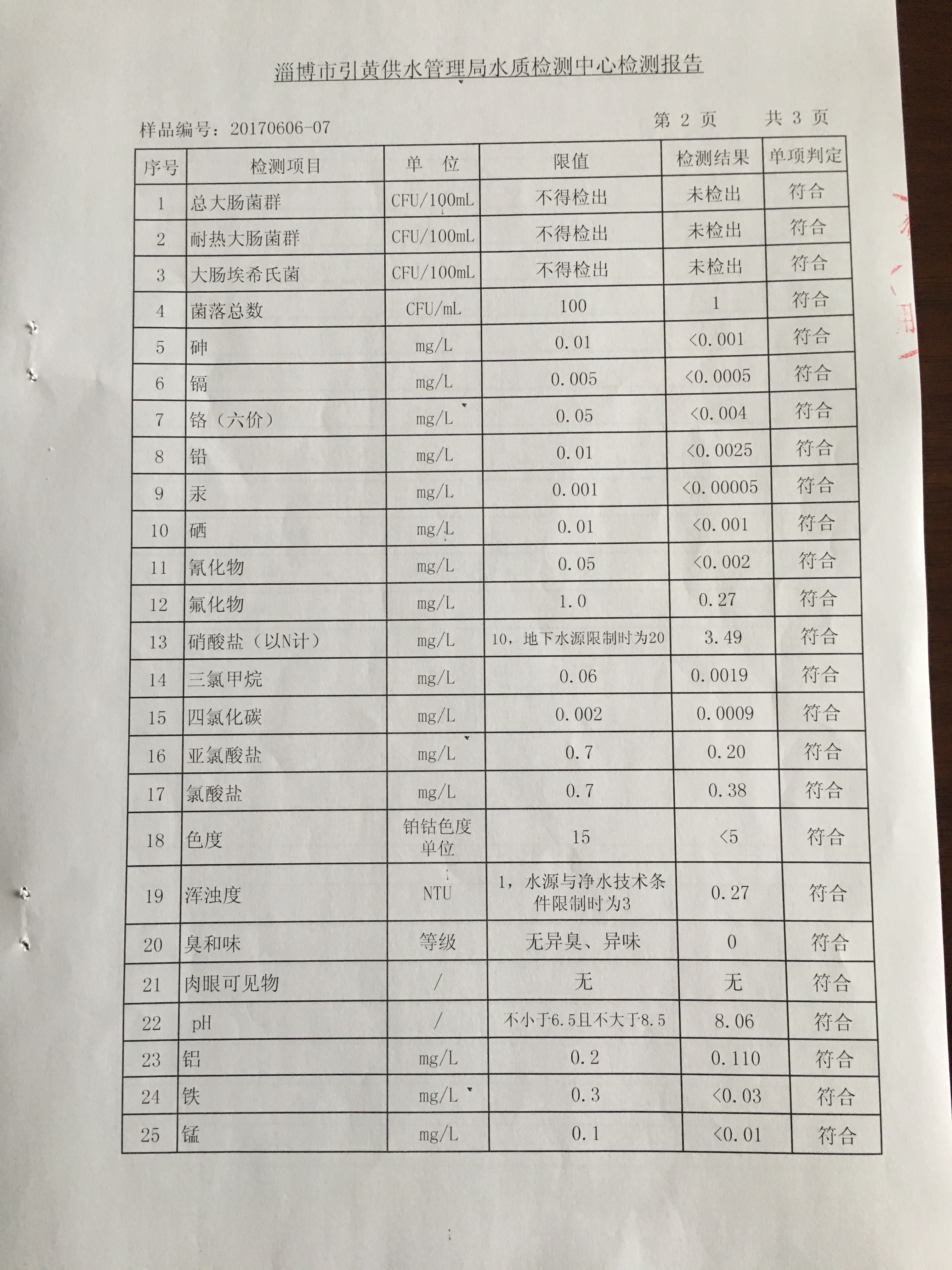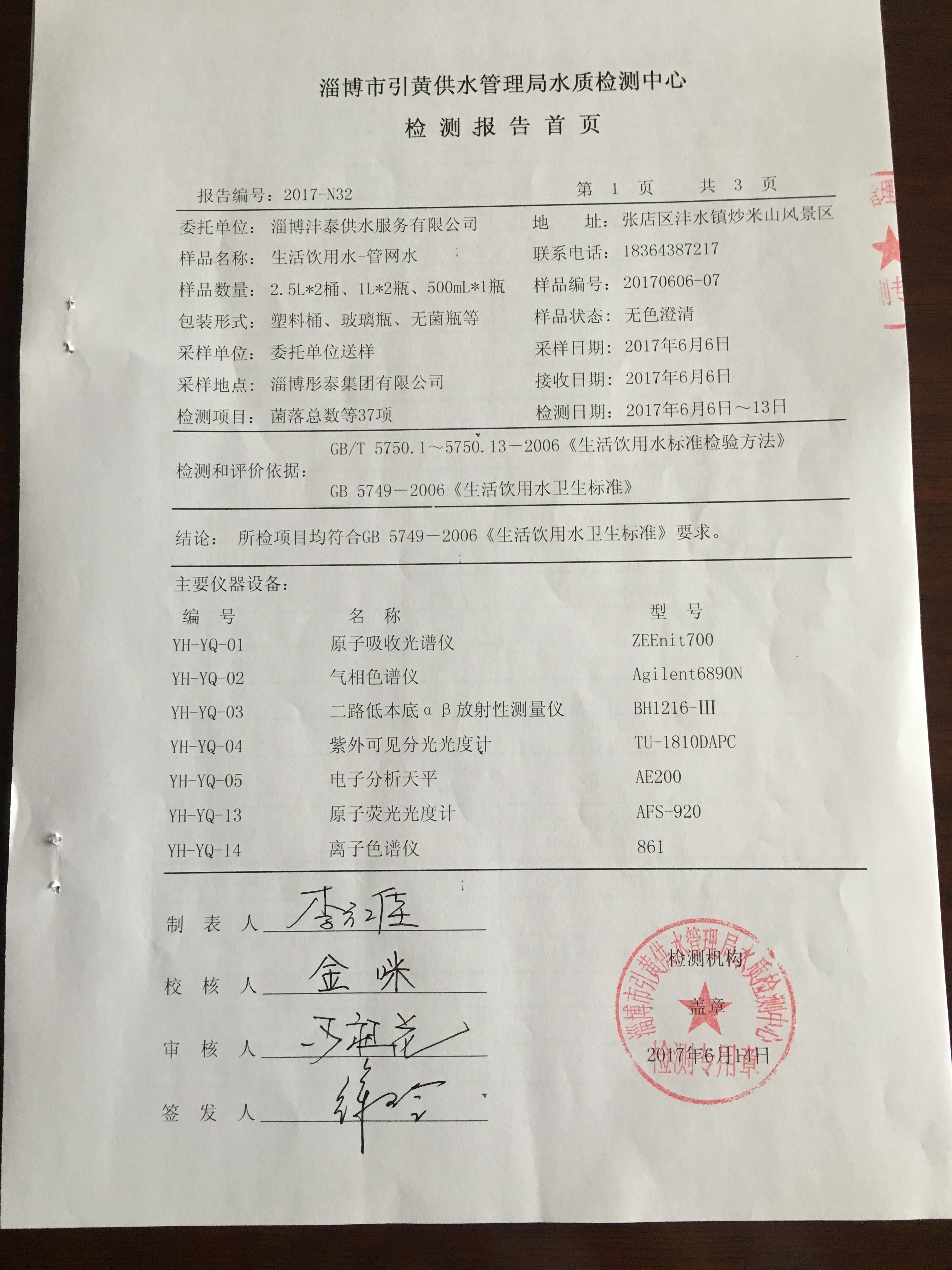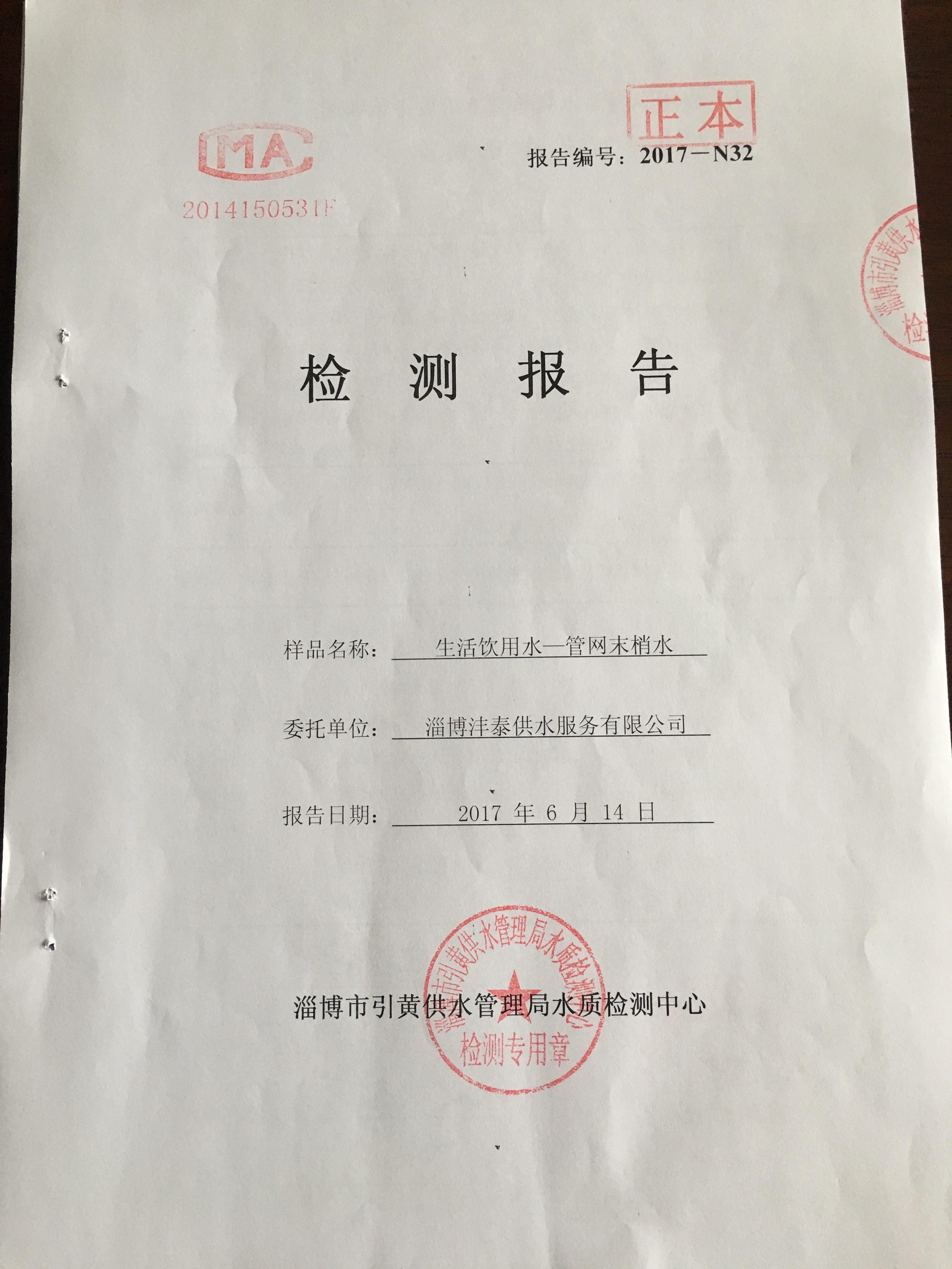 淄博灃泰供水服務(wù)有限公司管網(wǎng)水檢測月報(bào)表