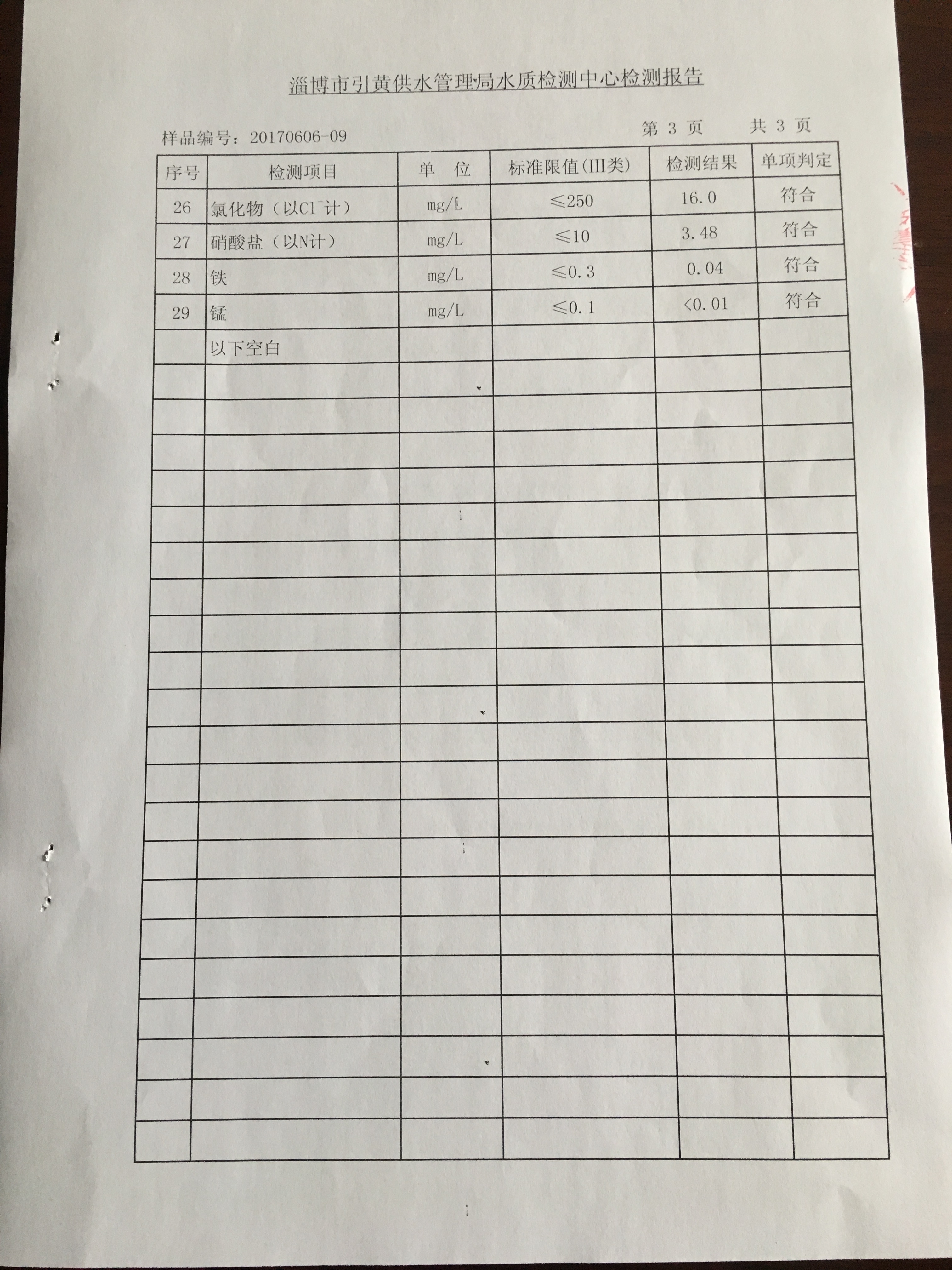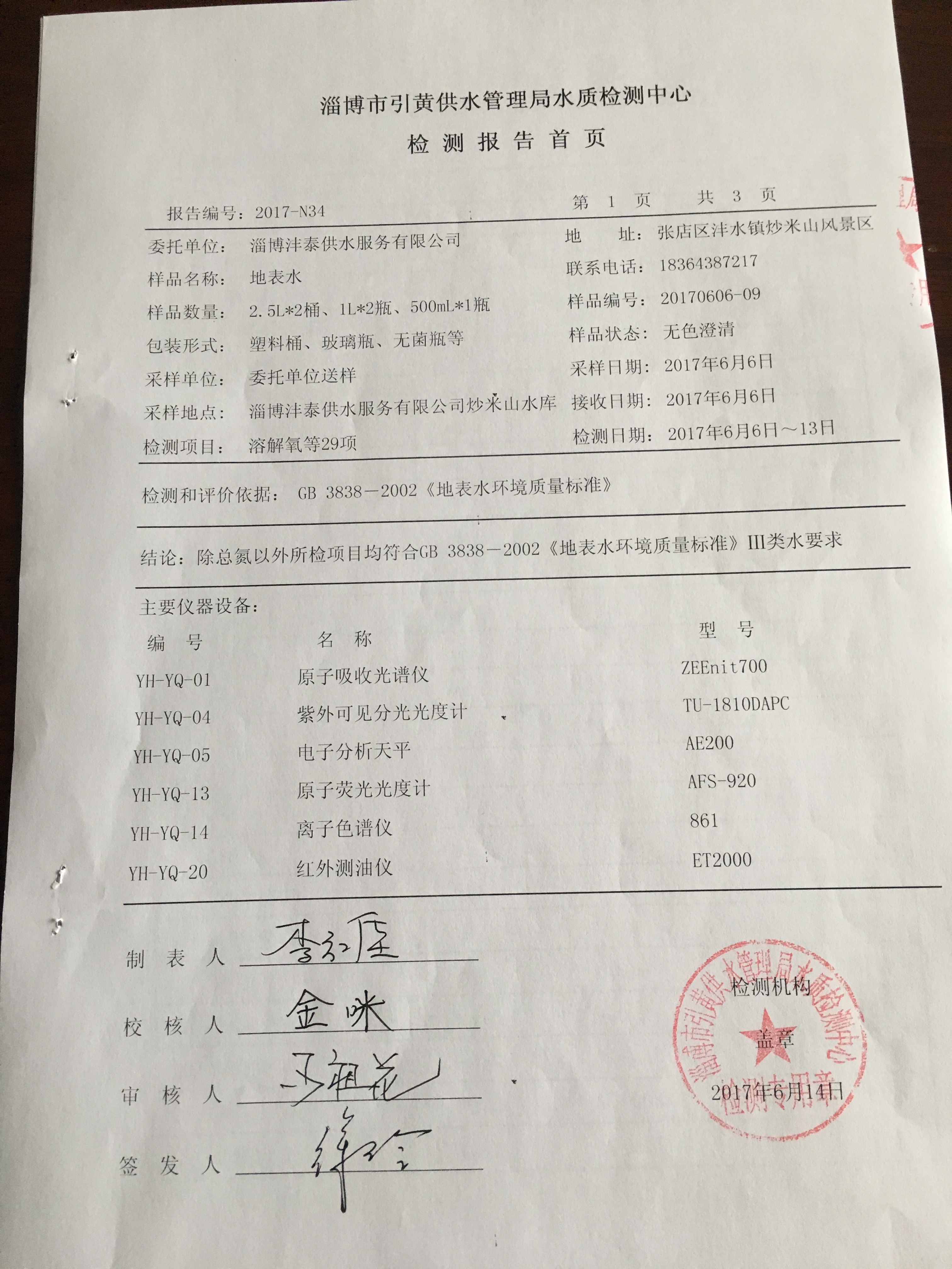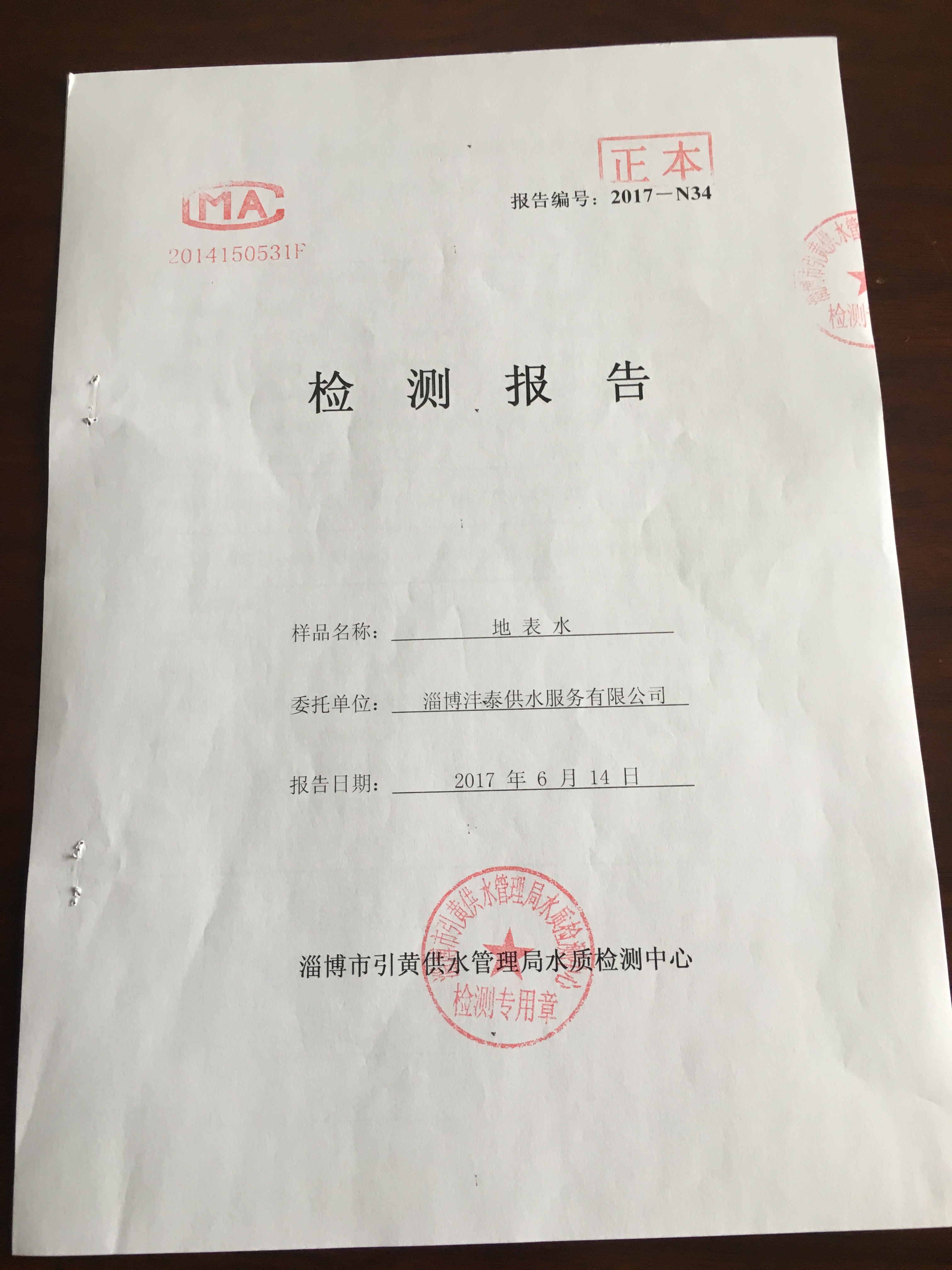 淄博灃泰供水服務(wù)有限公司地表水檢測(cè)月報(bào)表