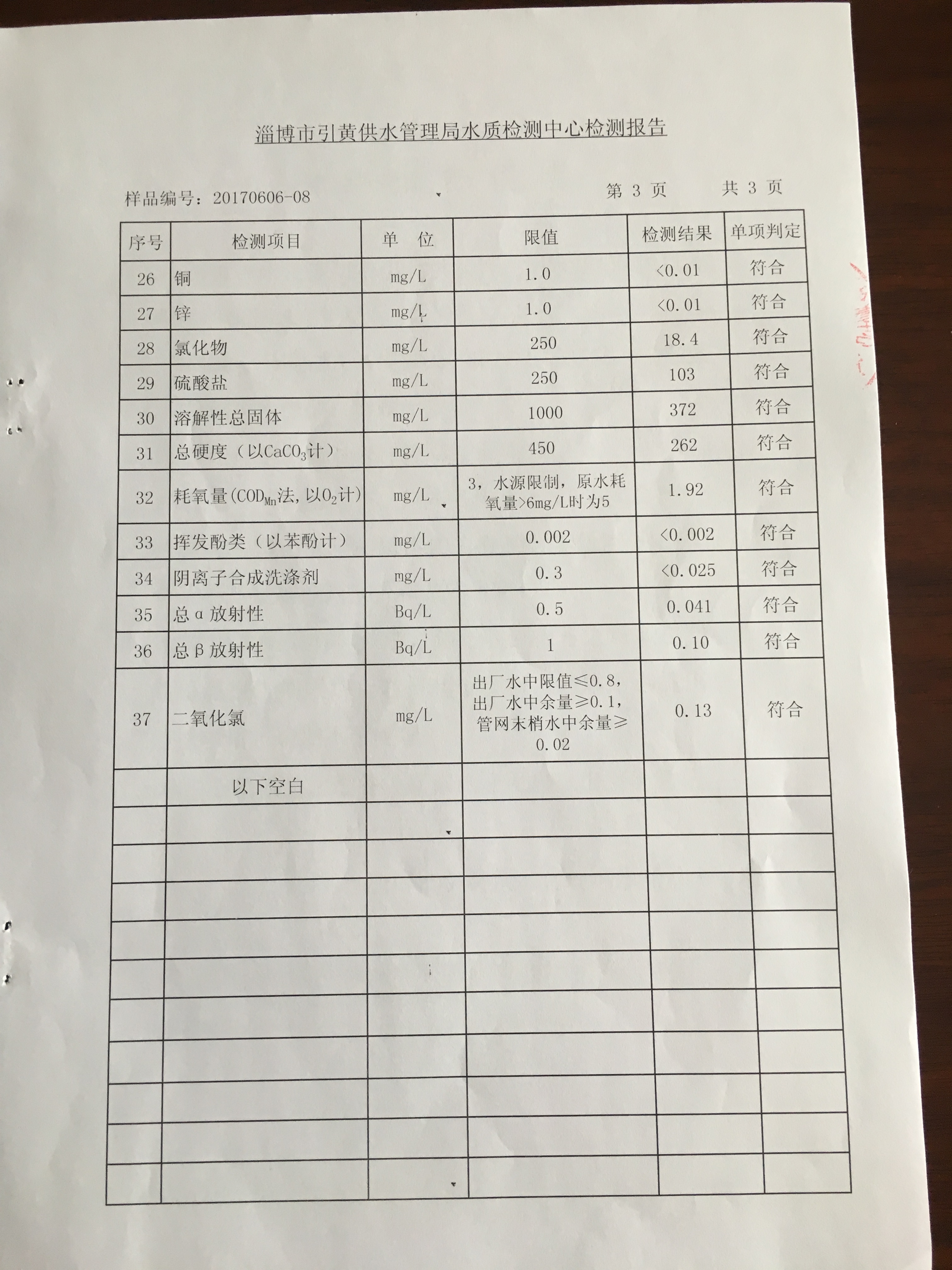 淄博灃泰供水服務(wù)有限公司出廠水檢測月報表