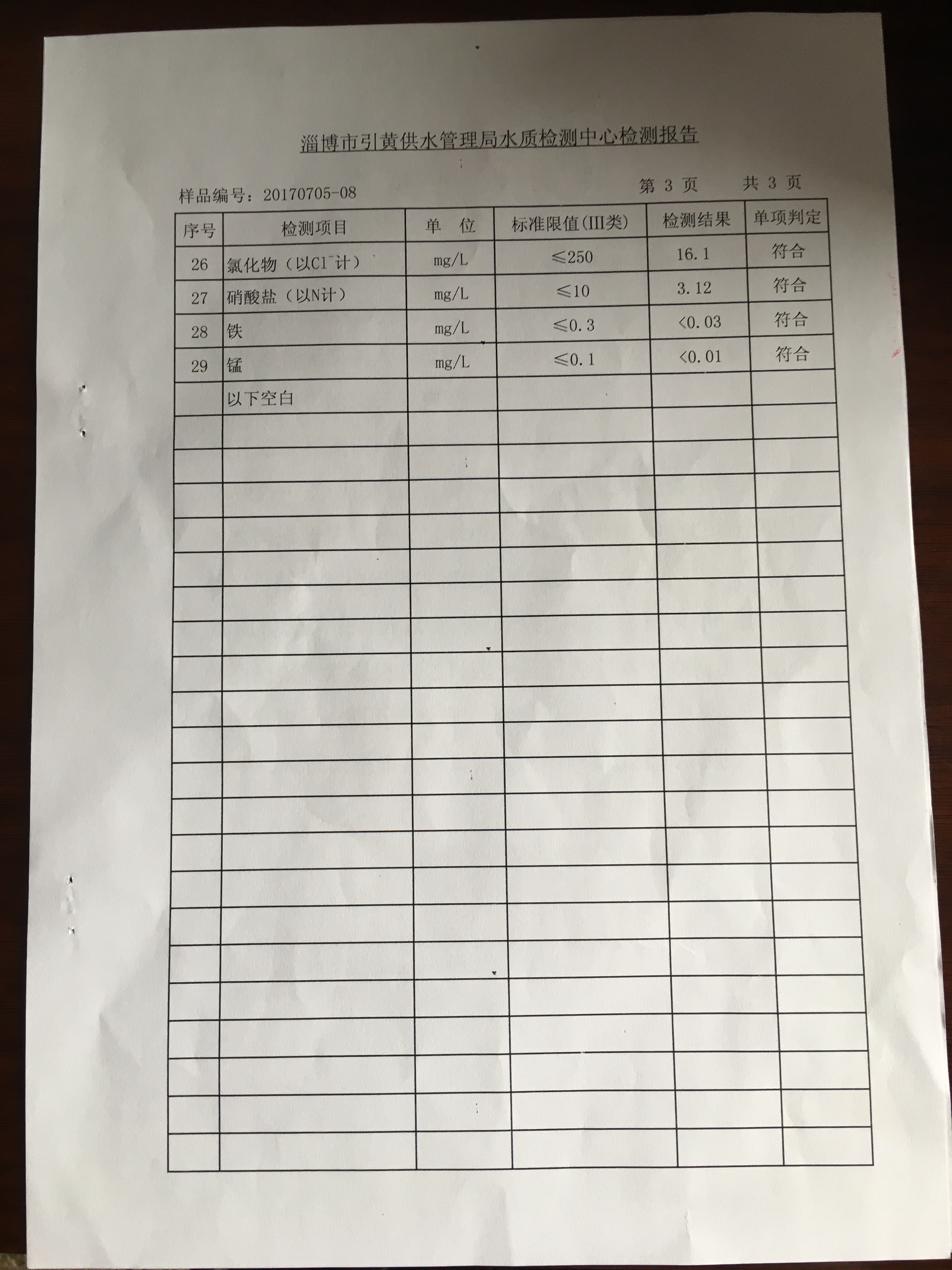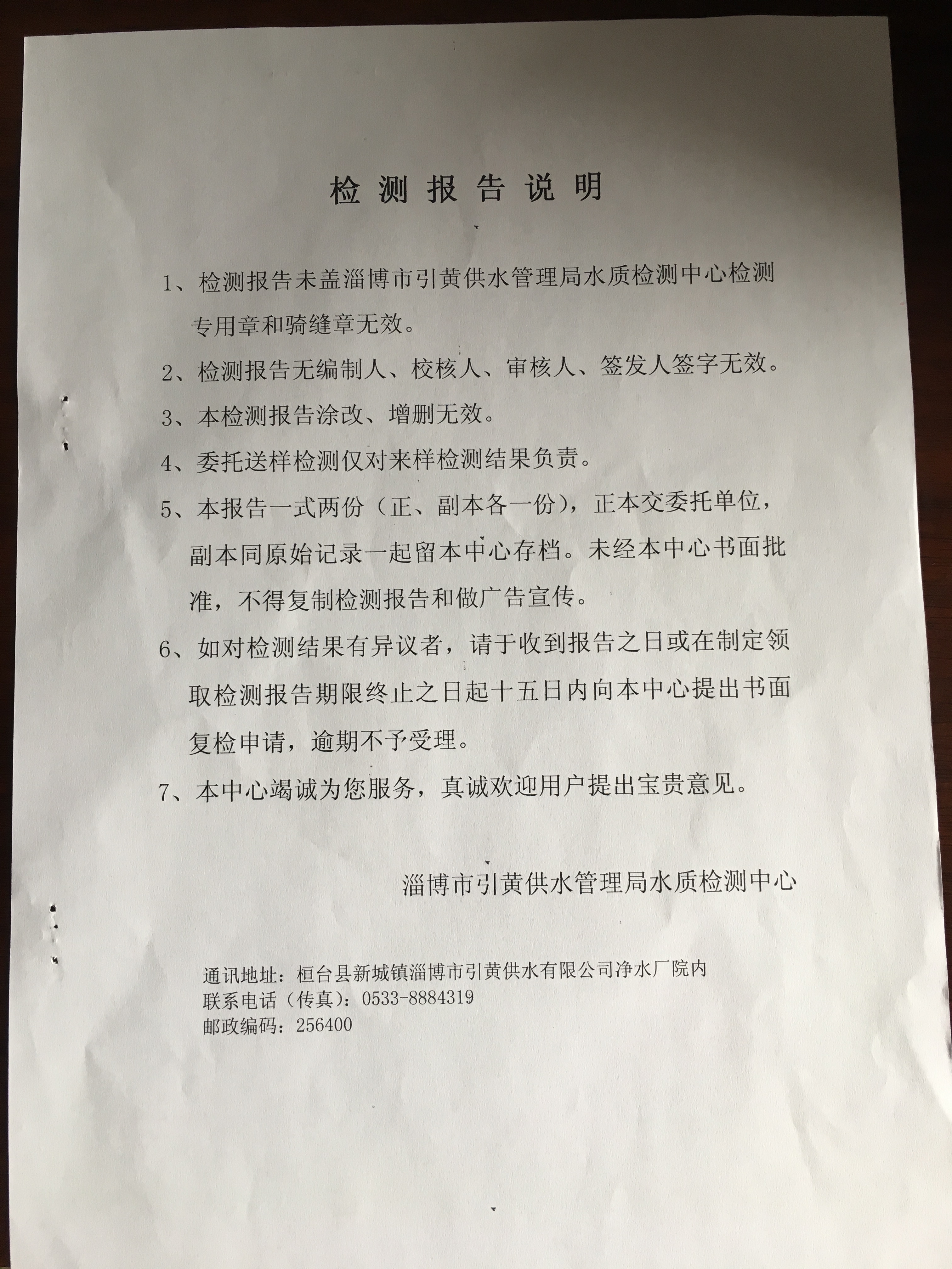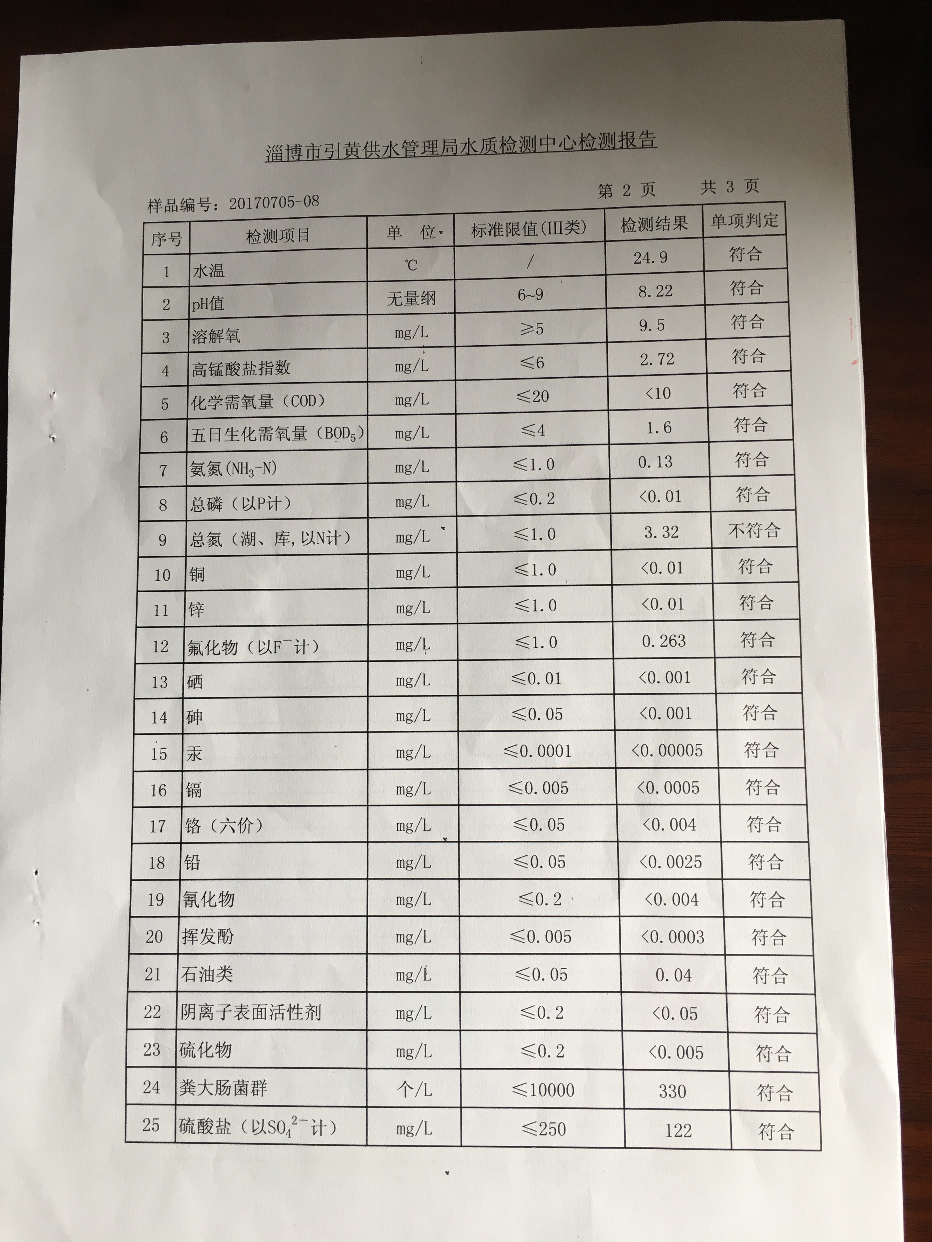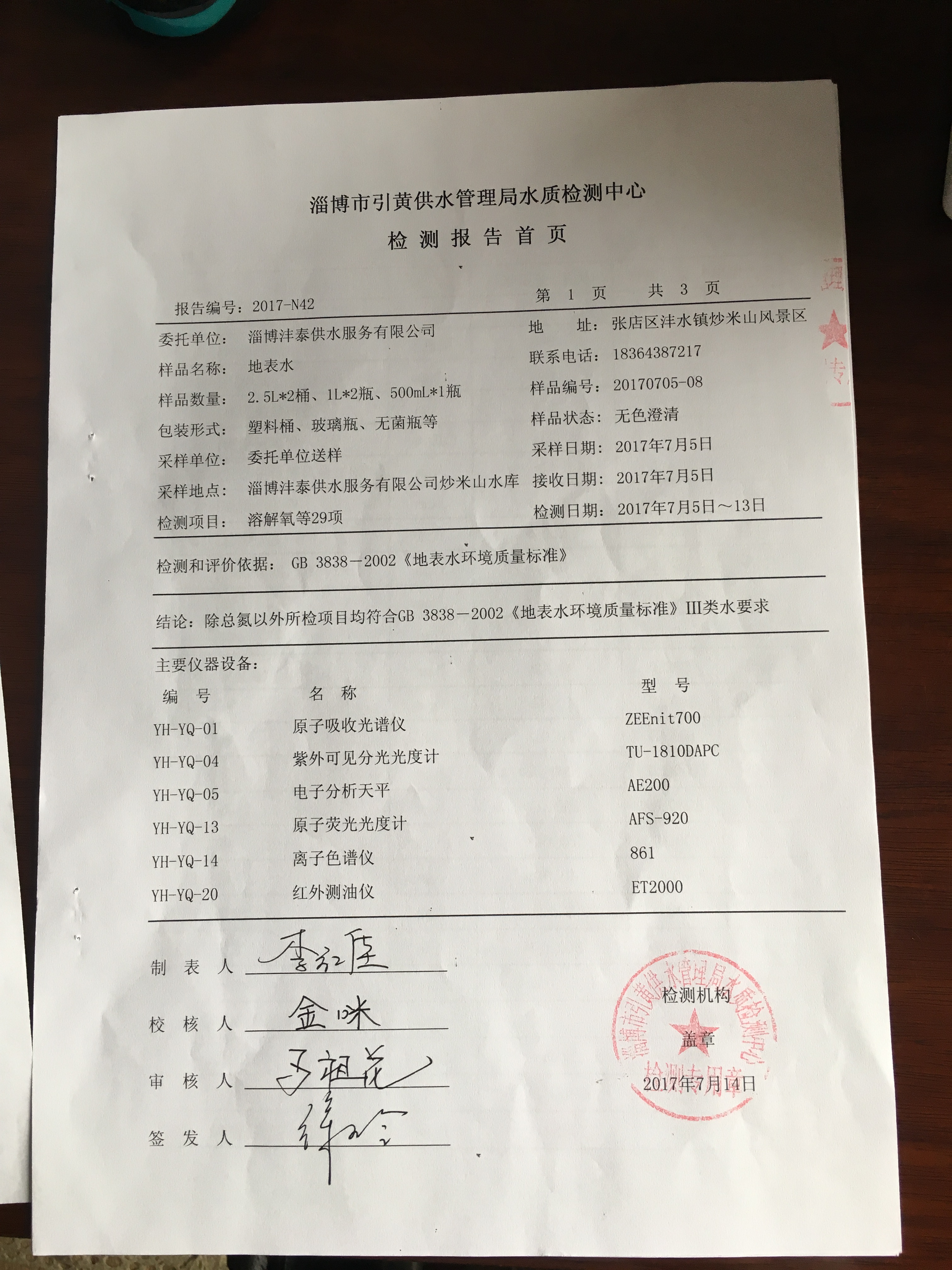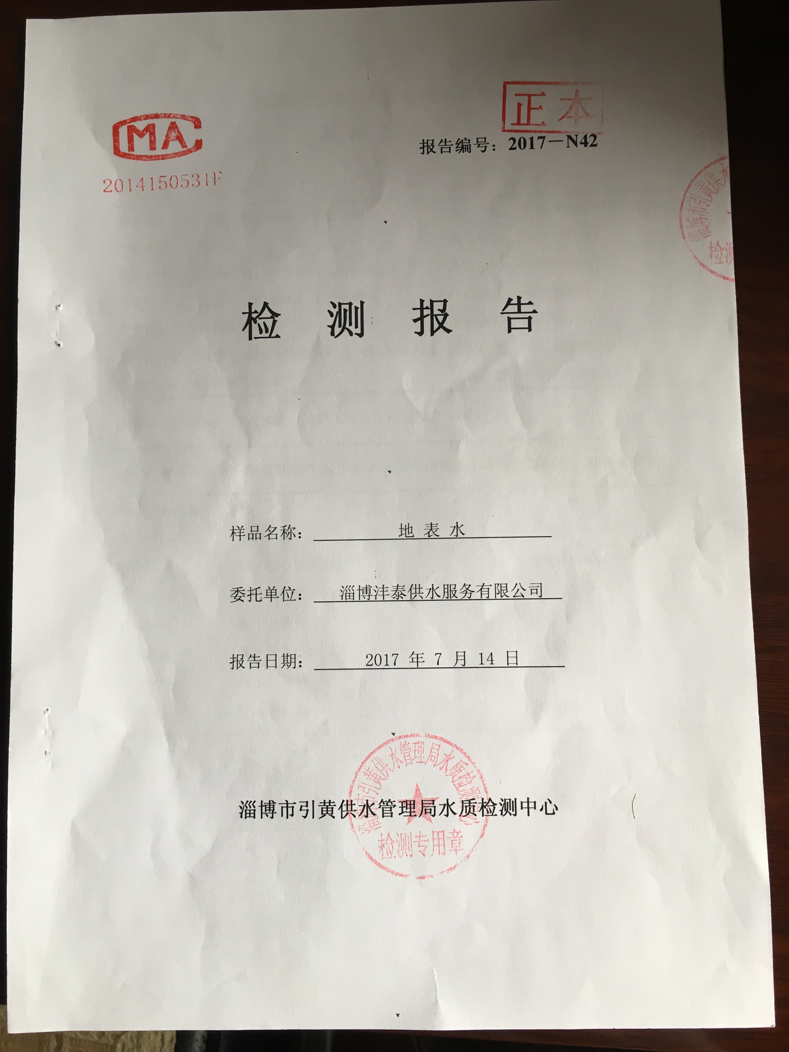 淄博灃泰供水服務(wù)有限公司地表水檢測月報表