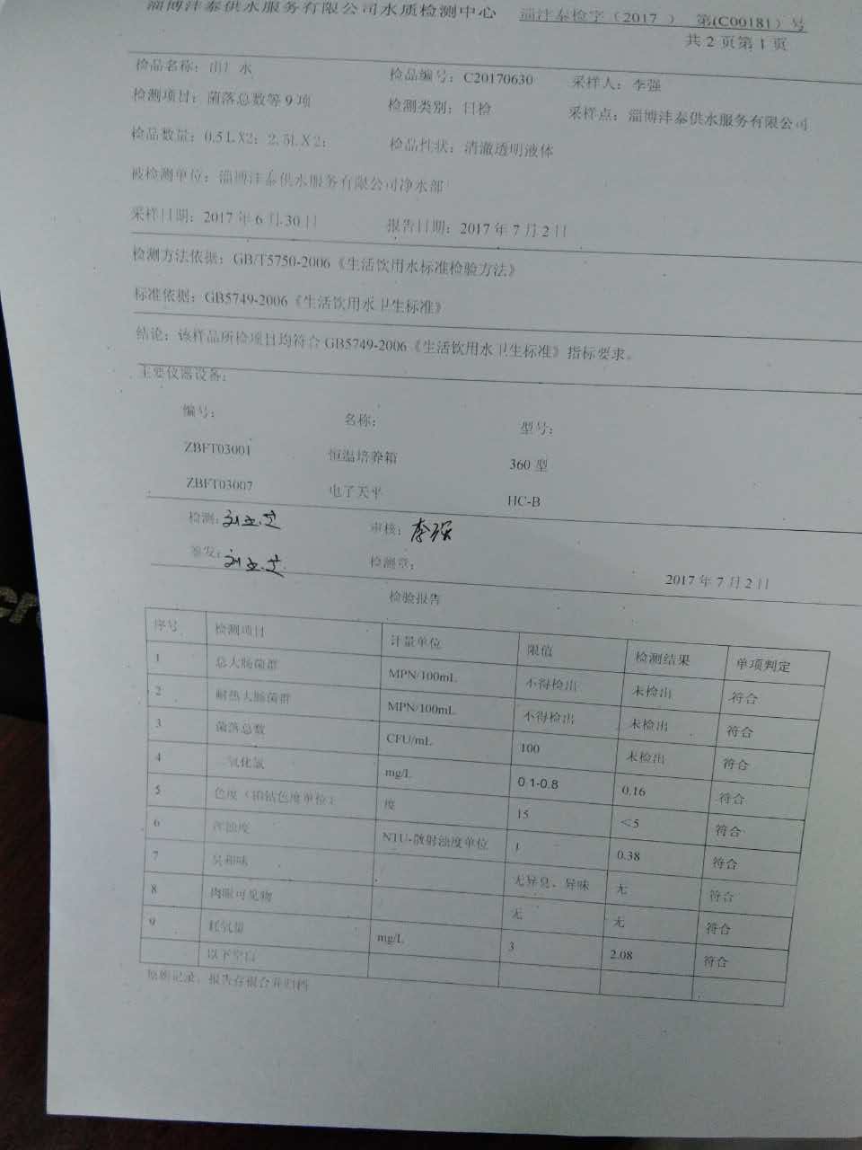 淄博灃泰供水服務(wù)有限公司出廠水檢測(cè)日?qǐng)?bào)表