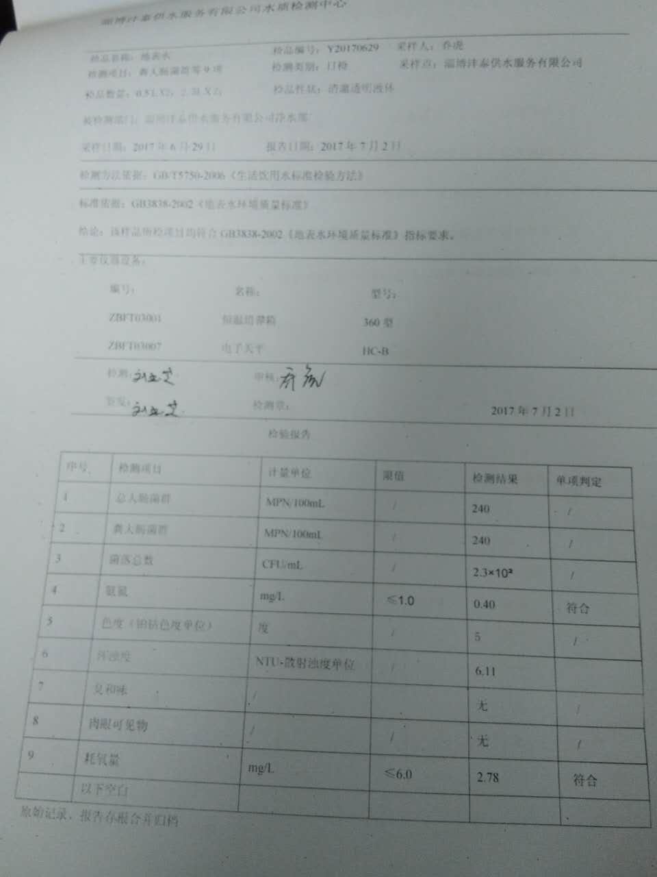 淄博灃泰供水服務(wù)有限公司地表水檢測日報表