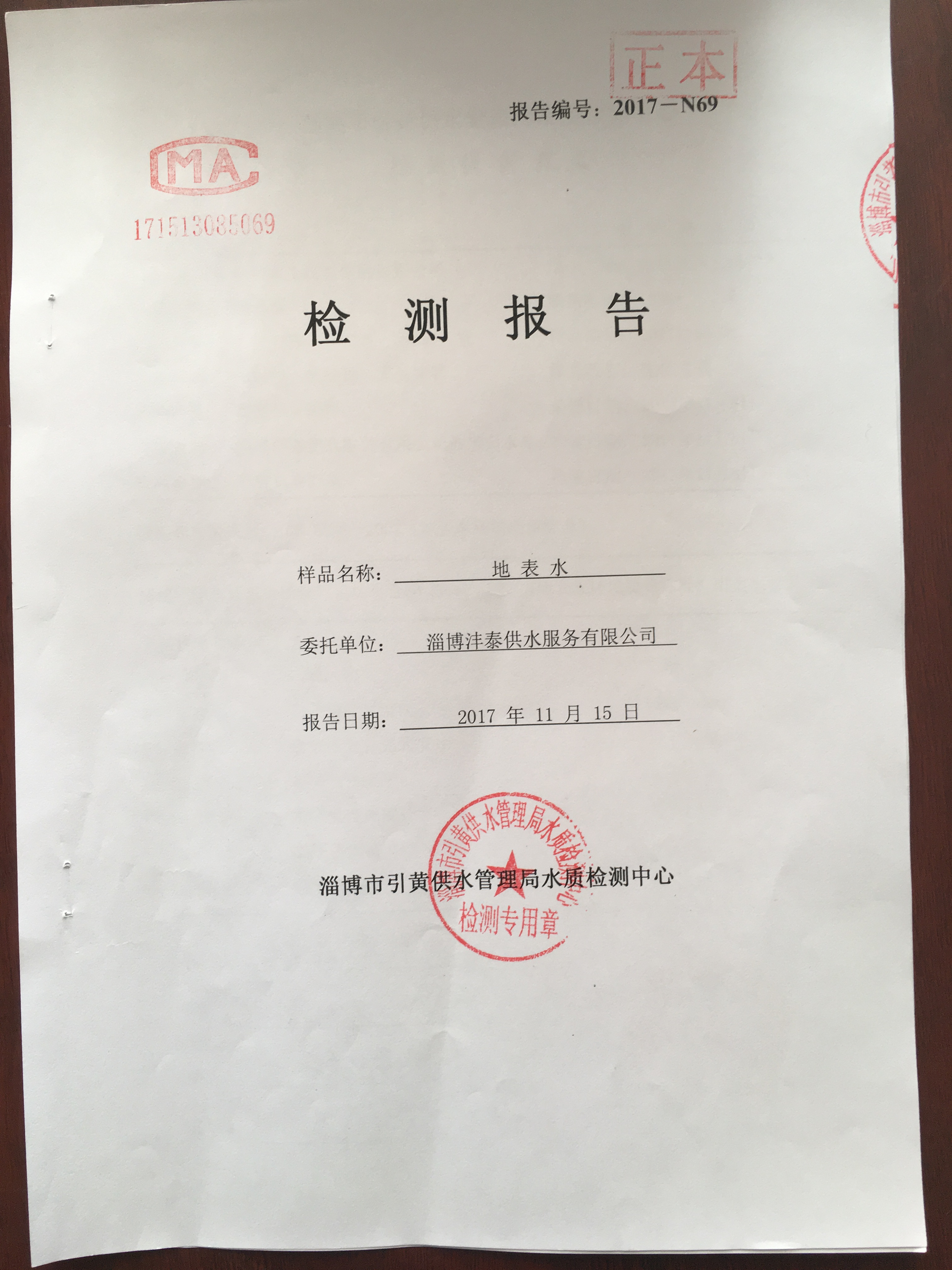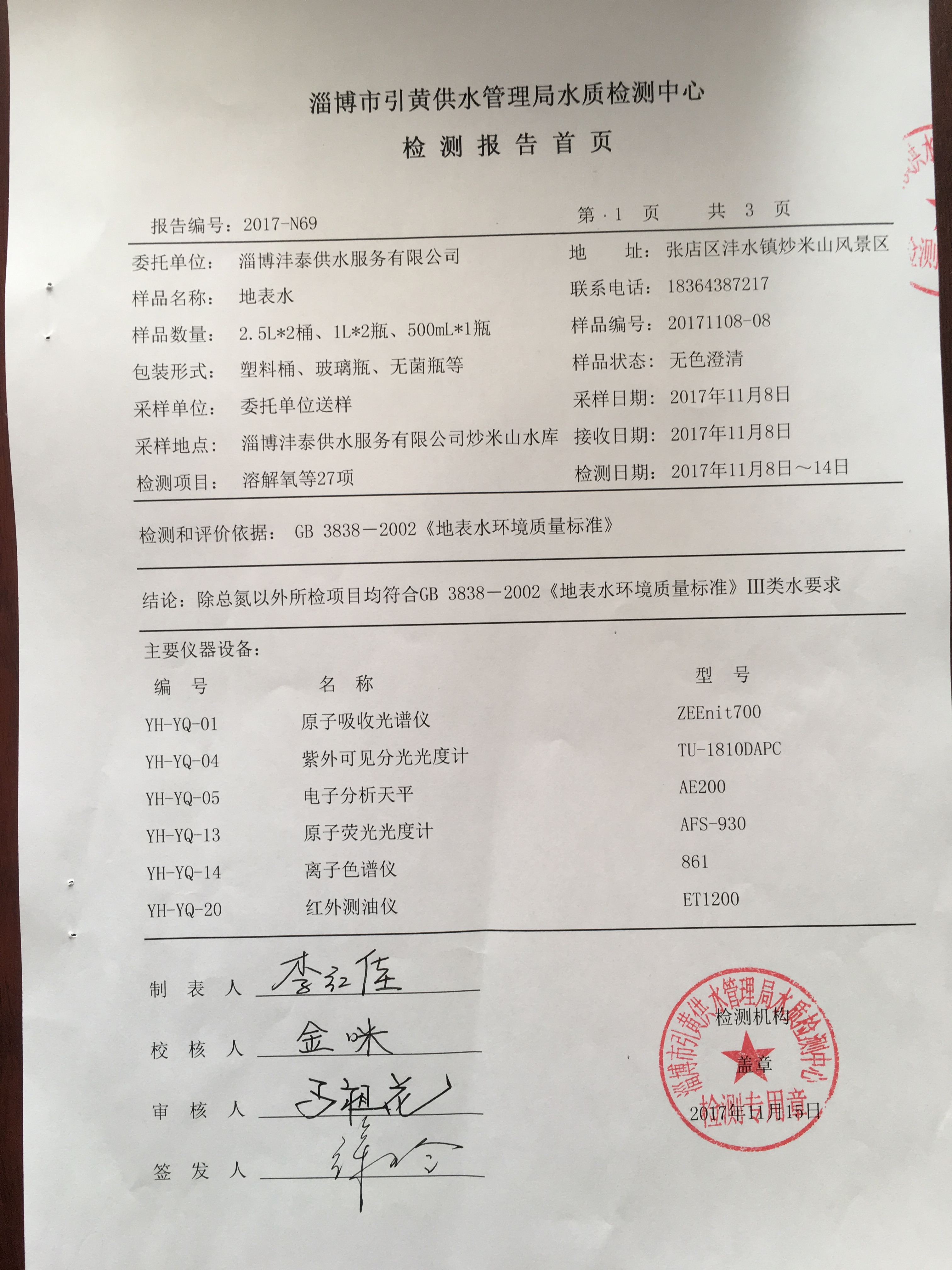 淄博灃泰供水服務(wù)有限公司地表水檢測月報表