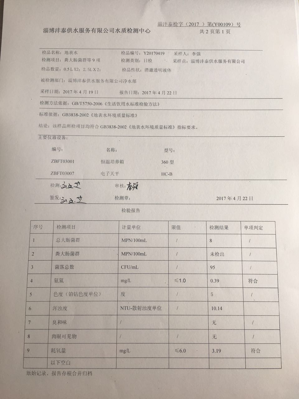 淄博灃泰供水服務(wù)有限公司地表水檢測日報表