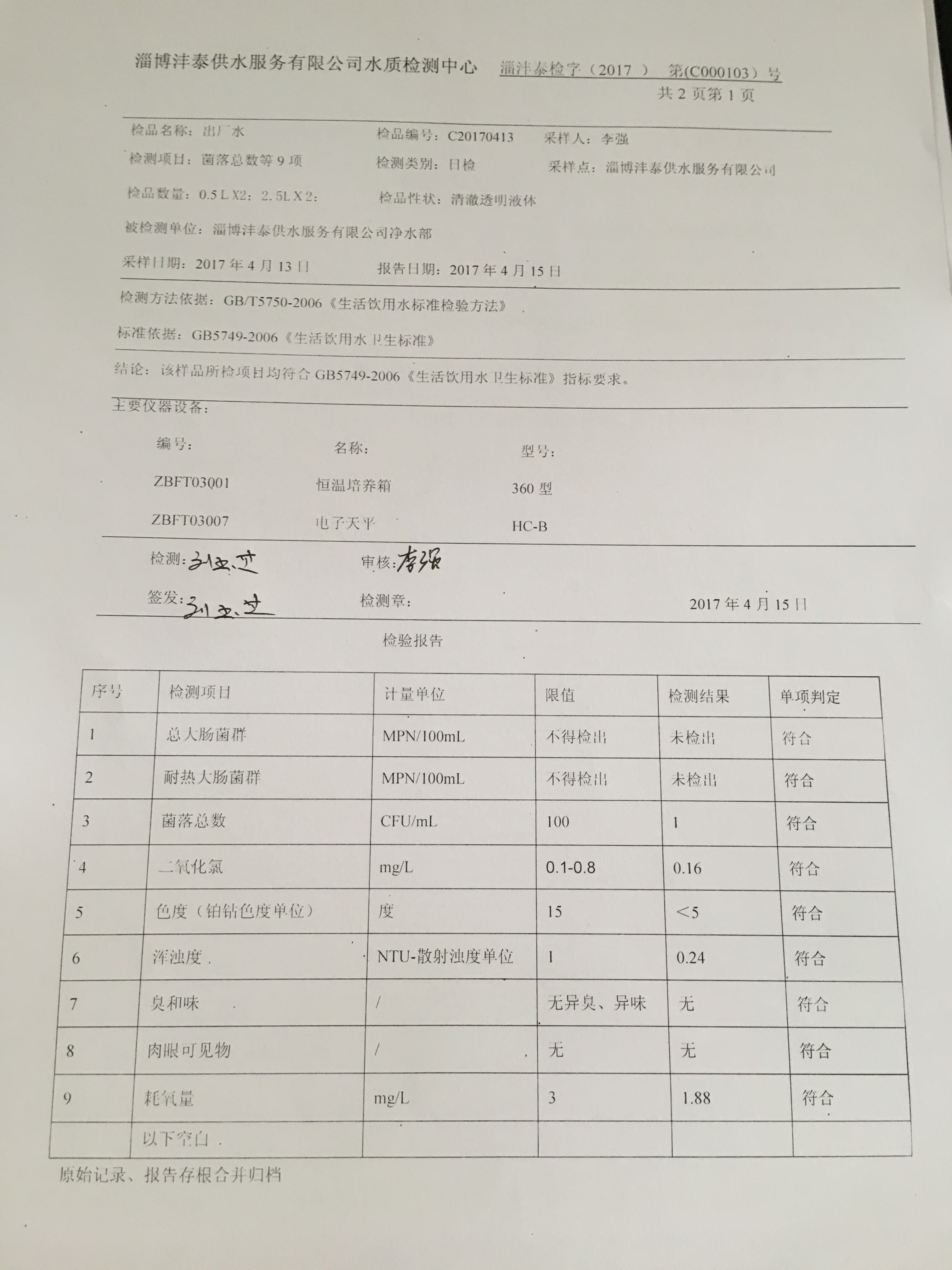 淄博灃泰供水服務(wù)有限公司水質(zhì)檢測(cè)日?qǐng)?bào)表