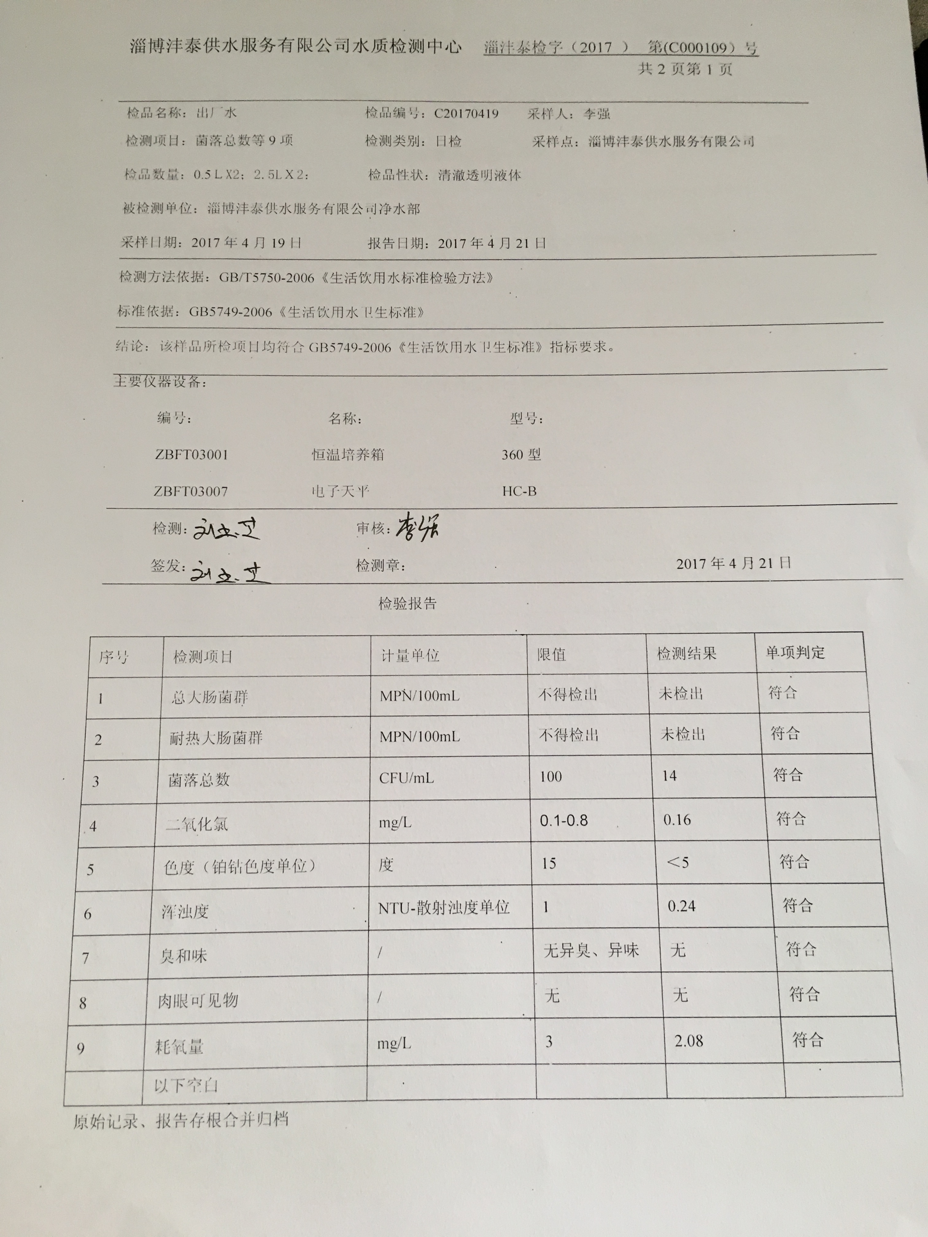 淄博灃泰供水服務(wù)有限公司水質(zhì)檢測(cè)日?qǐng)?bào)表
