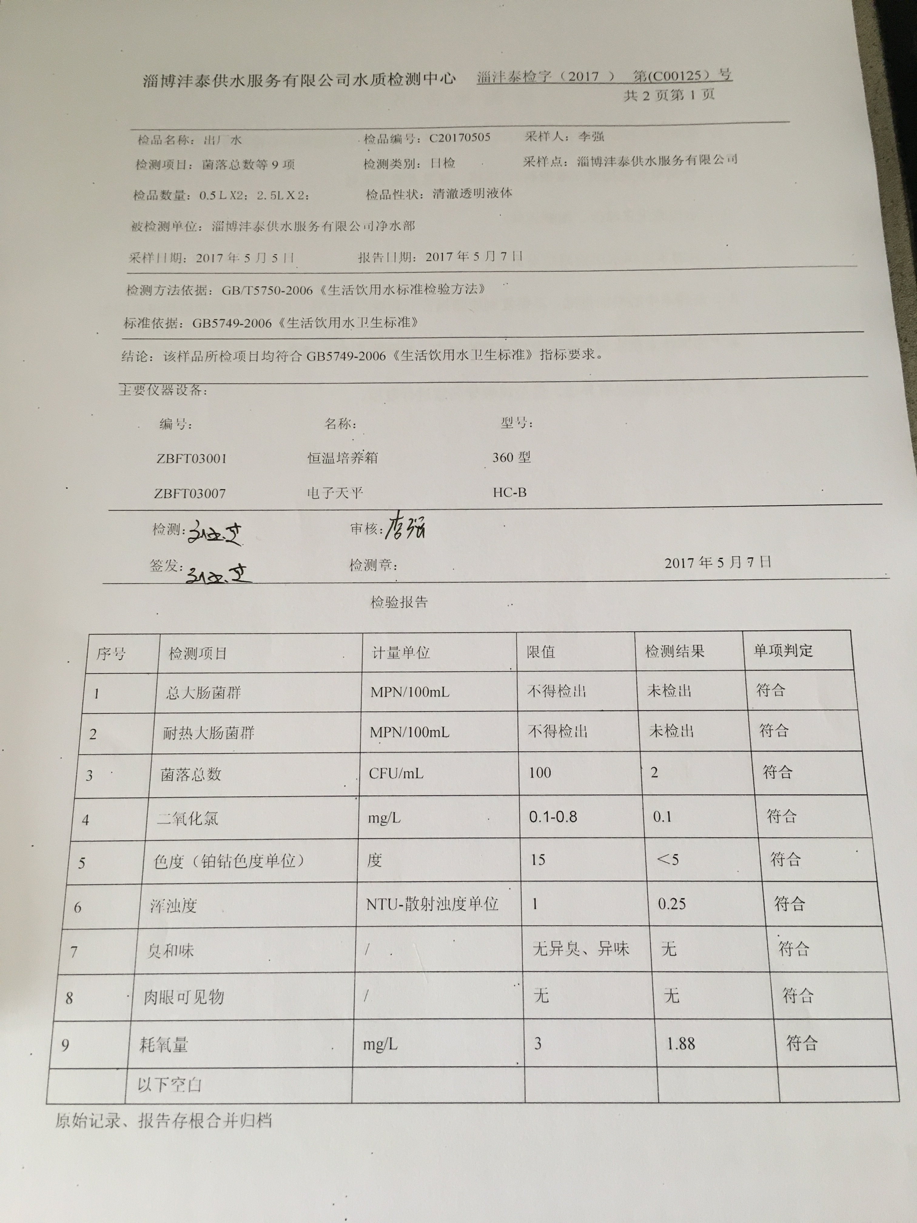 淄博灃泰供水服務(wù)有限公司水質(zhì)檢測日報(bào)表