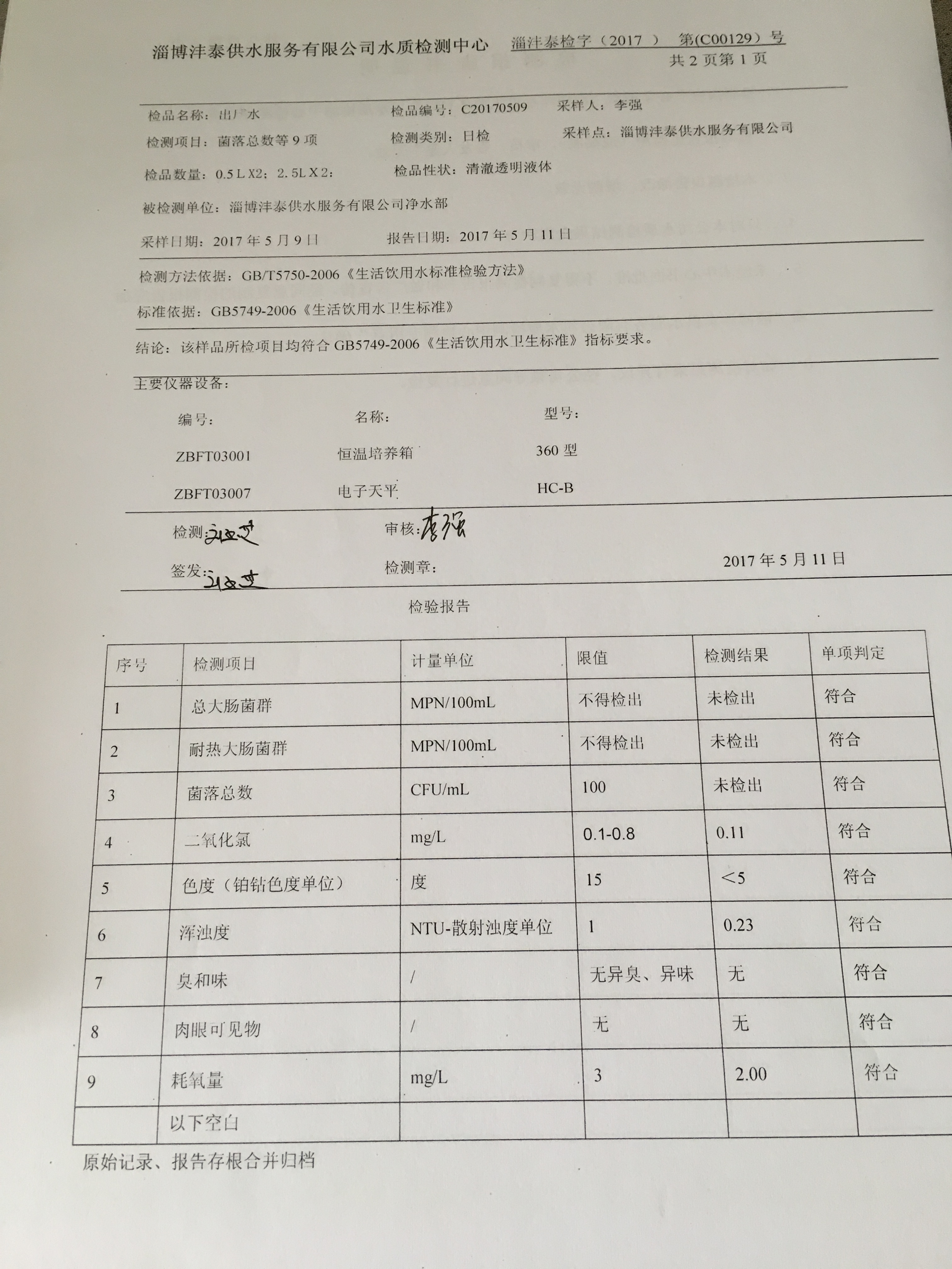 淄博灃泰供水服務(wù)有限公司水質(zhì)檢測日報表