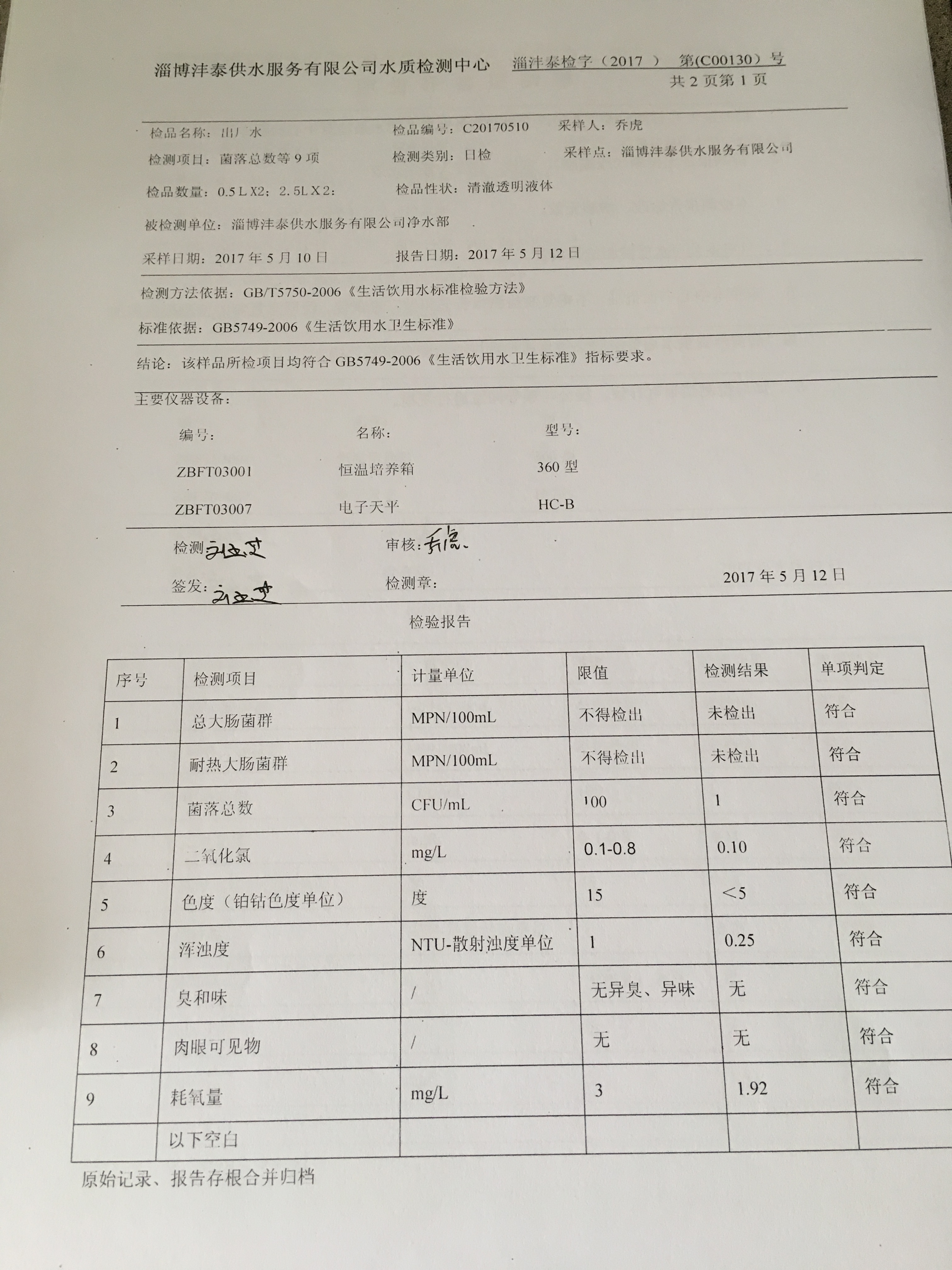淄博灃泰供水服務(wù)有限公司水質(zhì)檢測(cè)日?qǐng)?bào)表