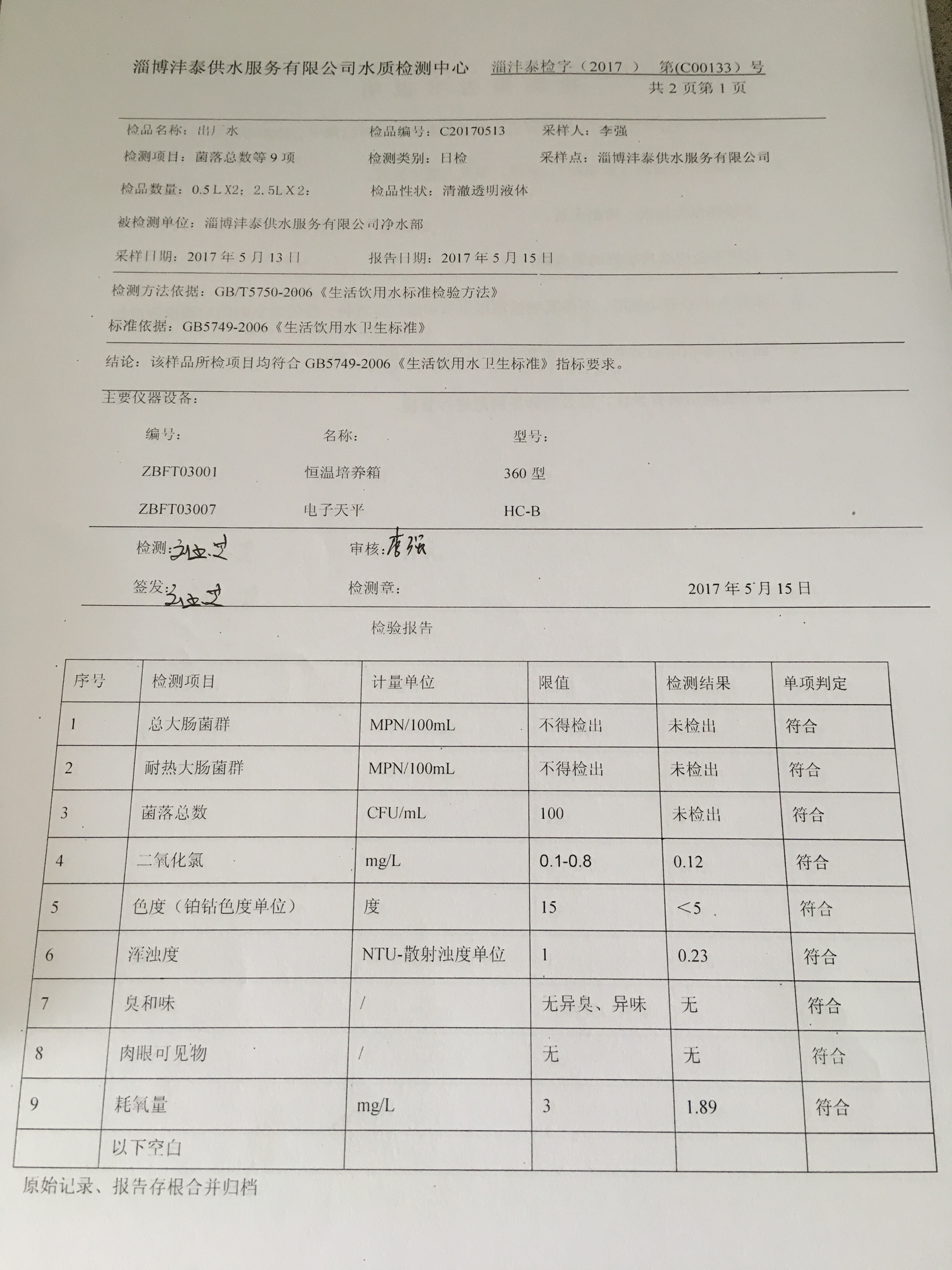 淄博灃泰供水服務(wù)有限公司水質(zhì)檢測日報表